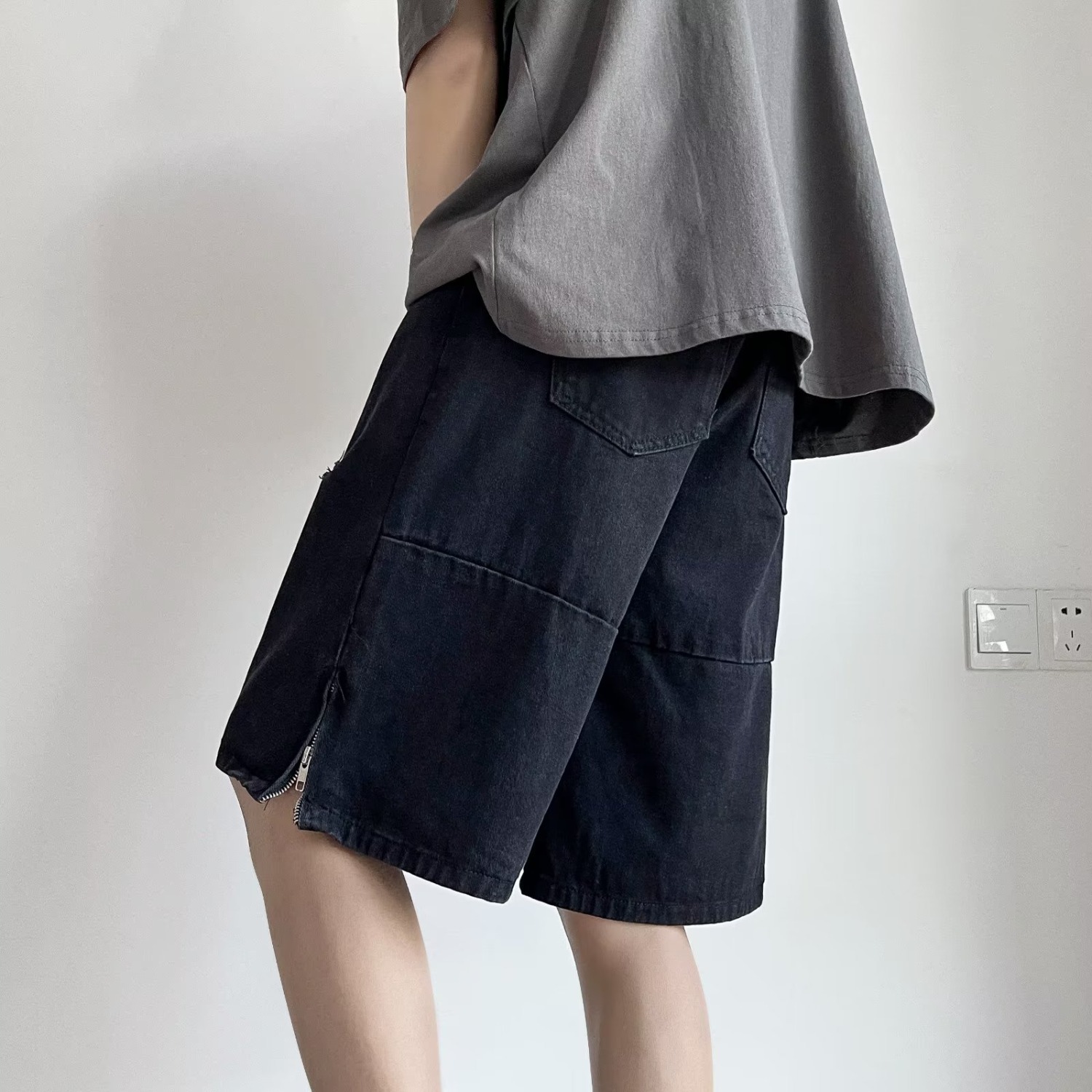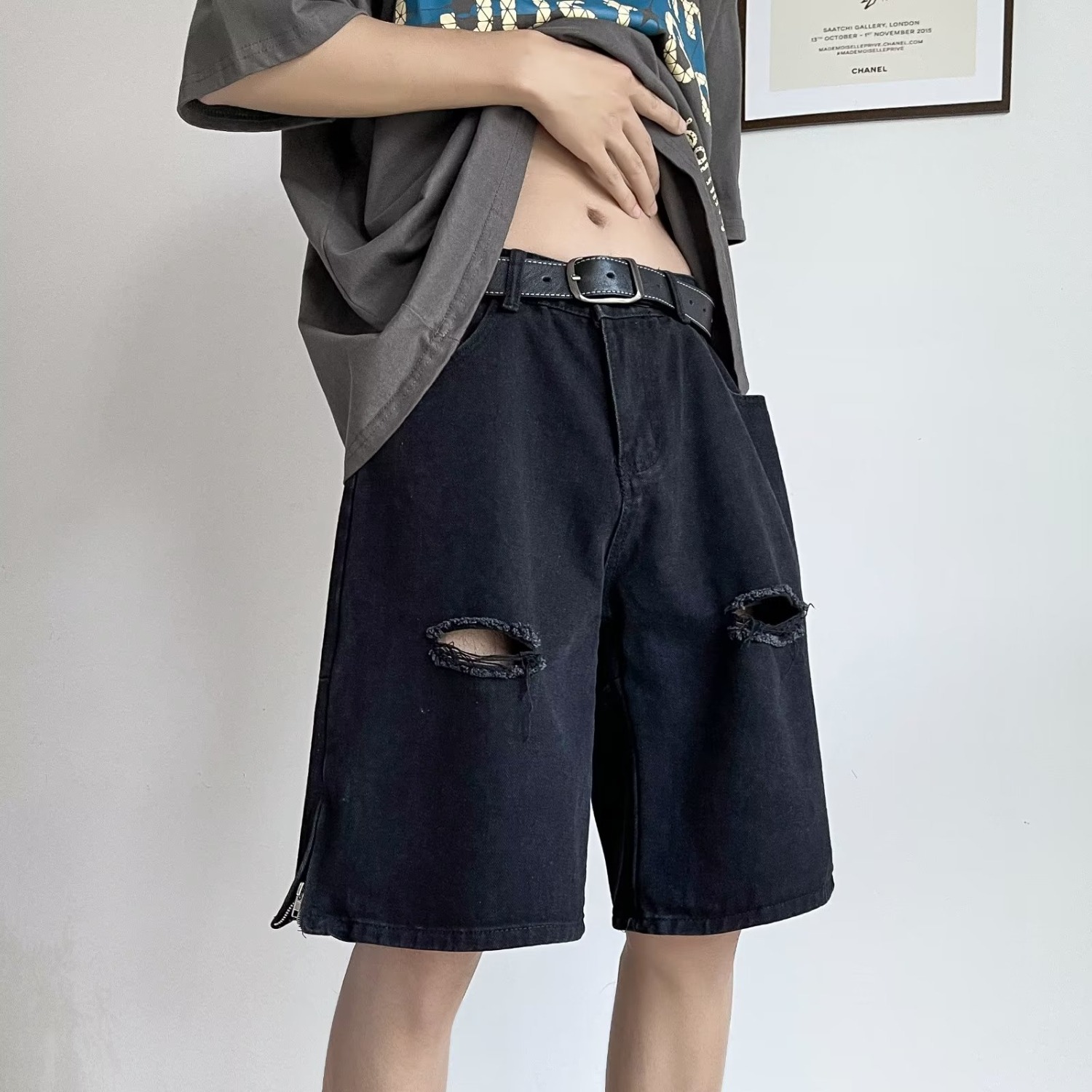 남성용 찢어진 데님 반바지 여름 아메리칸 하이 스트리트 바이브 5부 팬츠 트렌디하고 핸섬한 지퍼 슬릿 캐주얼 팬츠스토어 가기