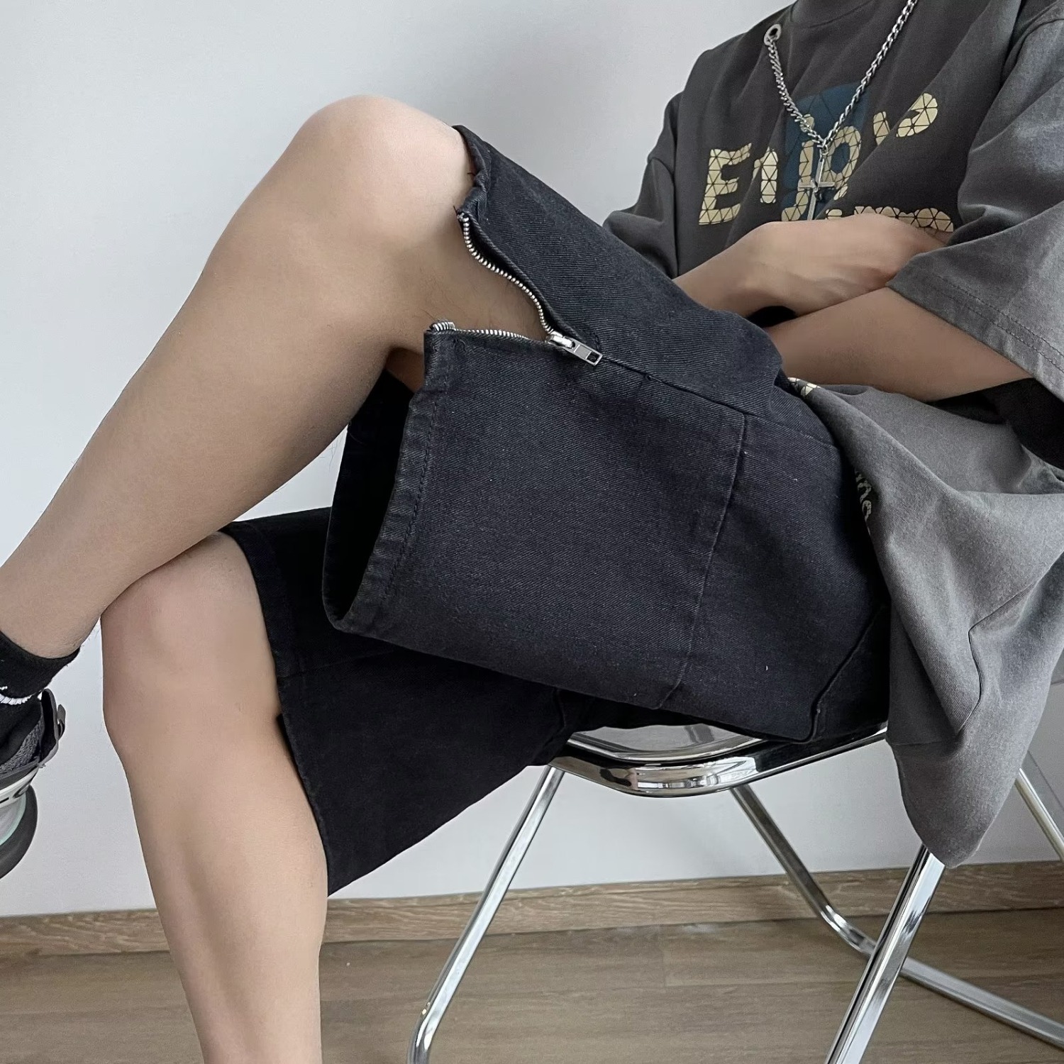 남성용 찢어진 데님 반바지 여름 아메리칸 하이 스트리트 바이브 5부 팬츠 트렌디하고 핸섬한 지퍼 슬릿 캐주얼 팬츠