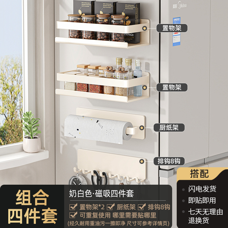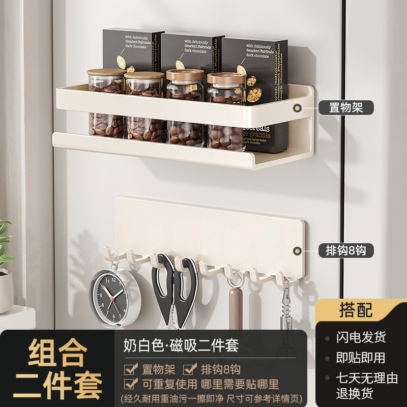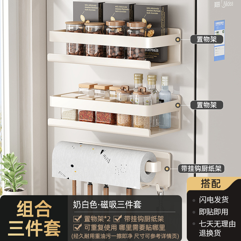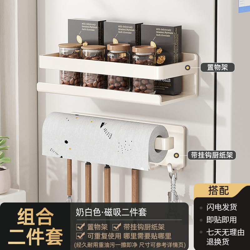 • 밀크화이트-마그네틱 스타일丨럭셔리 3종세트A [수납선반*2+후크부착 키친페이퍼홀더]