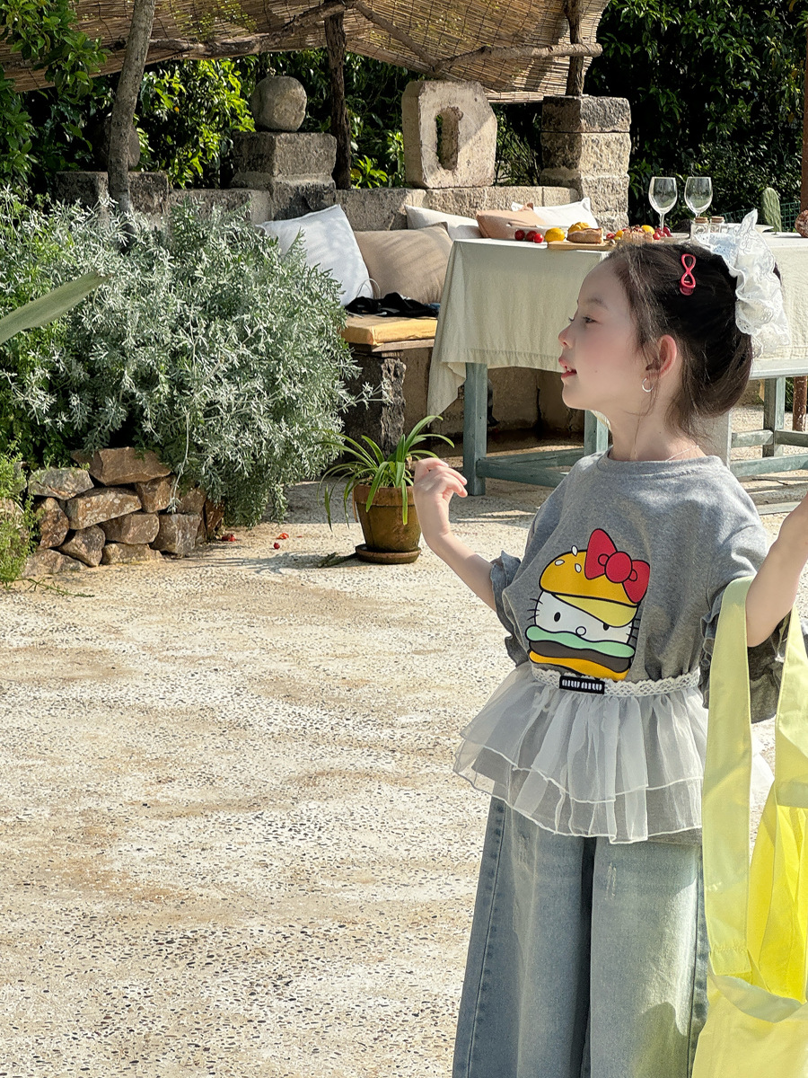 유유 프린세스 걸스 여름 틈새 만화 인쇄 된 나무 귀 반팔 상단 어린이 중간 길이 느슨한 티셔츠