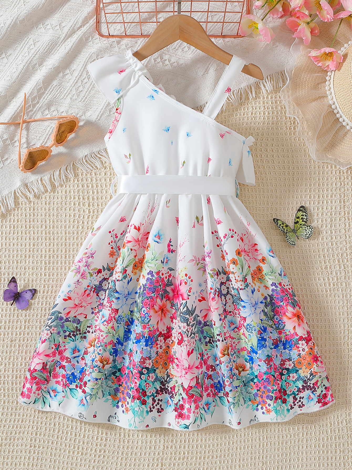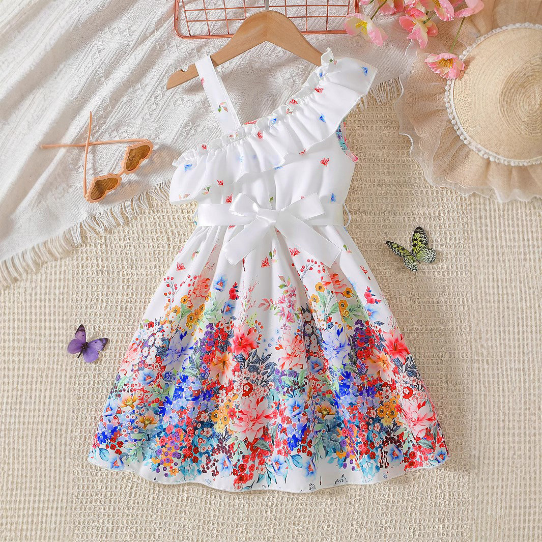 LS00062 국경 간 아동 의류 도매 소녀 흰색 비스듬한 어깨 멜빵 허리띠가있는 꽃 무늬 드레스