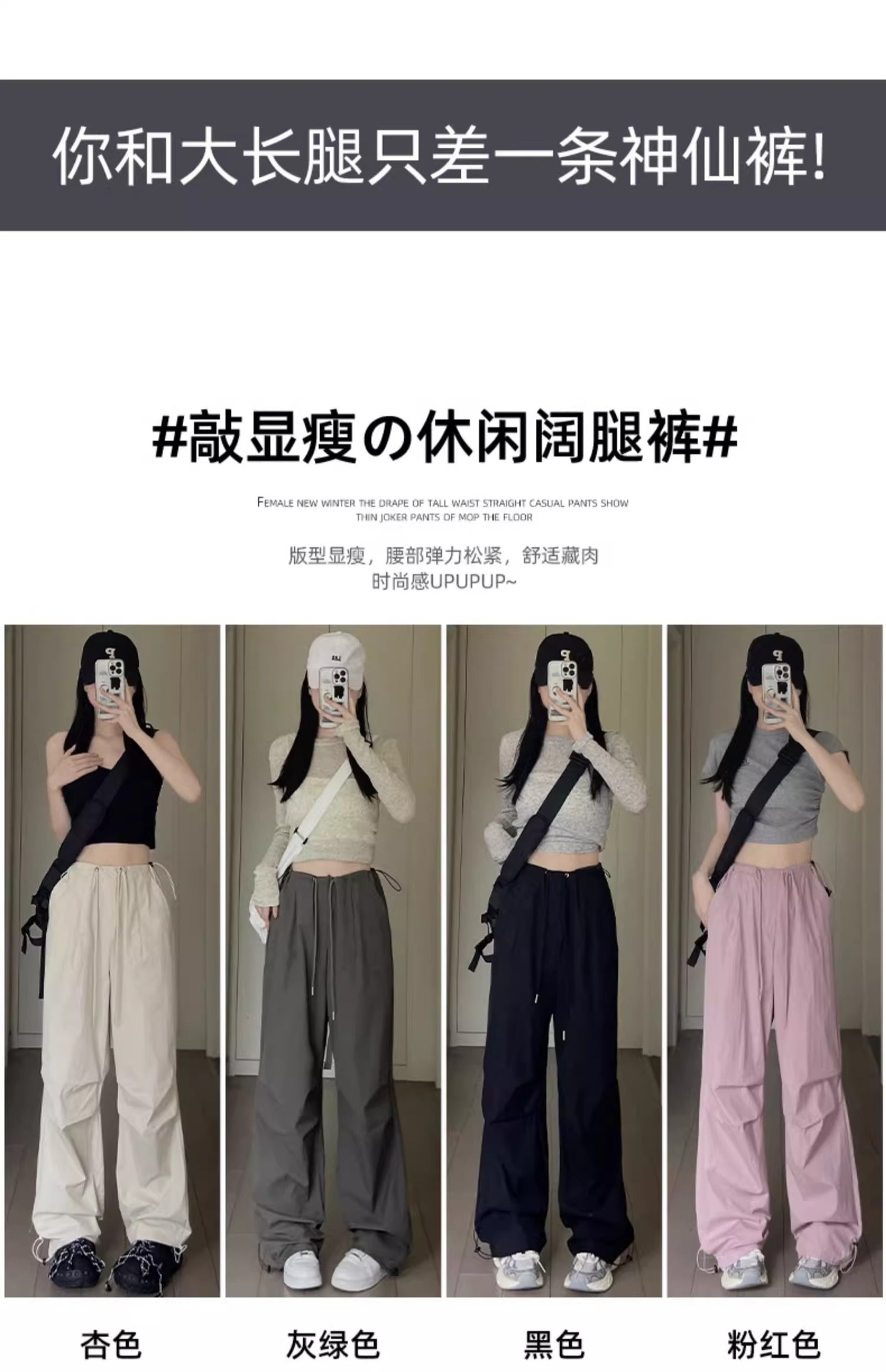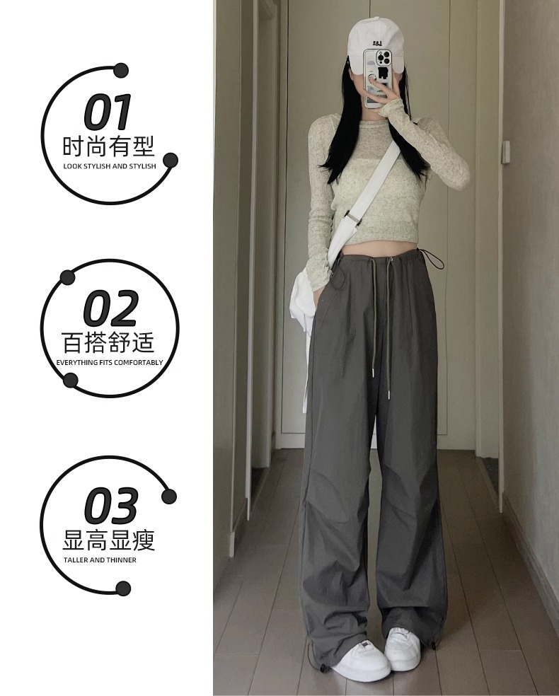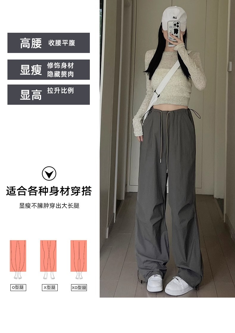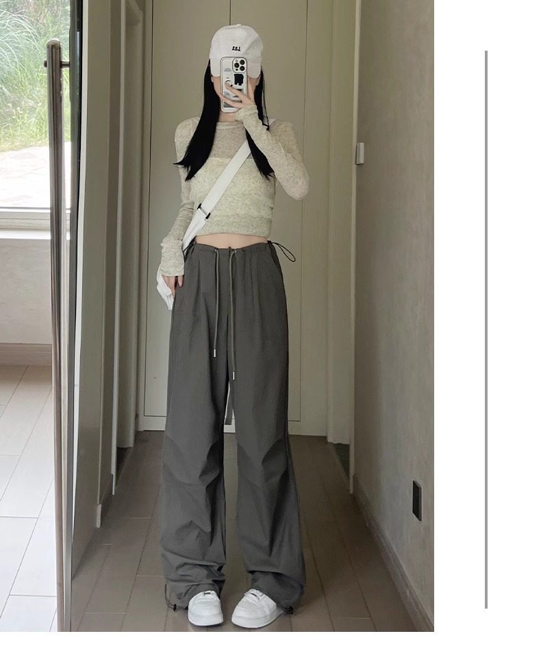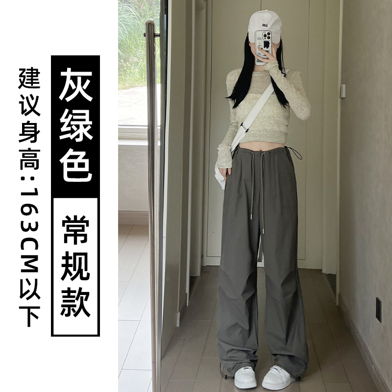 아메리칸 레트로 오버홀 여자 여름 높은 허리 넓은 다리 캐주얼 느슨한 슬리밍 카키 빠른 건조 슬리밍 스포츠 바지