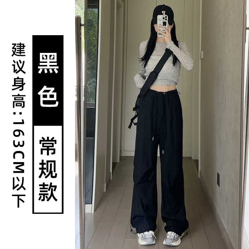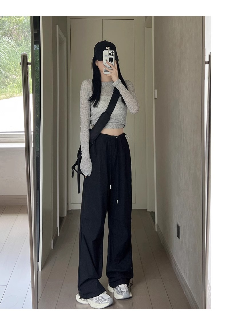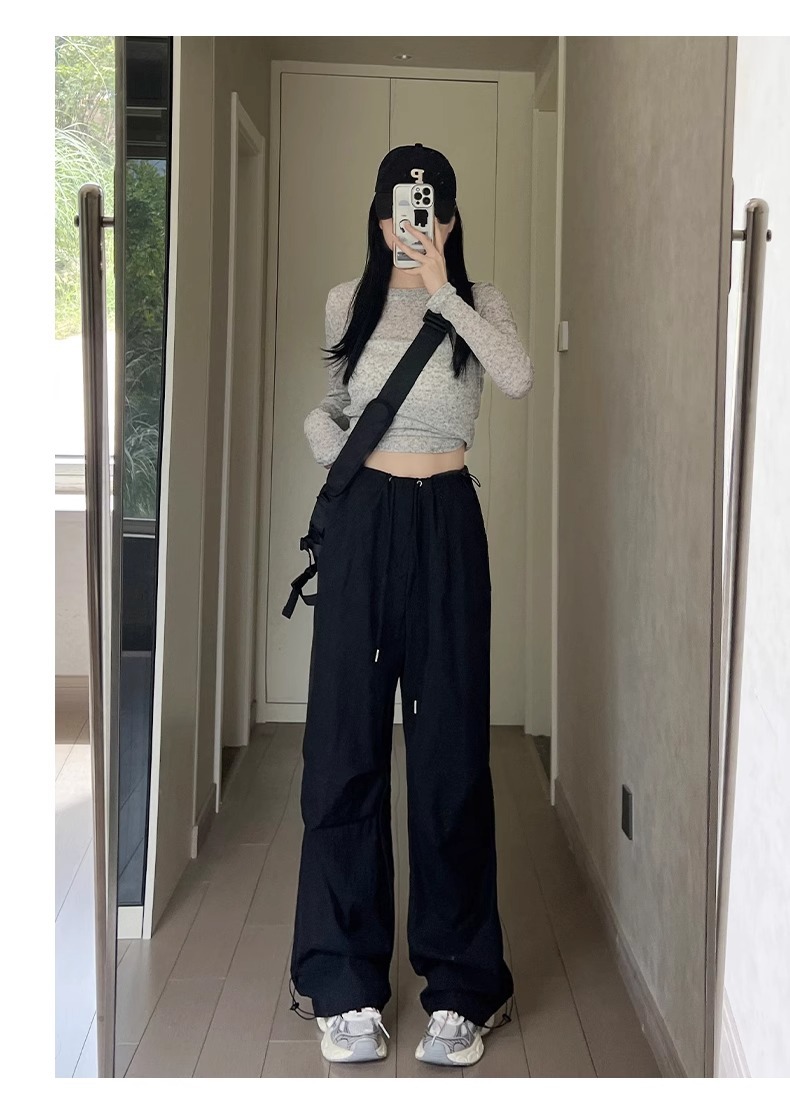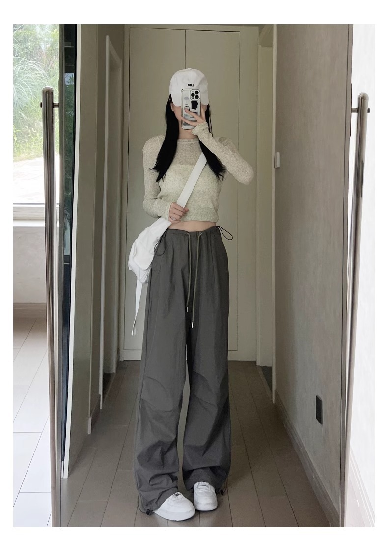 아메리칸 레트로 오버홀 여자 여름 높은 허리 넓은 다리 캐주얼 느슨한 슬리밍 카키 빠른 건조 슬리밍 스포츠 바지
