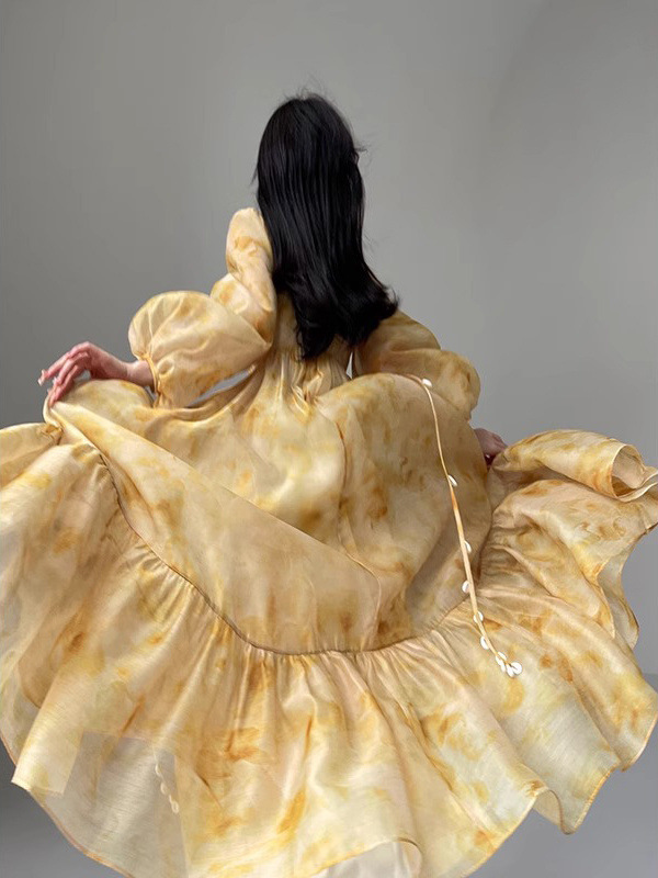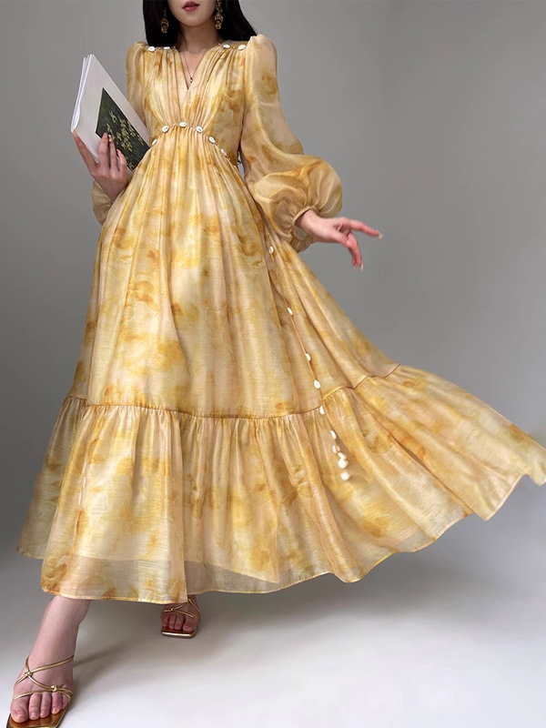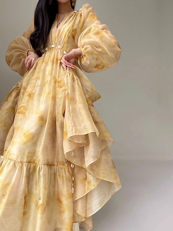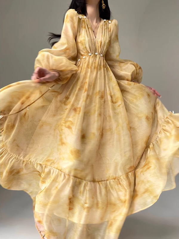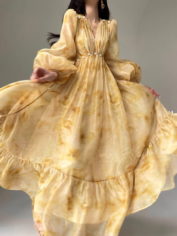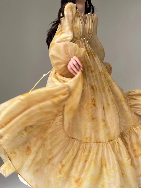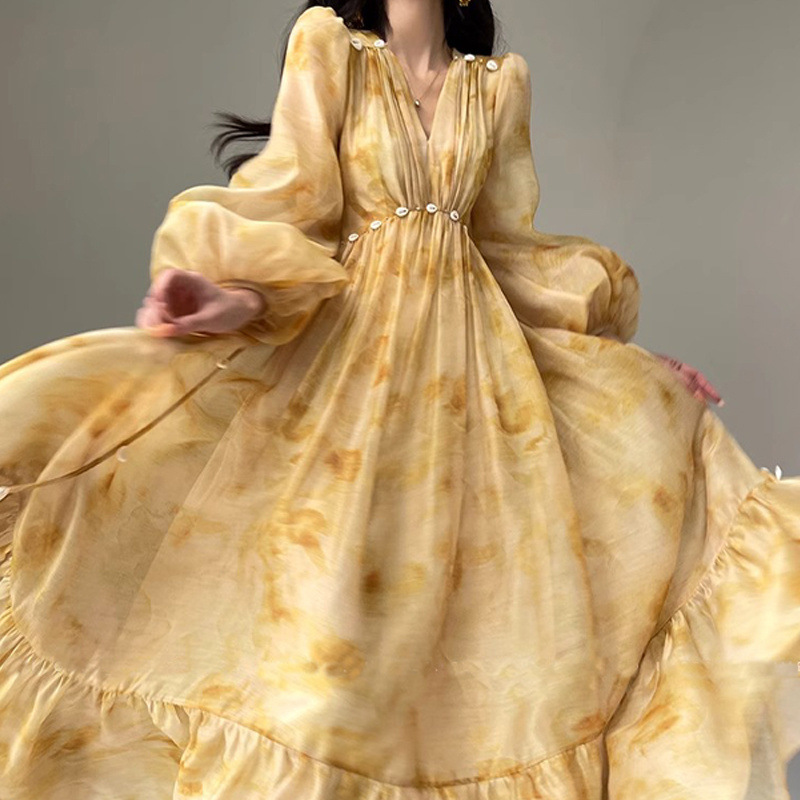 2025 프렌치 스머지 옐로우 긴팔 드레스 여름 해변 휴가 스타일 빅 스커트 롱 스커트스토어 가기