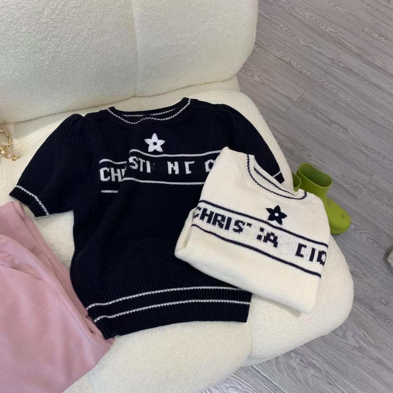 2023 여름 새로운 프랑스 틈새 디자이너 오각형 자카드 퍼프 슬리브 여성용 반팔 스웨터스토어 가기