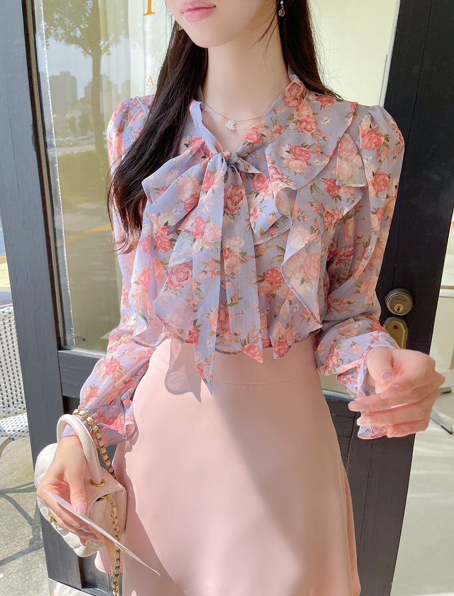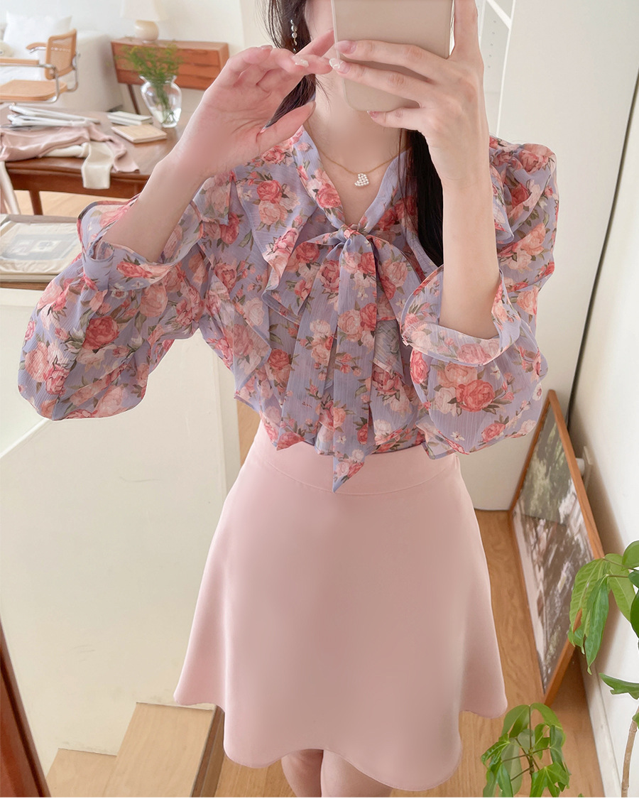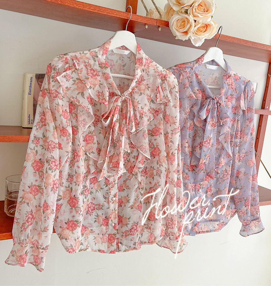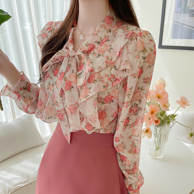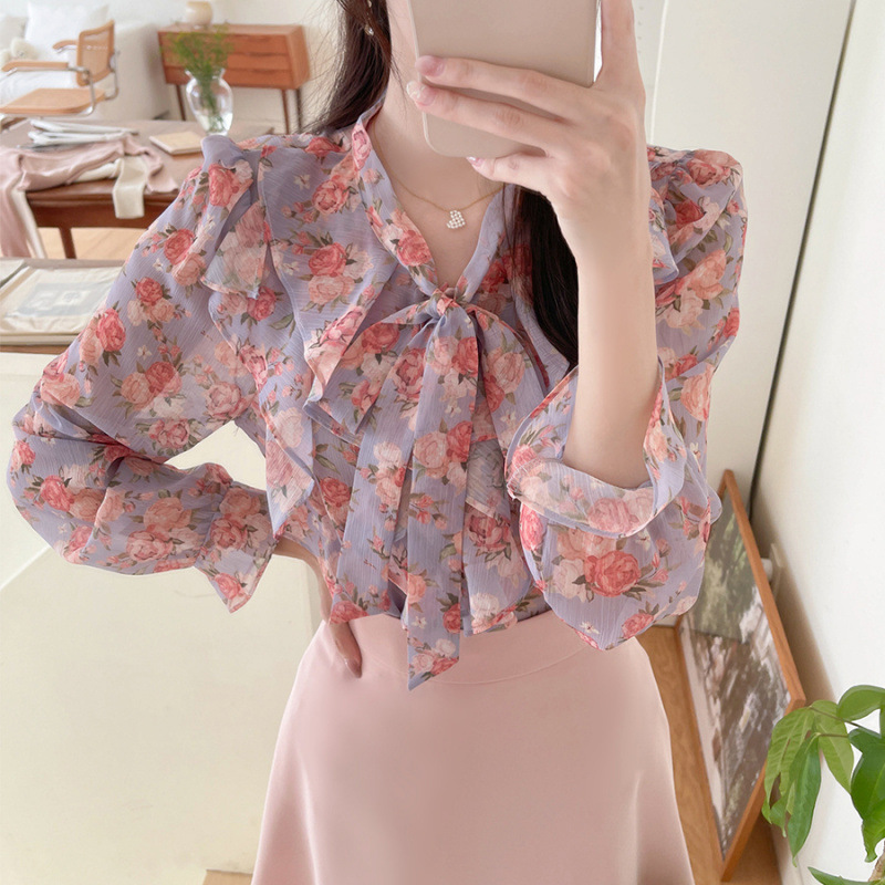 여름 V 넥 달콤한 신선한 우아한 꽃 쉬폰 셔츠 여성용 긴팔 활 셔츠 러플 얇은 루즈 탑