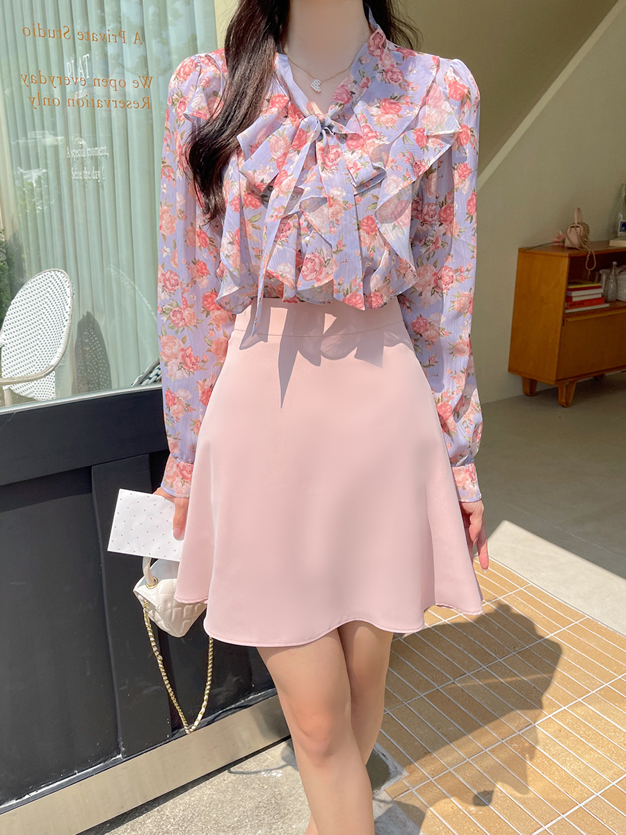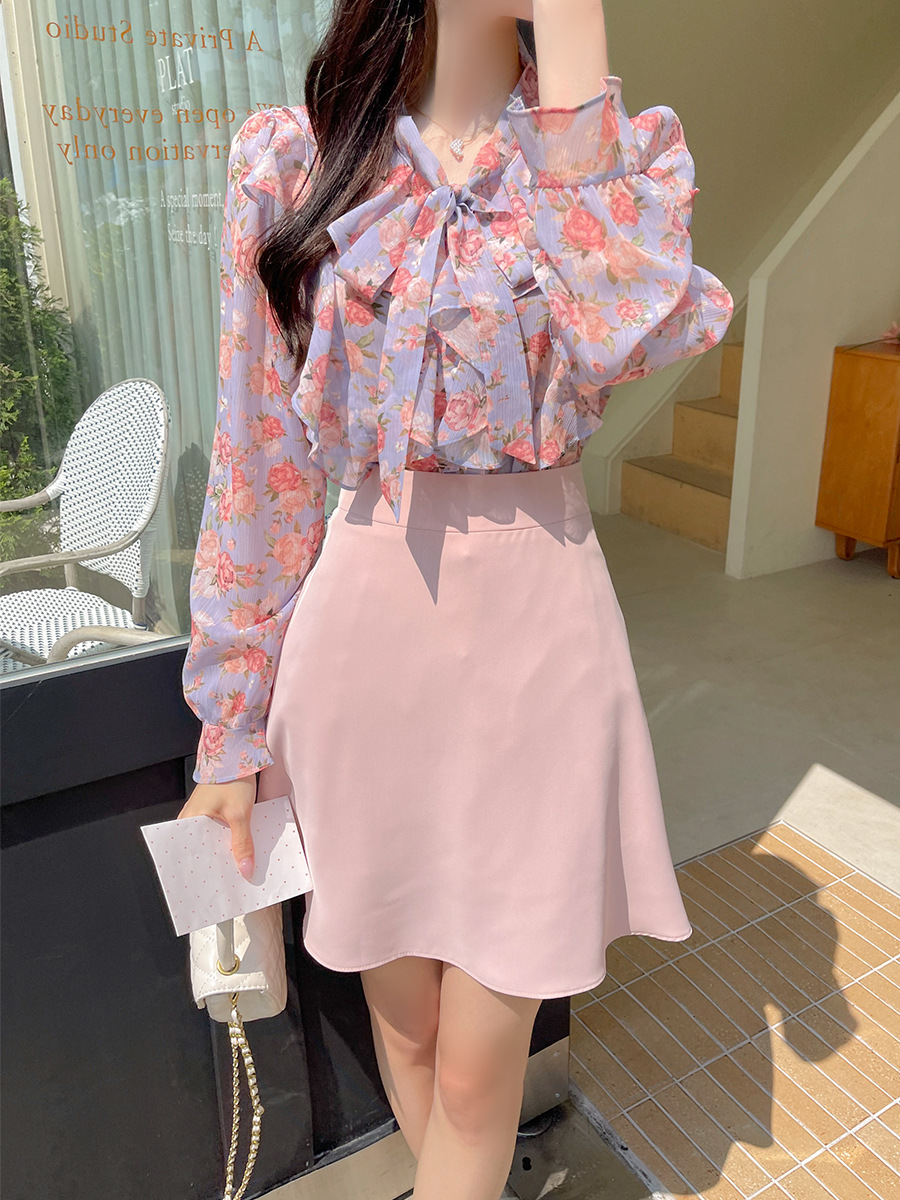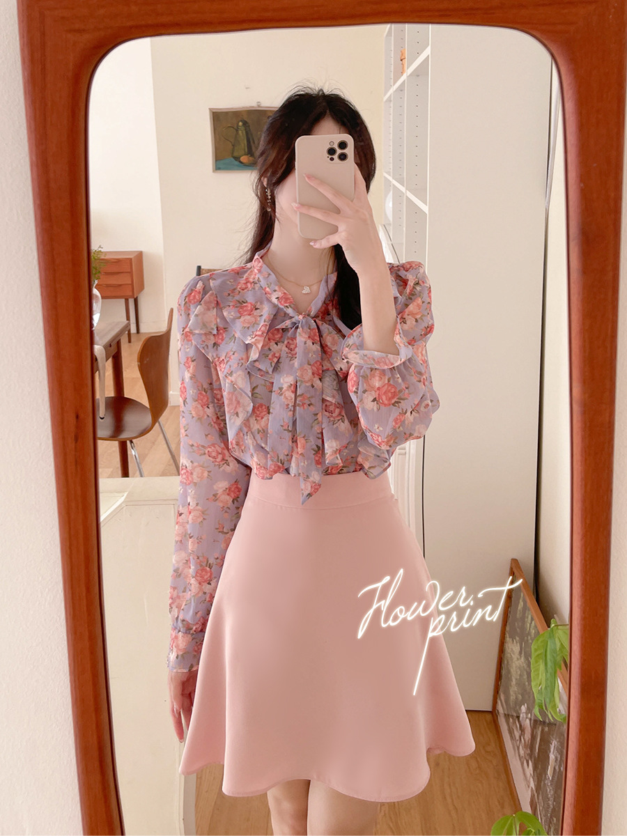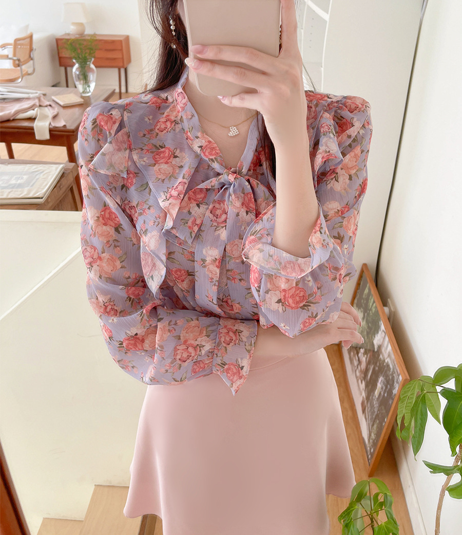 여름 V 넥 달콤한 신선한 우아한 꽃 쉬폰 셔츠 여성용 긴팔 활 셔츠 러플 얇은 루즈 탑
