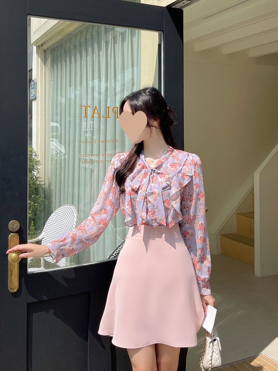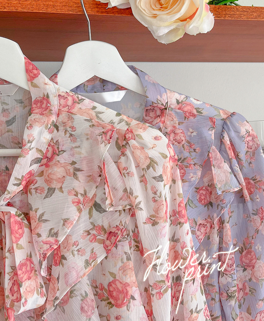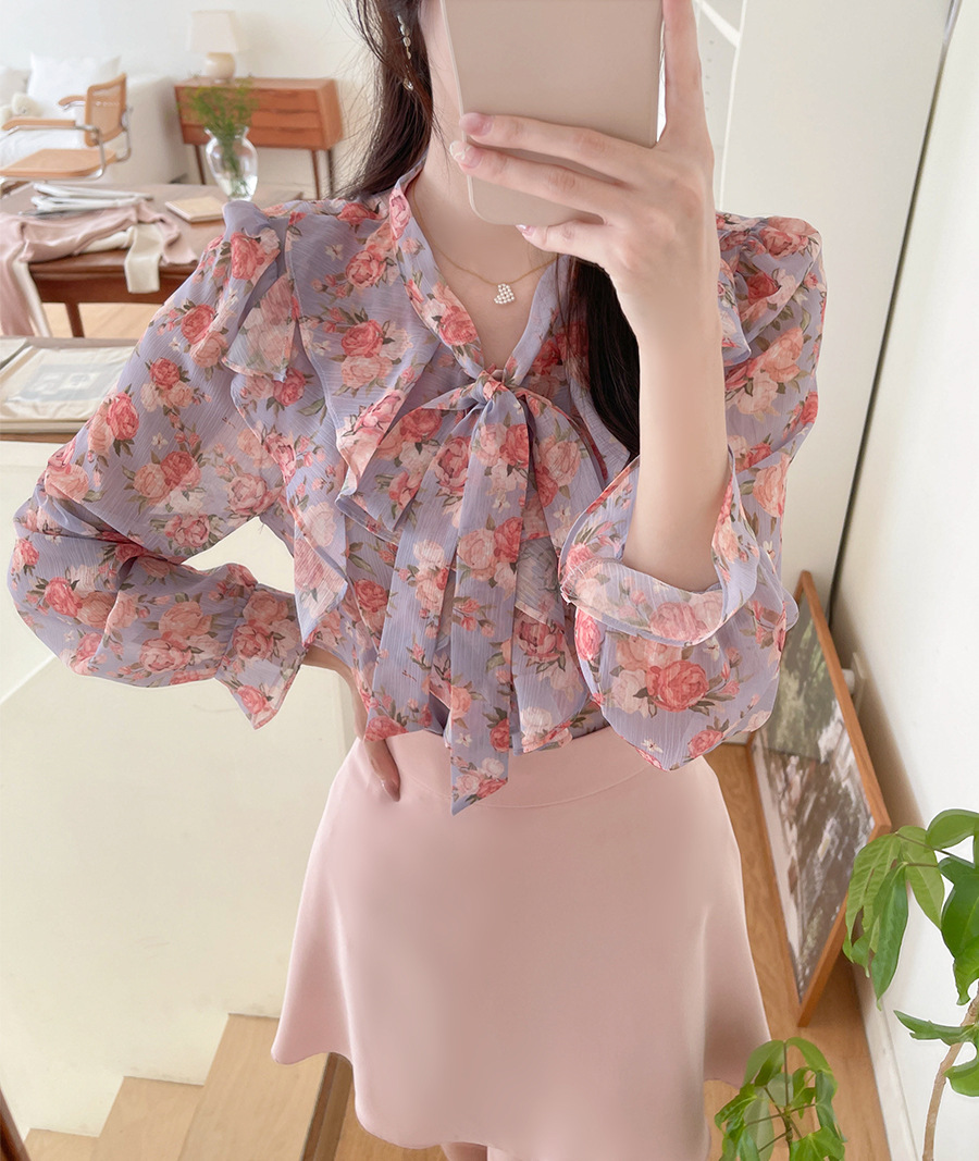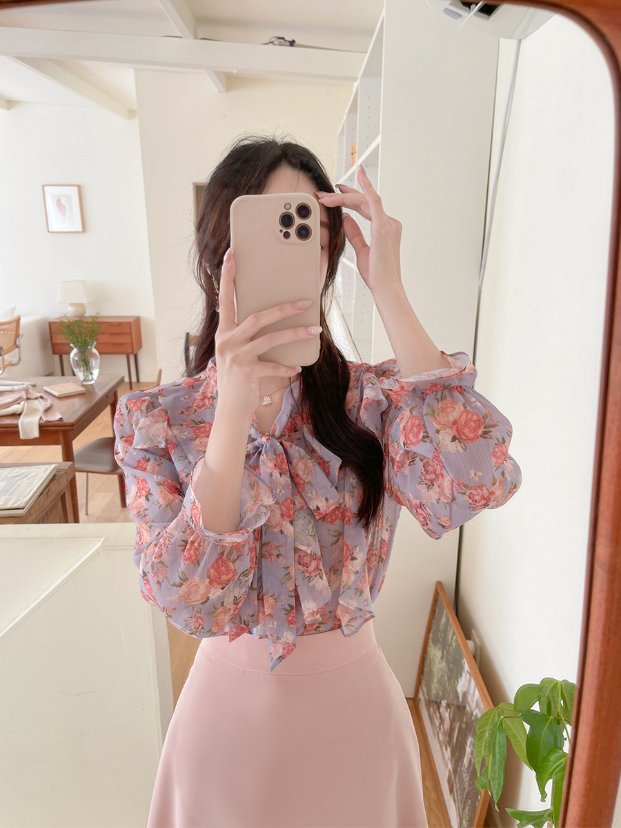 여름 V 넥 달콤한 신선한 우아한 꽃 쉬폰 셔츠 여성용 긴팔 활 셔츠 러플 얇은 루즈 탑스토어 가기