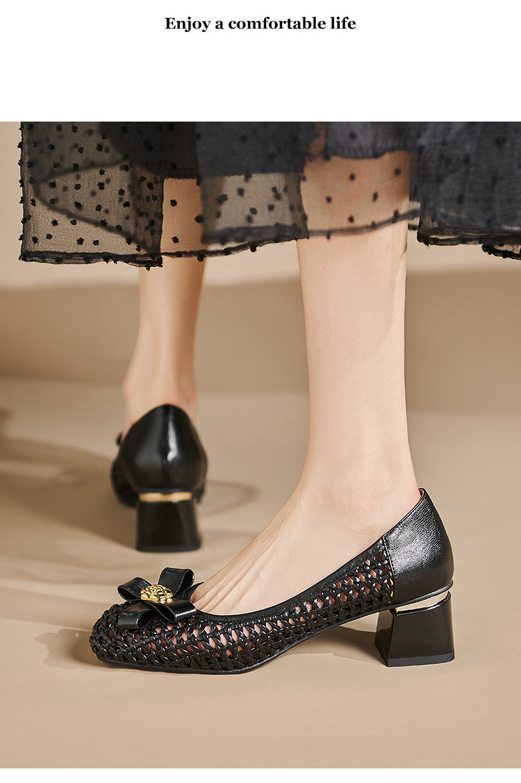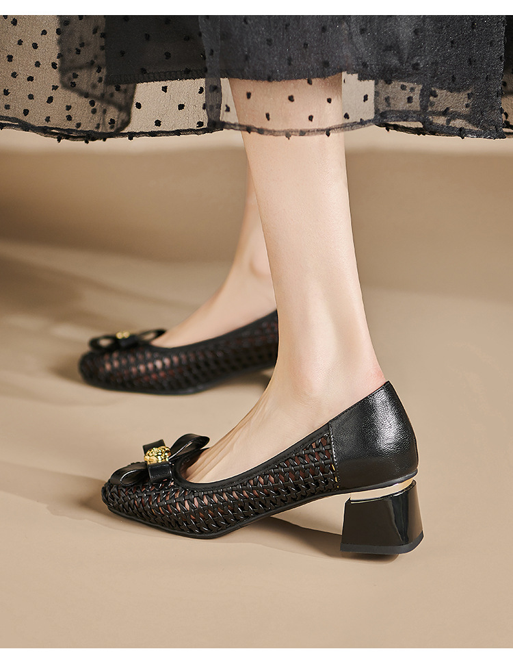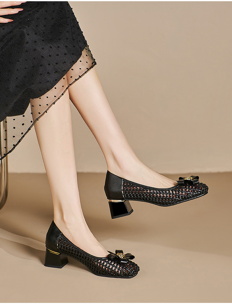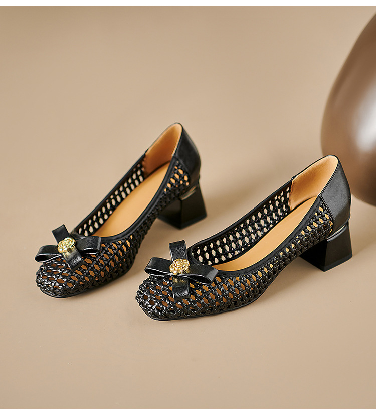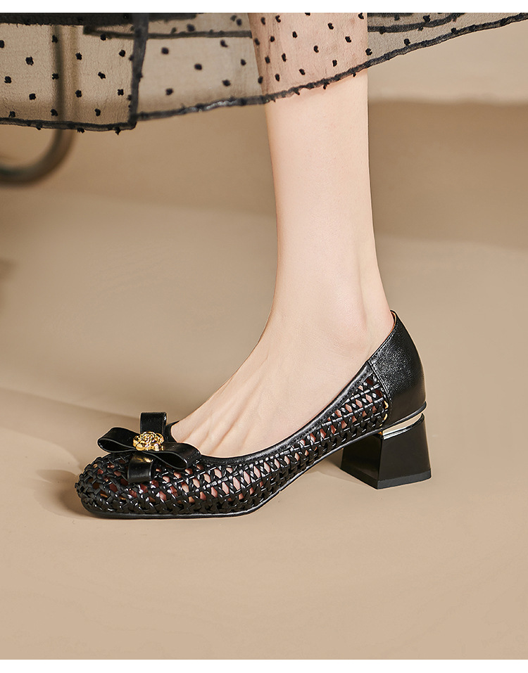 정품 가죽 중공 짠 겉옷 입신발 여성의 2025 새로운 통기성 구멍 신발 우아한 활 두꺼운 힐 하이힐 신발스토어 가기