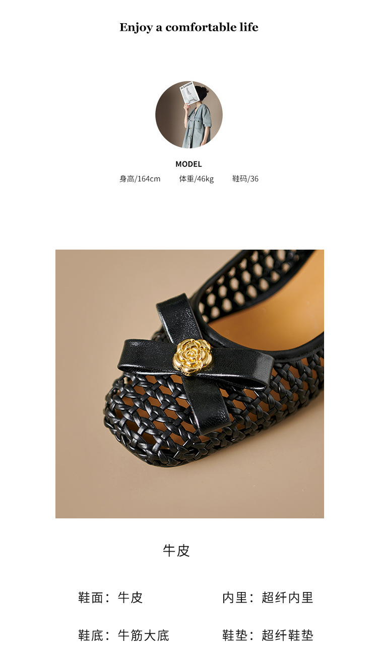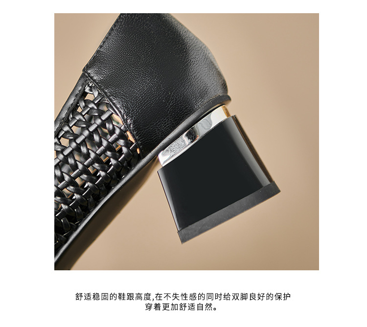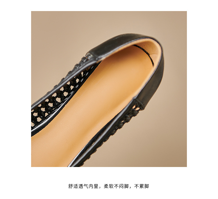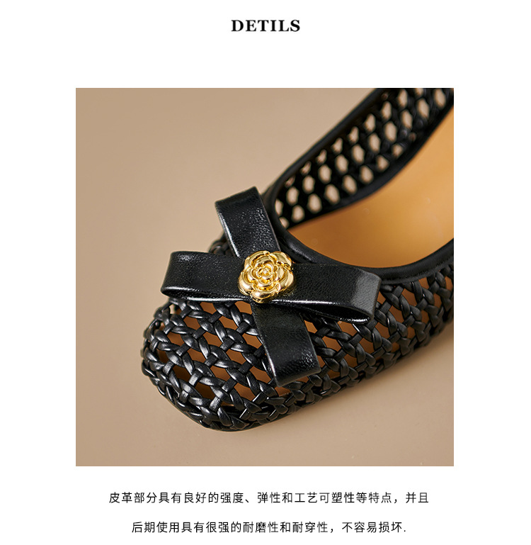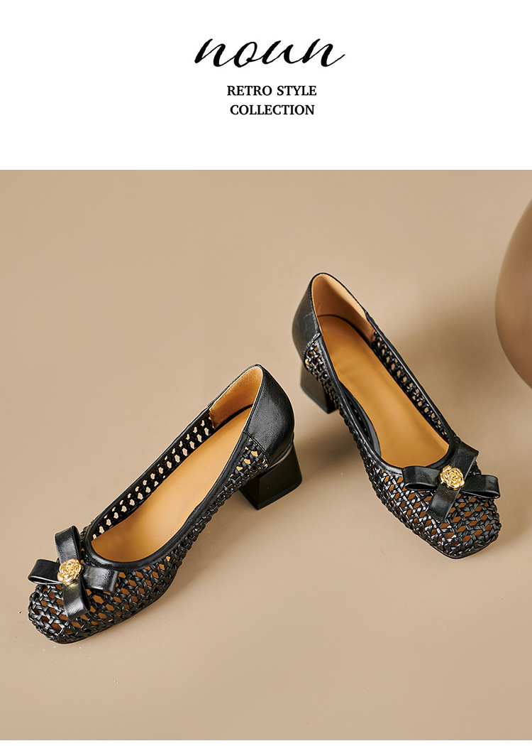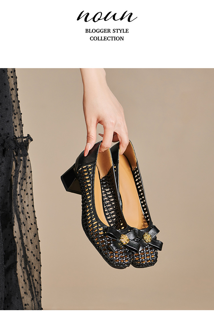 정품 가죽 중공 짠 겉옷 입신발 여성의 2025 새로운 통기성 구멍 신발 우아한 활 두꺼운 힐 하이힐 신발스토어 가기