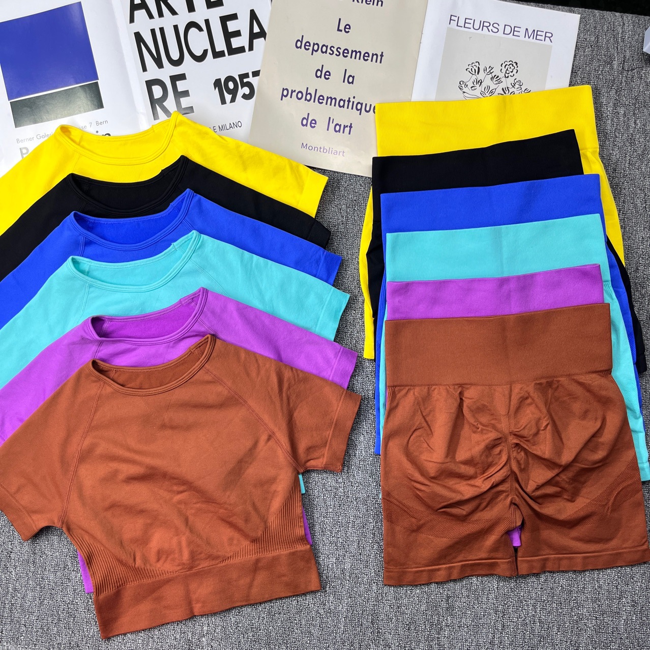 인기 있는 이음매 없는 요가 반팔 여성용 수분 흡수 속건 스포츠 탑 솔리드 컬러 고탄성 타이트 티셔츠 피트니스웨어