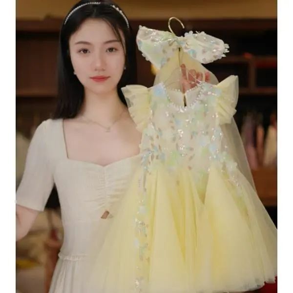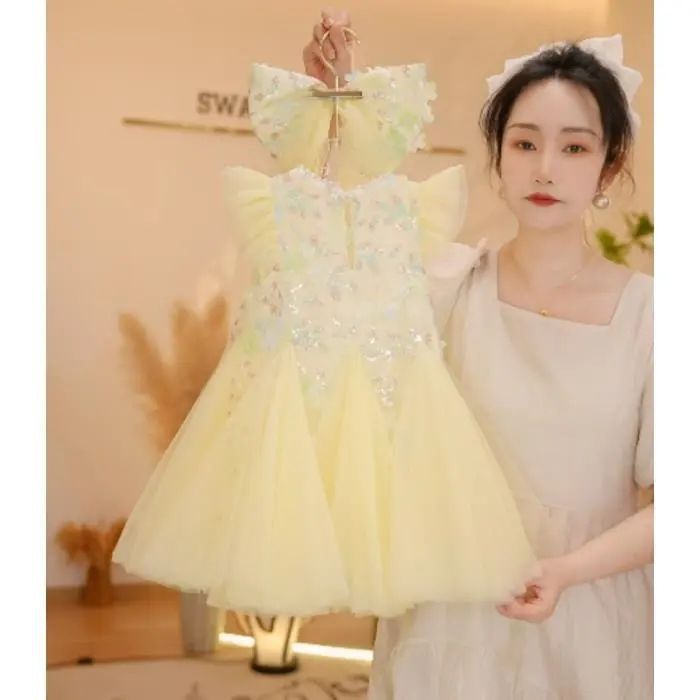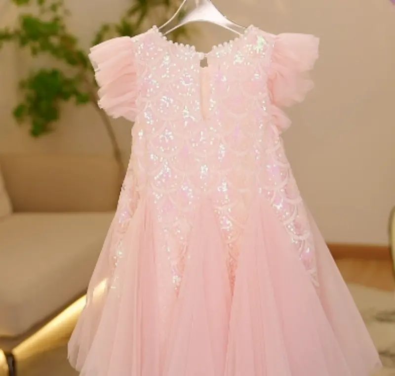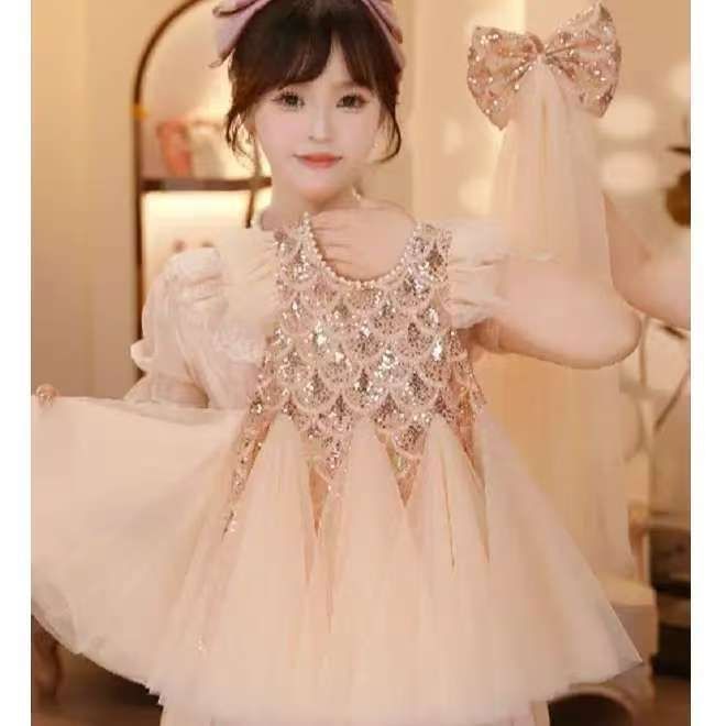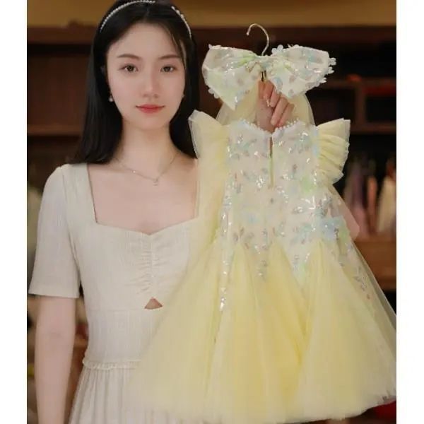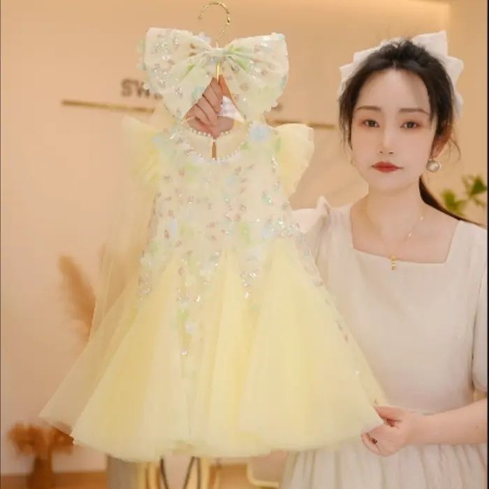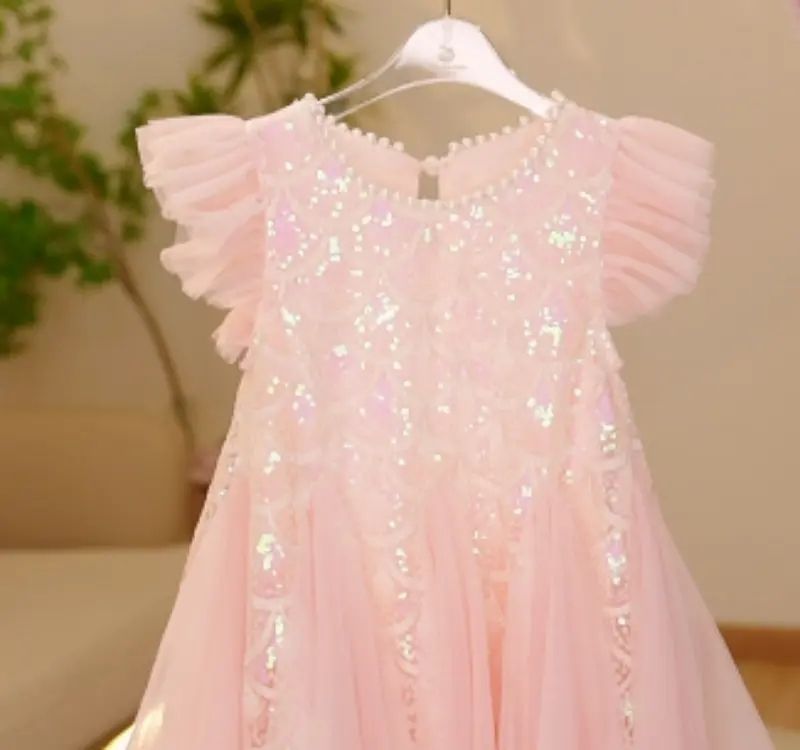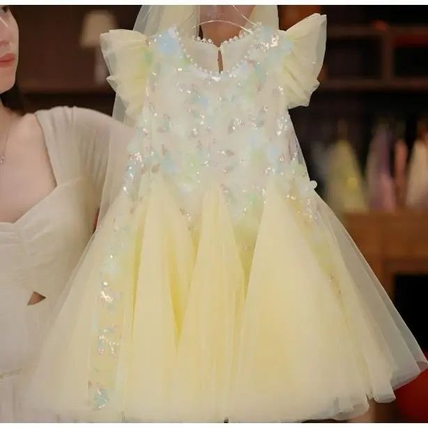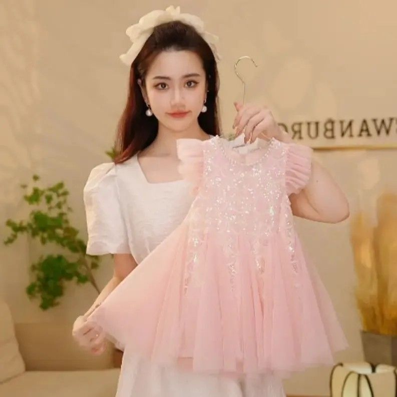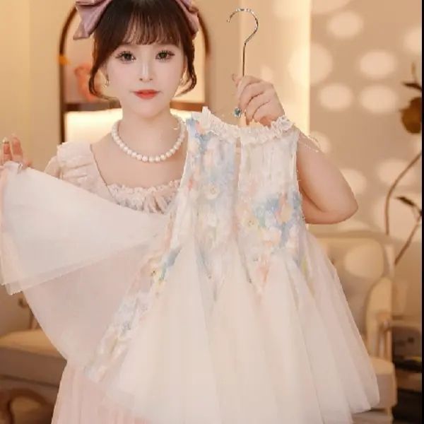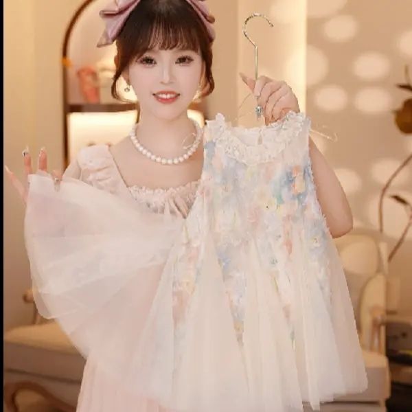 한국식 아동복 2025 여름 신형 소녀 서양식 달콤한 부드러운 꽃 자수 반소매 메쉬 원피스 트렌디스토어 가기