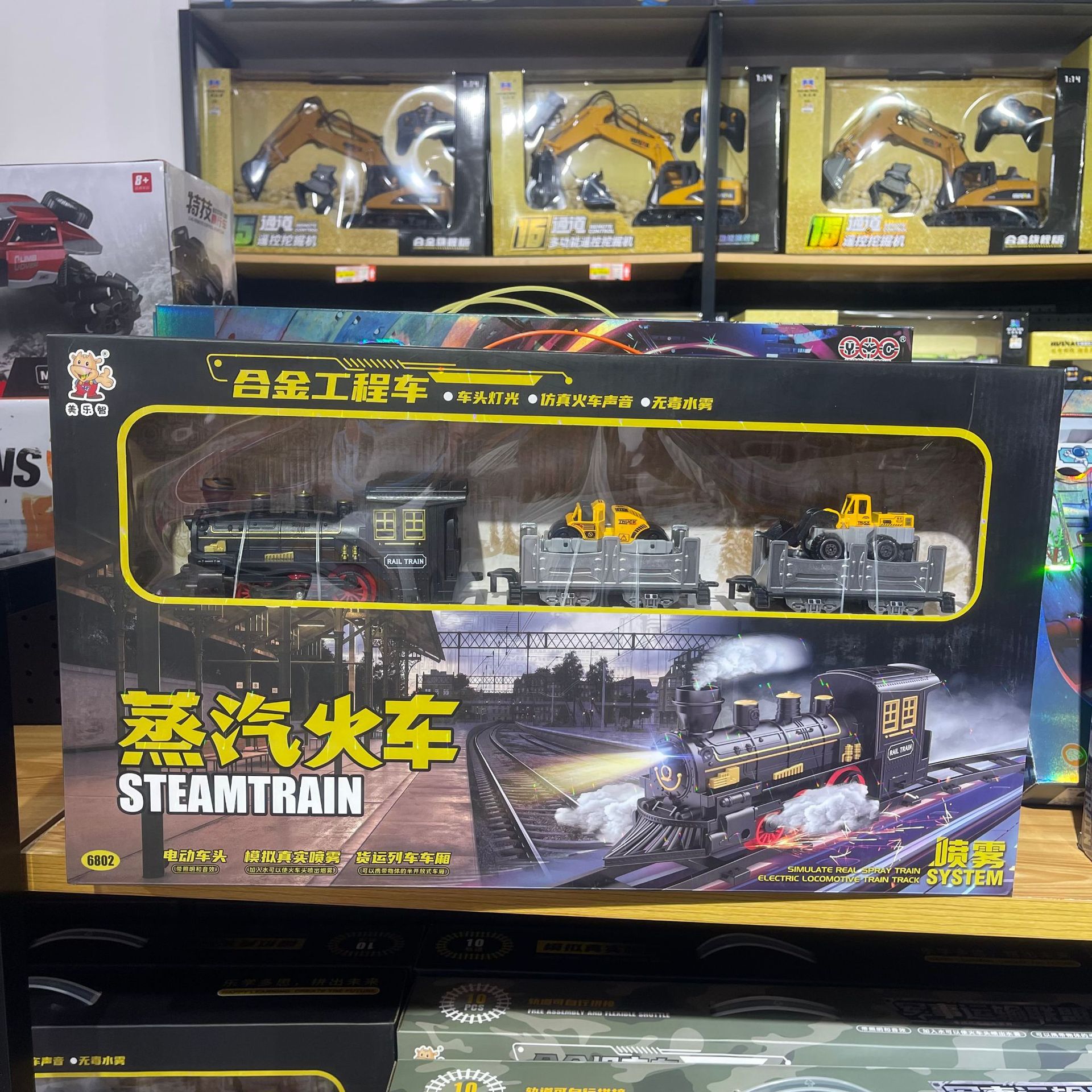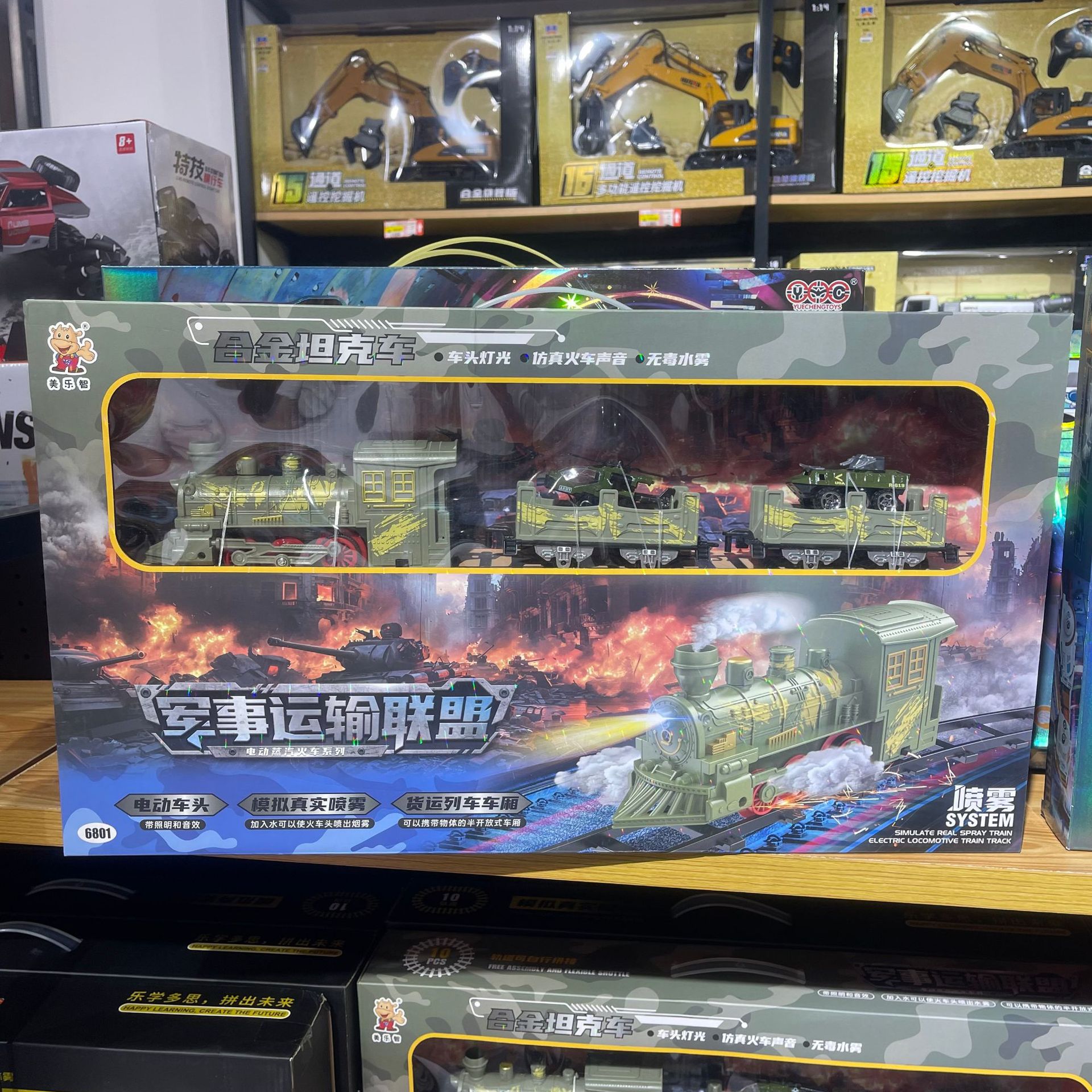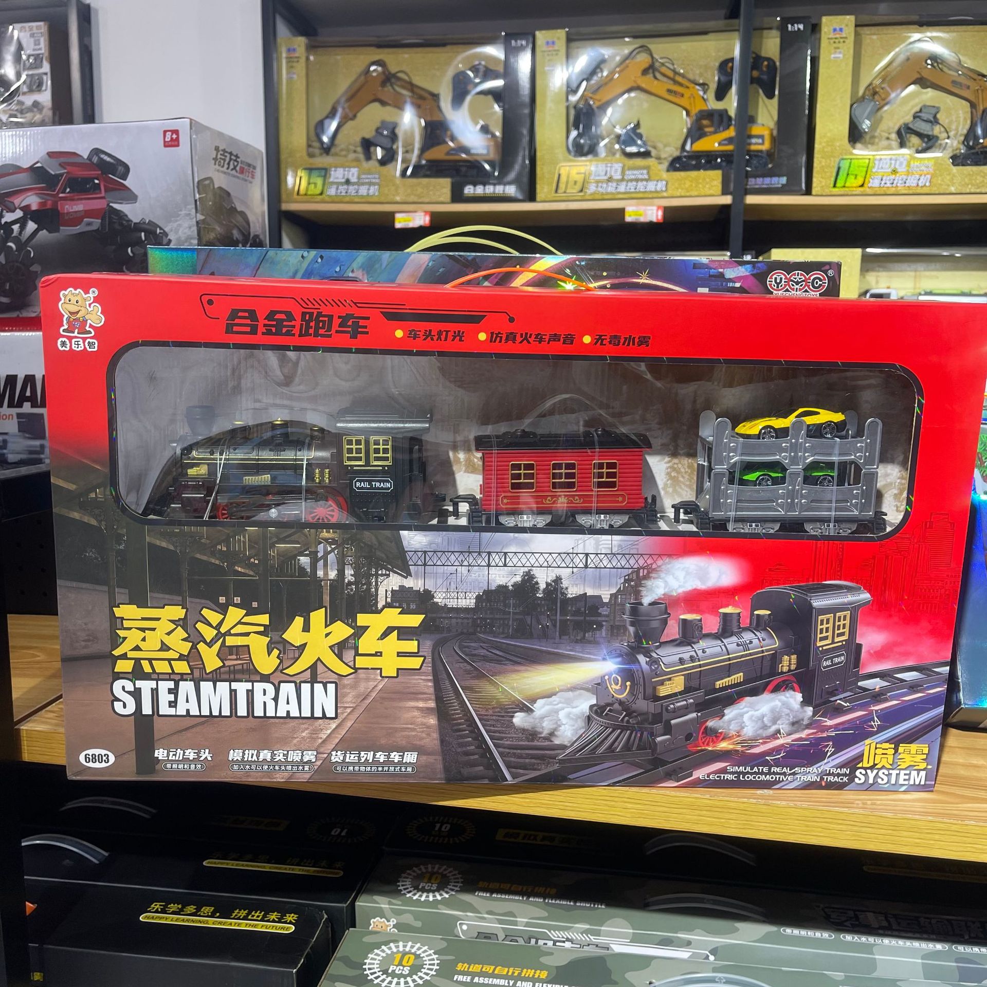 Meilezhi 장난감 복고풍 스프레이 전기 기차 소년 시뮬레이션 빛 음악 기차 트랙 교육 기관스토어 가기