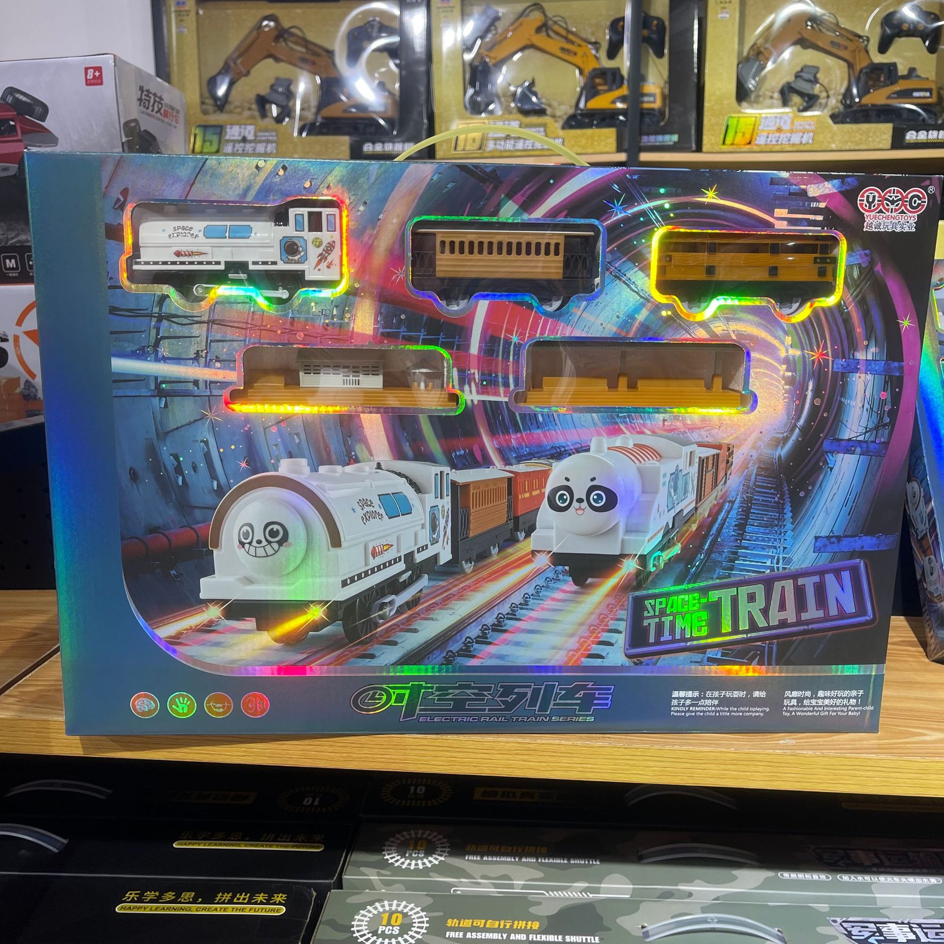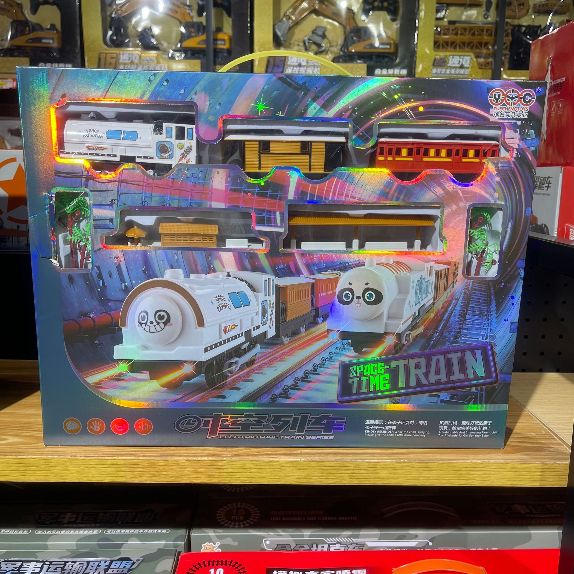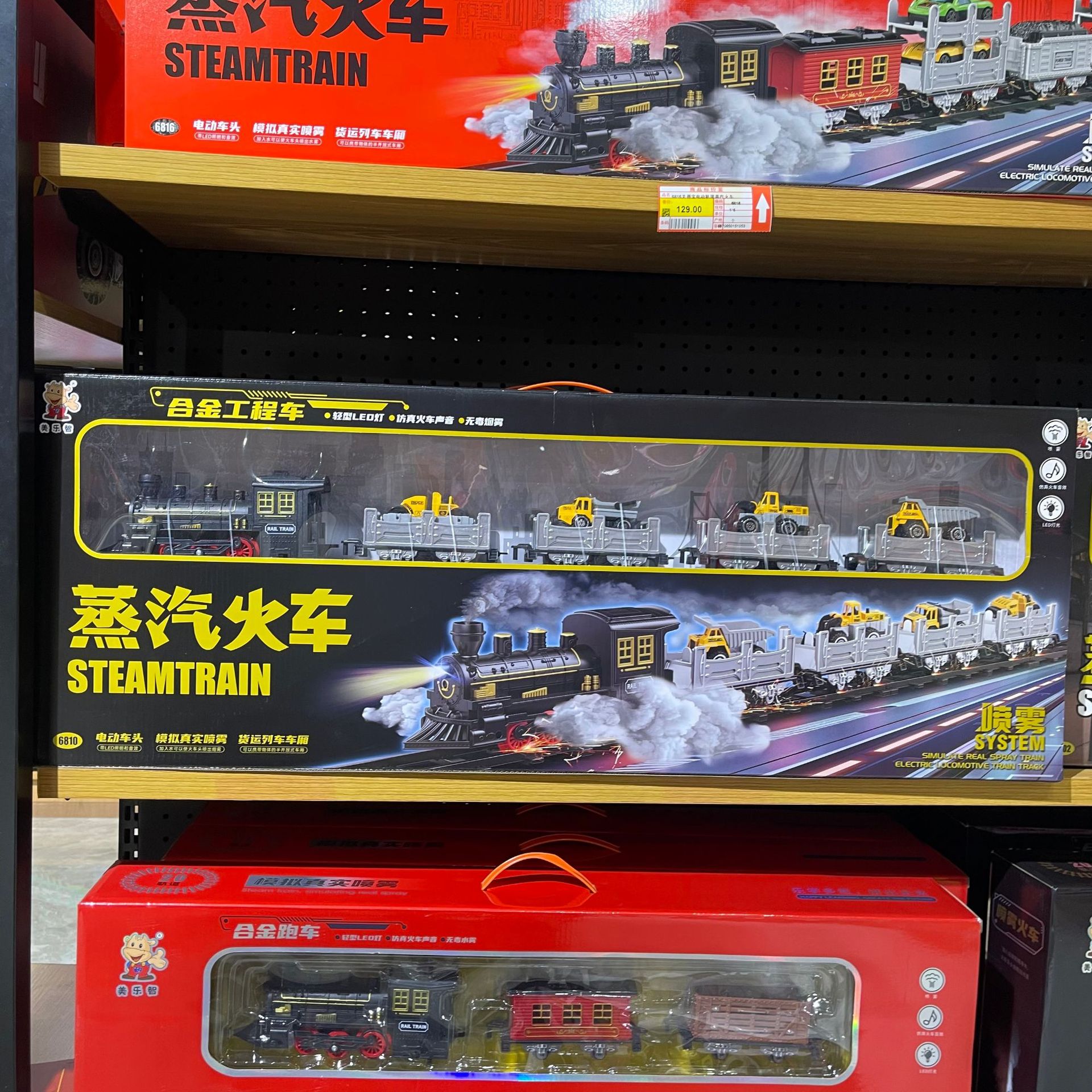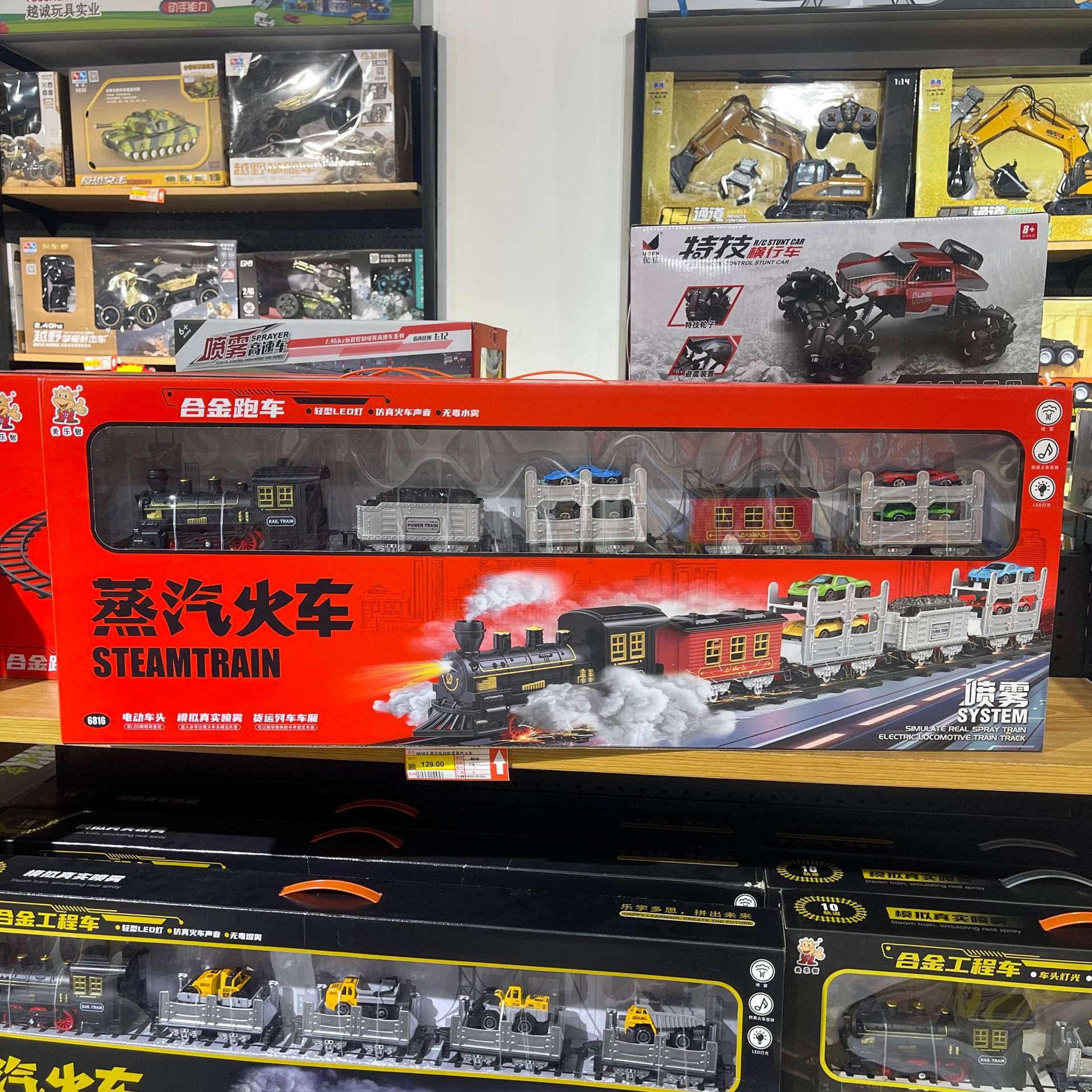 Meilezhi 장난감 복고풍 스프레이 전기 기차 소년 시뮬레이션 빛 음악 기차 트랙 교육 기관스토어 가기