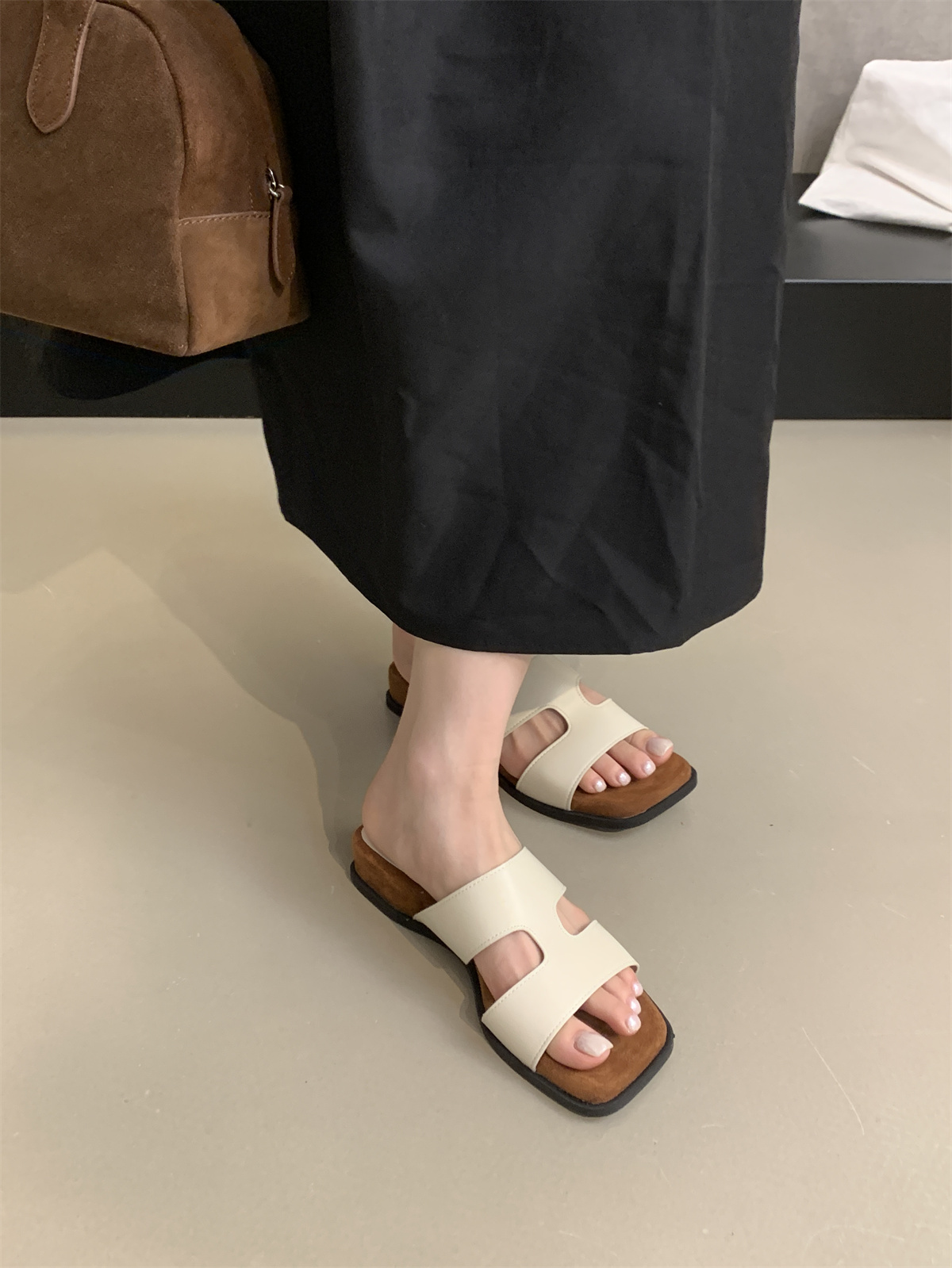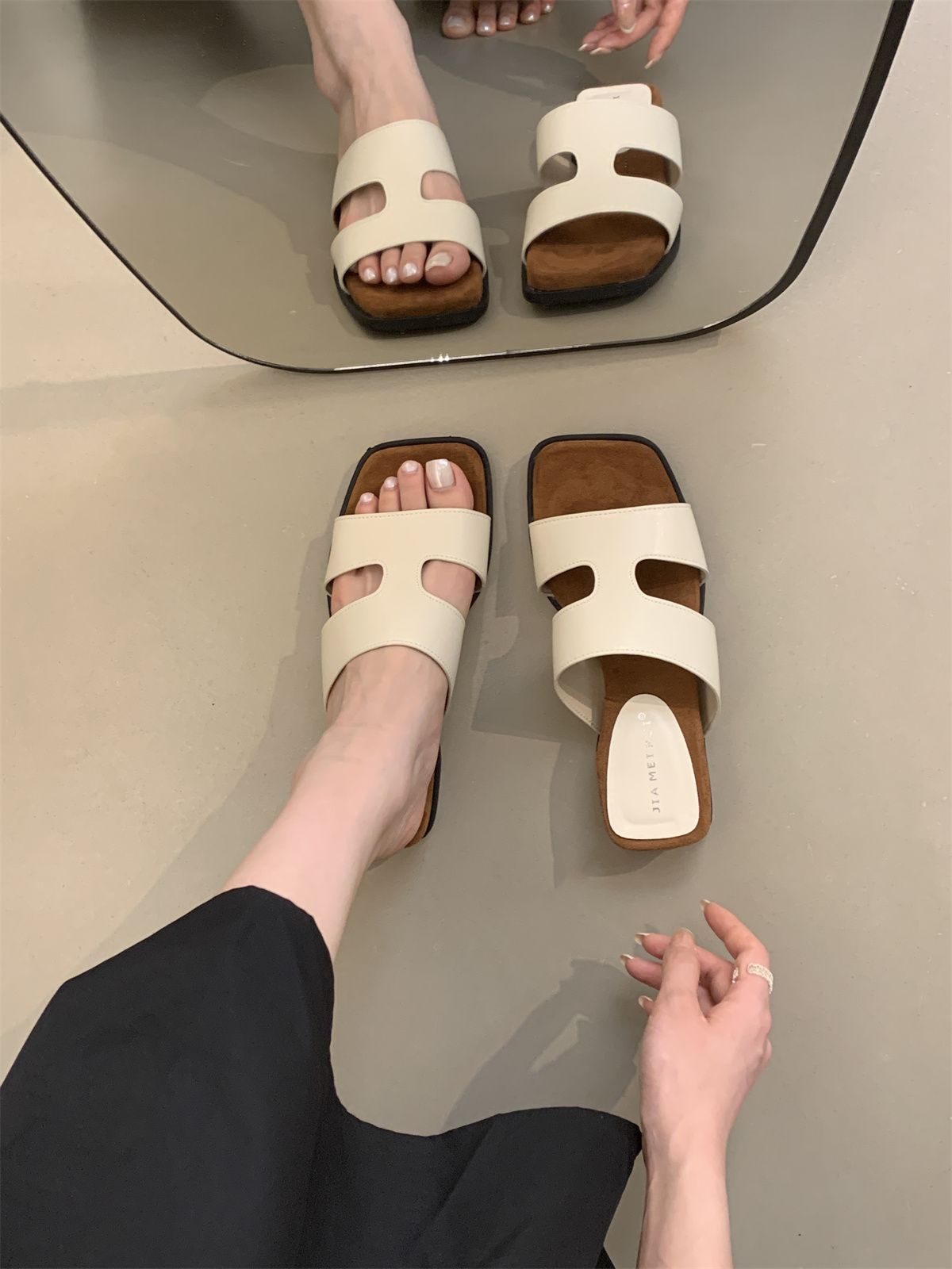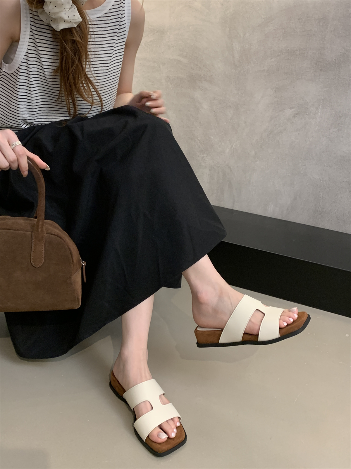 부드러운 바닥 슬리퍼 여성용 2025 년 여름 의상 H 샌들 프렌치 스퀘어 발가락 스커트 두꺼운 플랫 비치 홀리데이 샌들