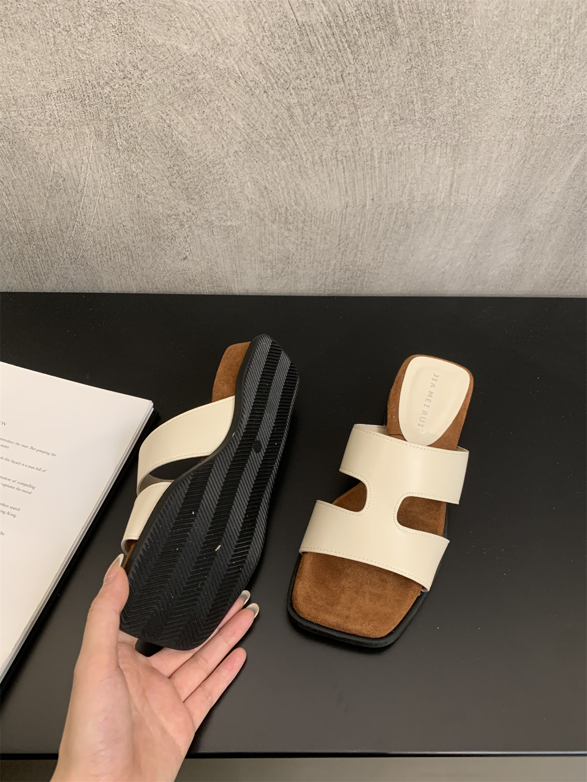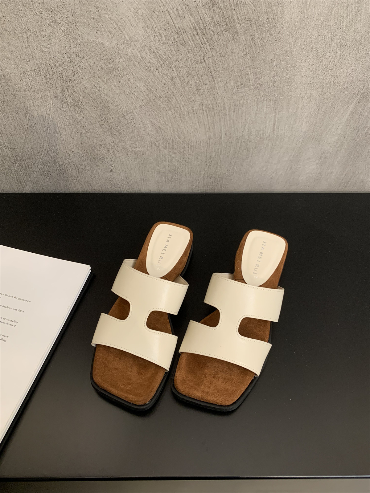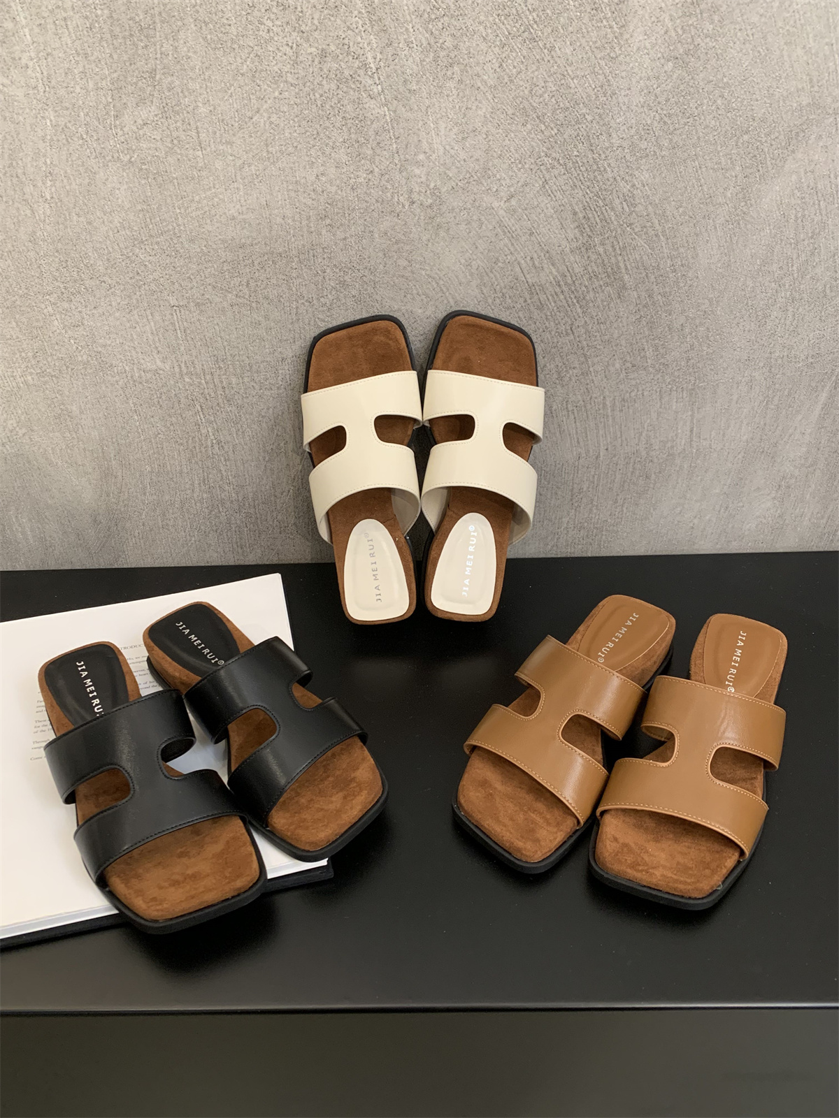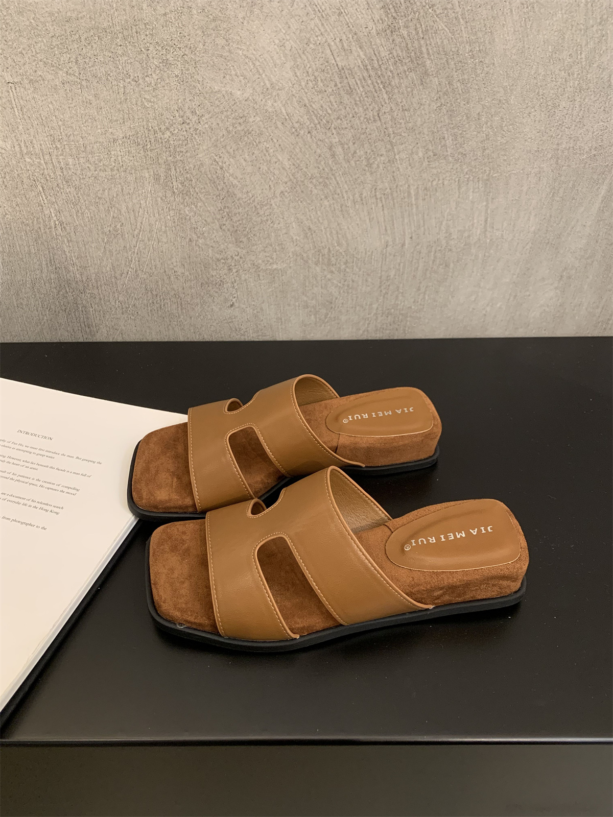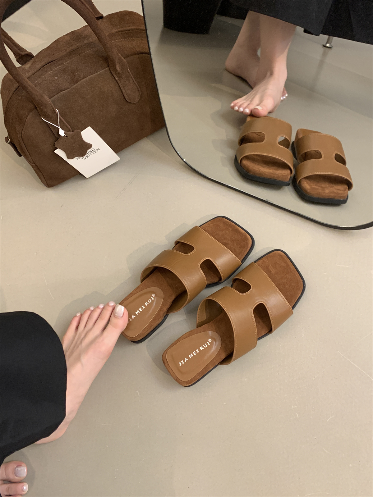 부드러운 바닥 슬리퍼 여성용 2025 년 여름 의상 H 샌들 프렌치 스퀘어 발가락 스커트 두꺼운 플랫 비치 홀리데이 샌들스토어 가기