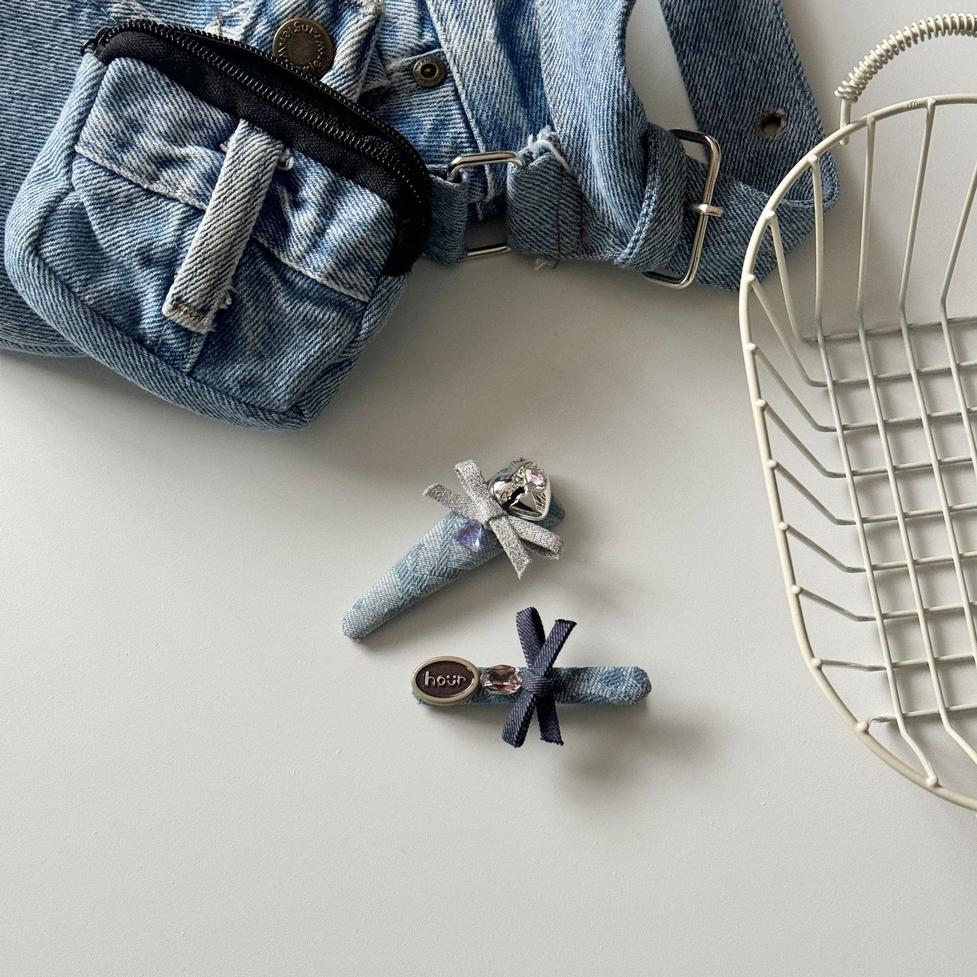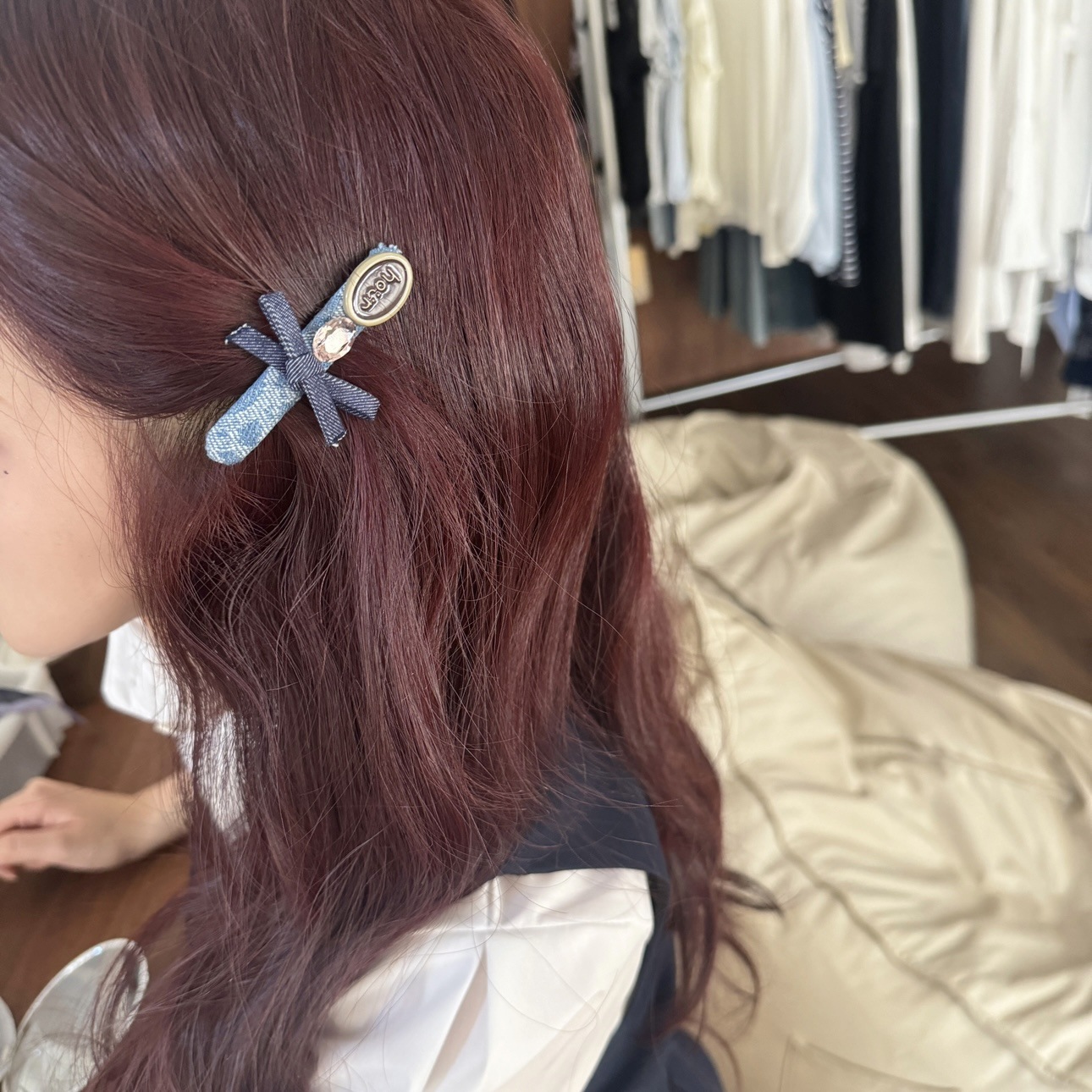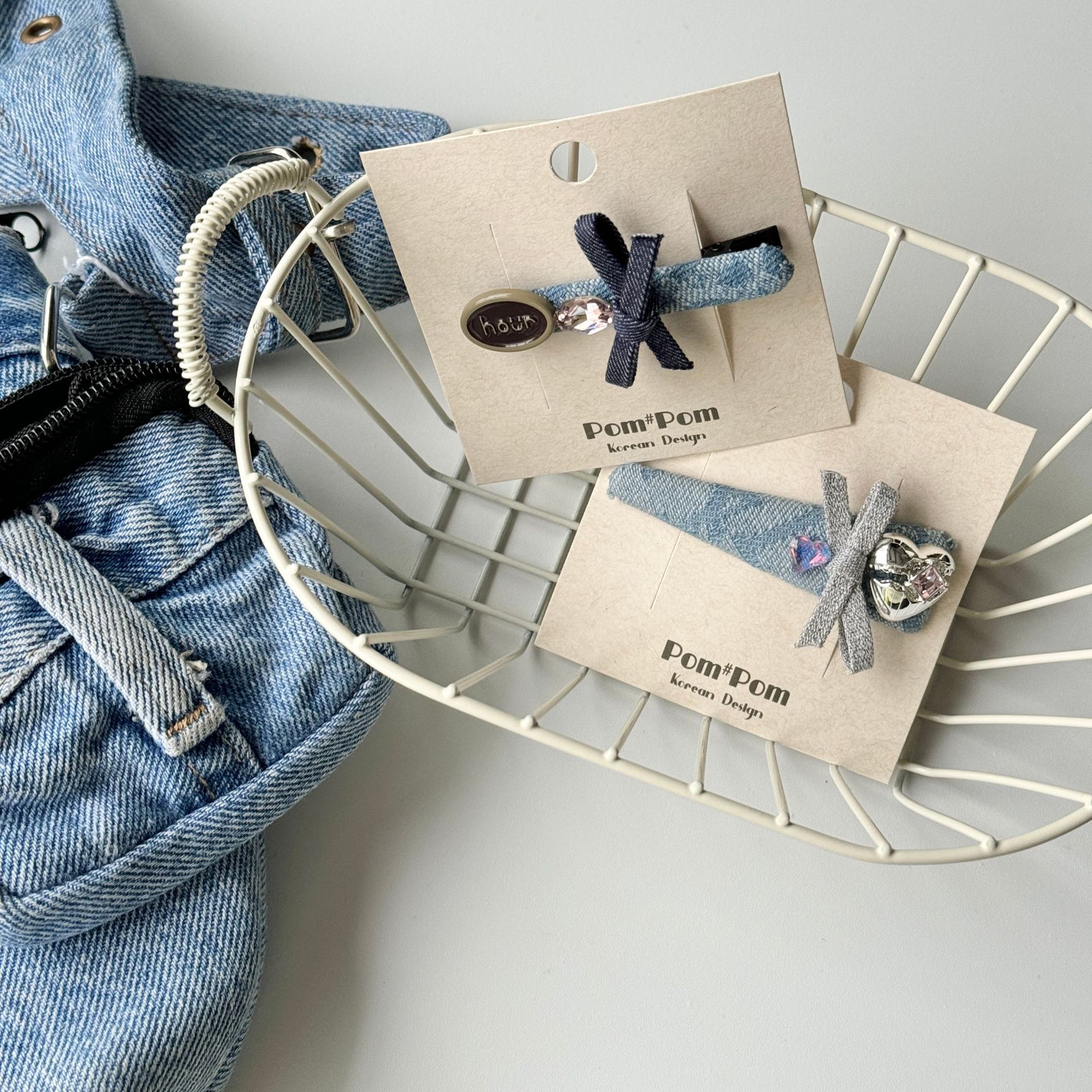 한국 스타일 소녀 리본 하트 모양 큐빅 데님 머리핀 고급 오리주둥이 앞머리 사이드 헤어 액세서리 봄 신상품스토어 가기