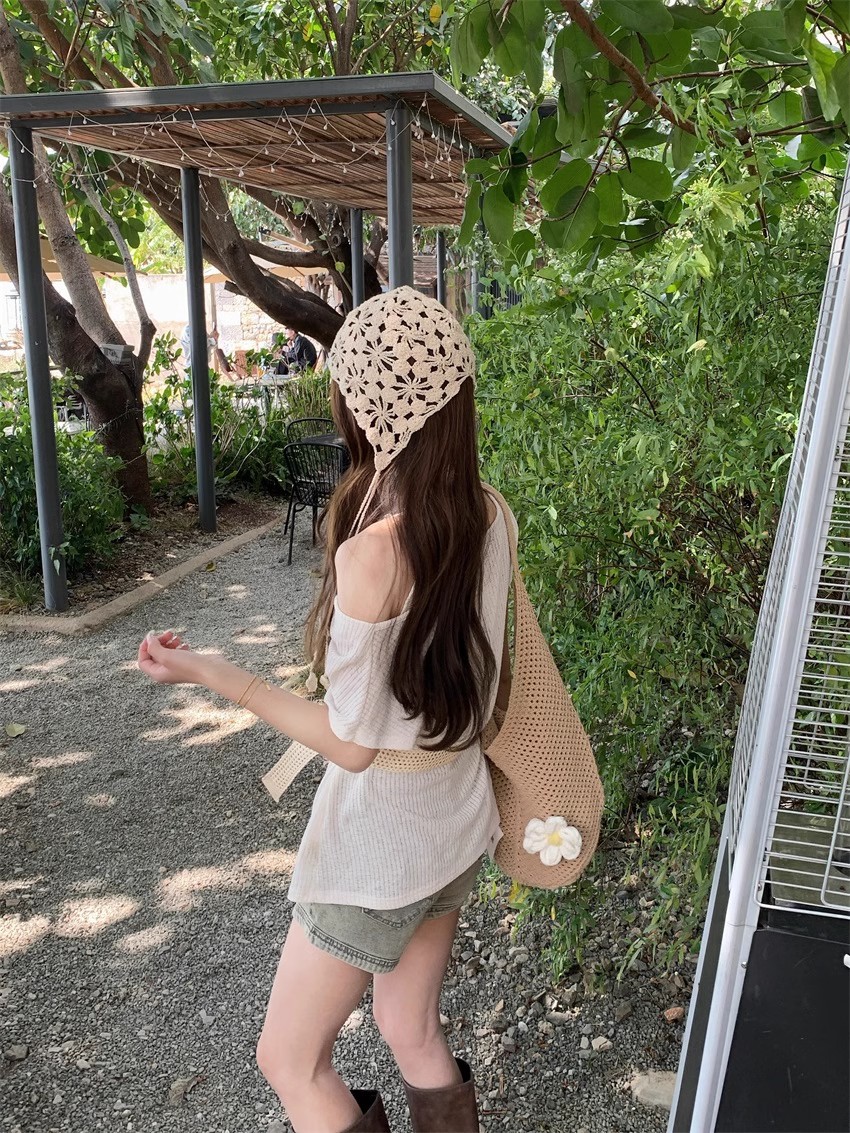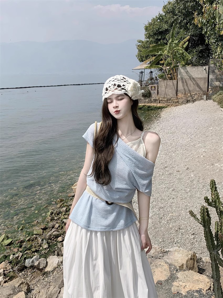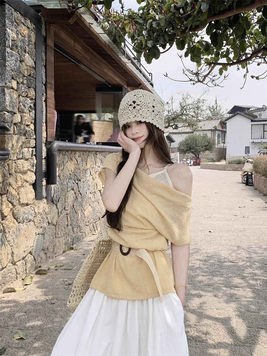 부드러운 스타일 오픈 어깨 얇은 쌓인 외부 탑 스윙 칼라 반팔 스웨터 여성의 2025 여름 새로운 디자인 감각스토어 가기