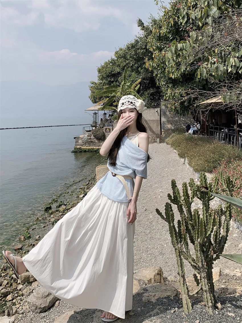 부드러운 스타일 오픈 어깨 얇은 쌓인 외부 탑 스윙 칼라 반팔 스웨터 여성의 2025 여름 새로운 디자인 감각