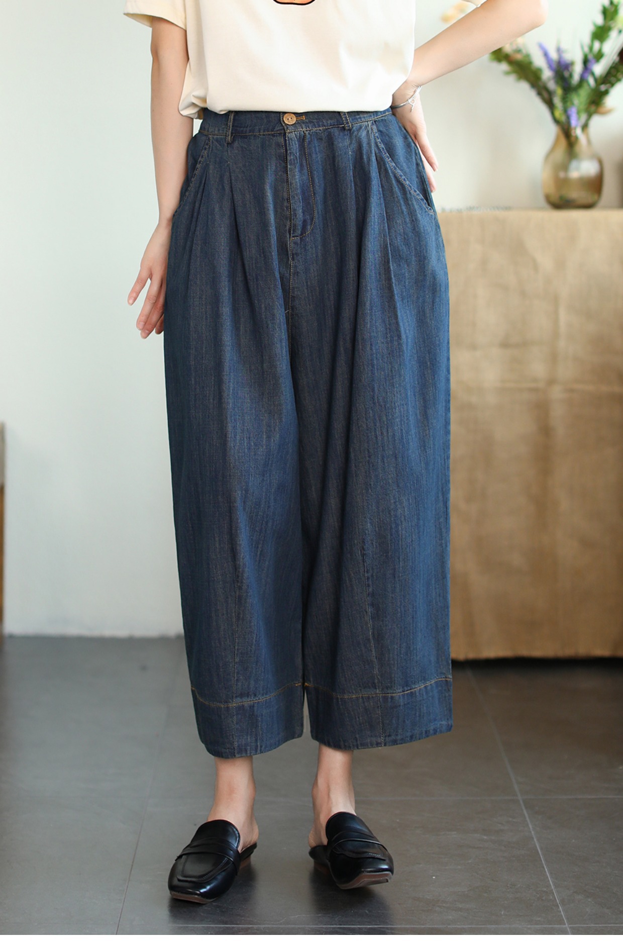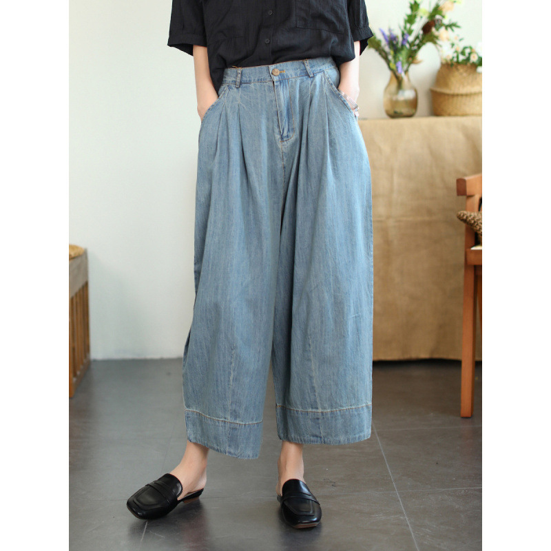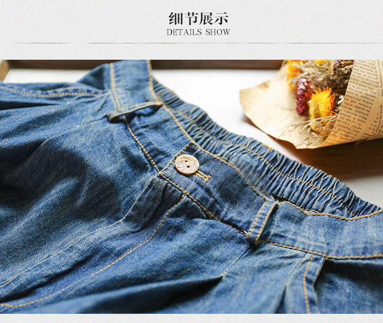 테스터 코튼 데님 자른 바지 여름 새로운 에테르 제품 반 탄성 허리 느슨한 플러스 사이즈 넓은 다리 바지스토어 가기