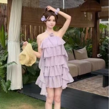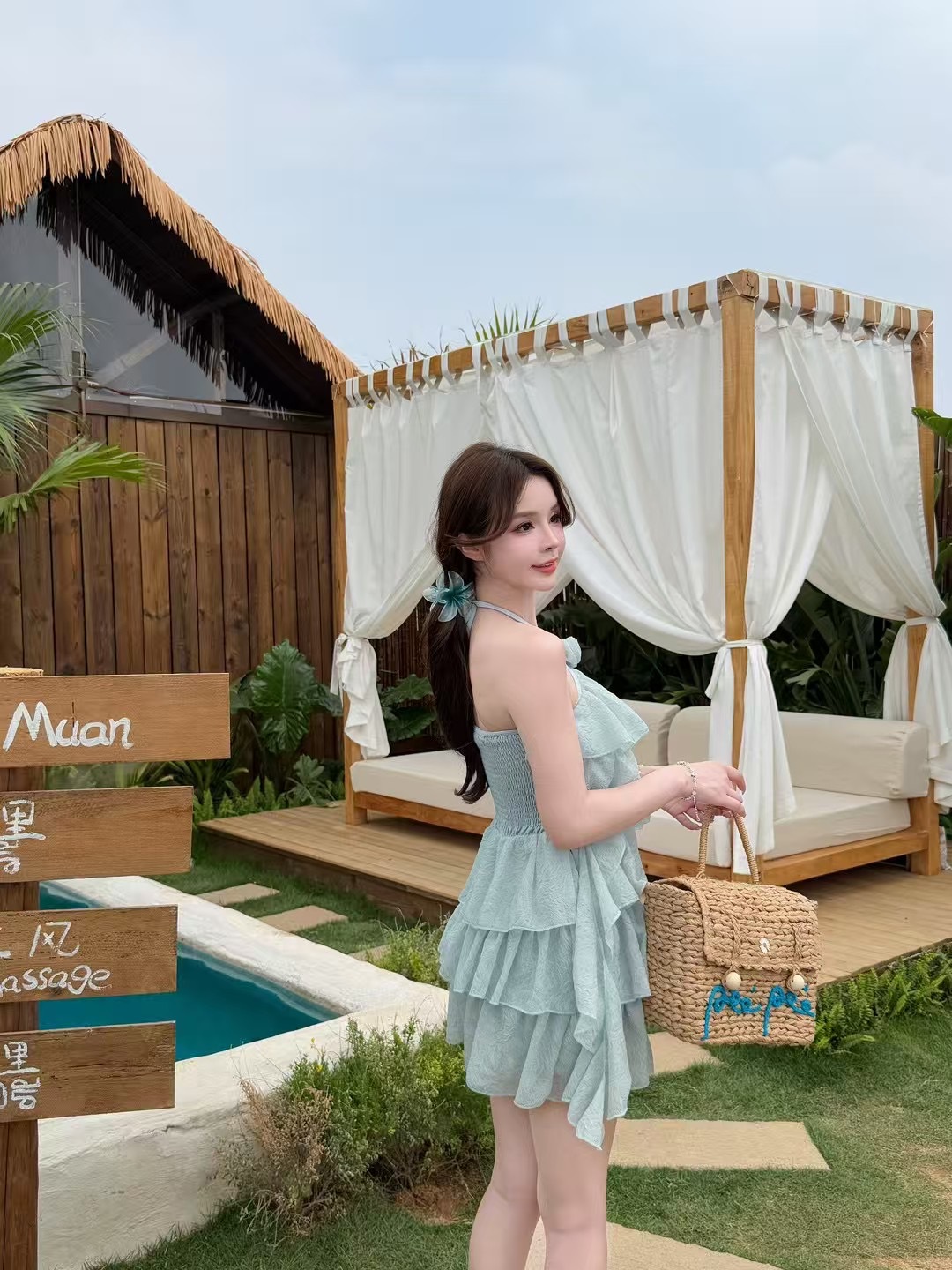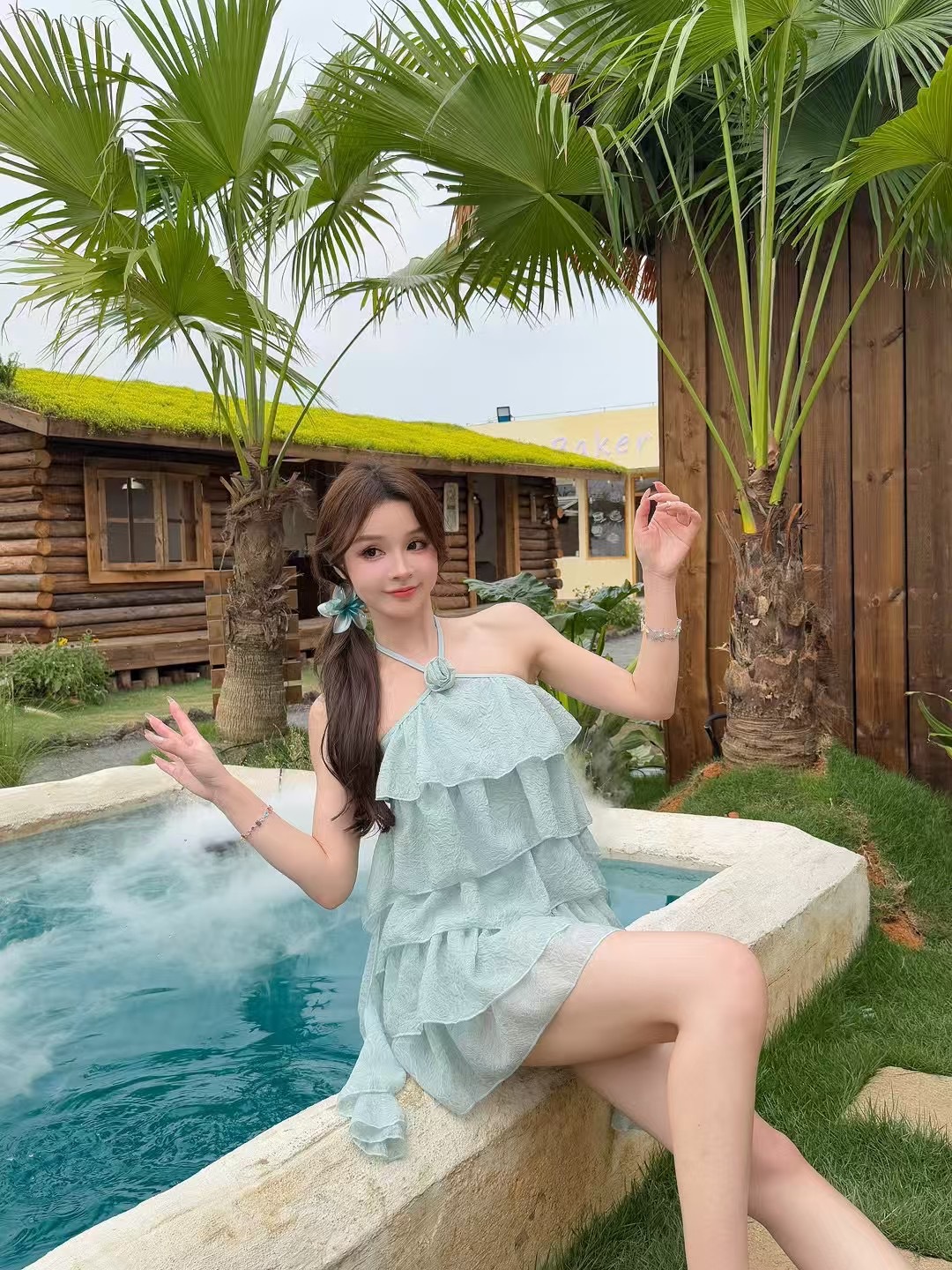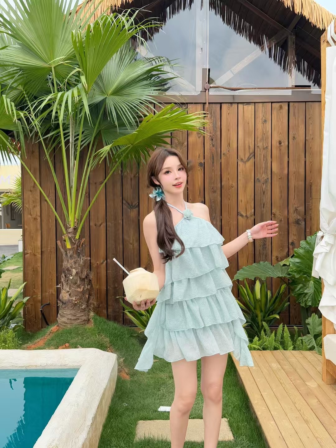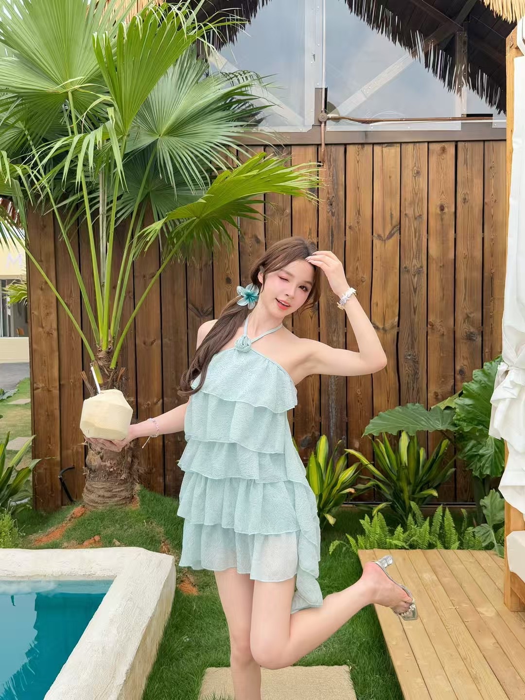 온천 수영복 여성용 순수한 매력 입체 꽃무늬 슬림핏 홀터넥 패셔너블한 핫걸 슬림핏 러플 스티치 케이크 스커트스토어 가기