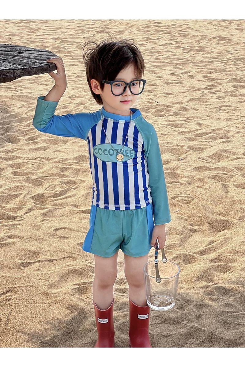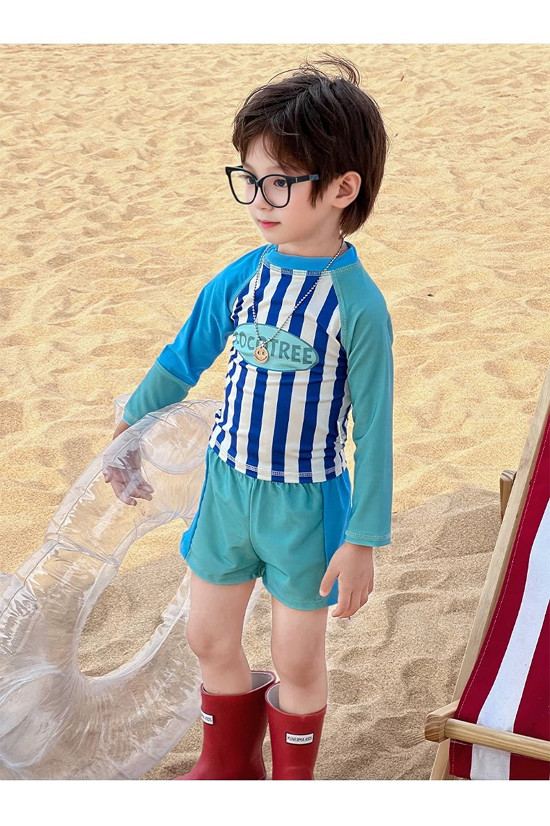 어린이 수영복 소년 어린이 폴리 에스터 스포츠 레저 스플릿 투피스 세트 긴 소매 레트로 스트라이프 온천 수영복