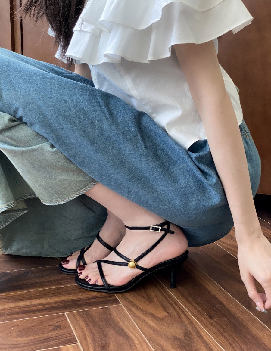 2025 여름 얇은 스트랩 금속 장식 오픈 토우 여성 신발 패션 통근 솔리드 컬러 미드 힐 샌들 간단한 하이힐스토어 가기