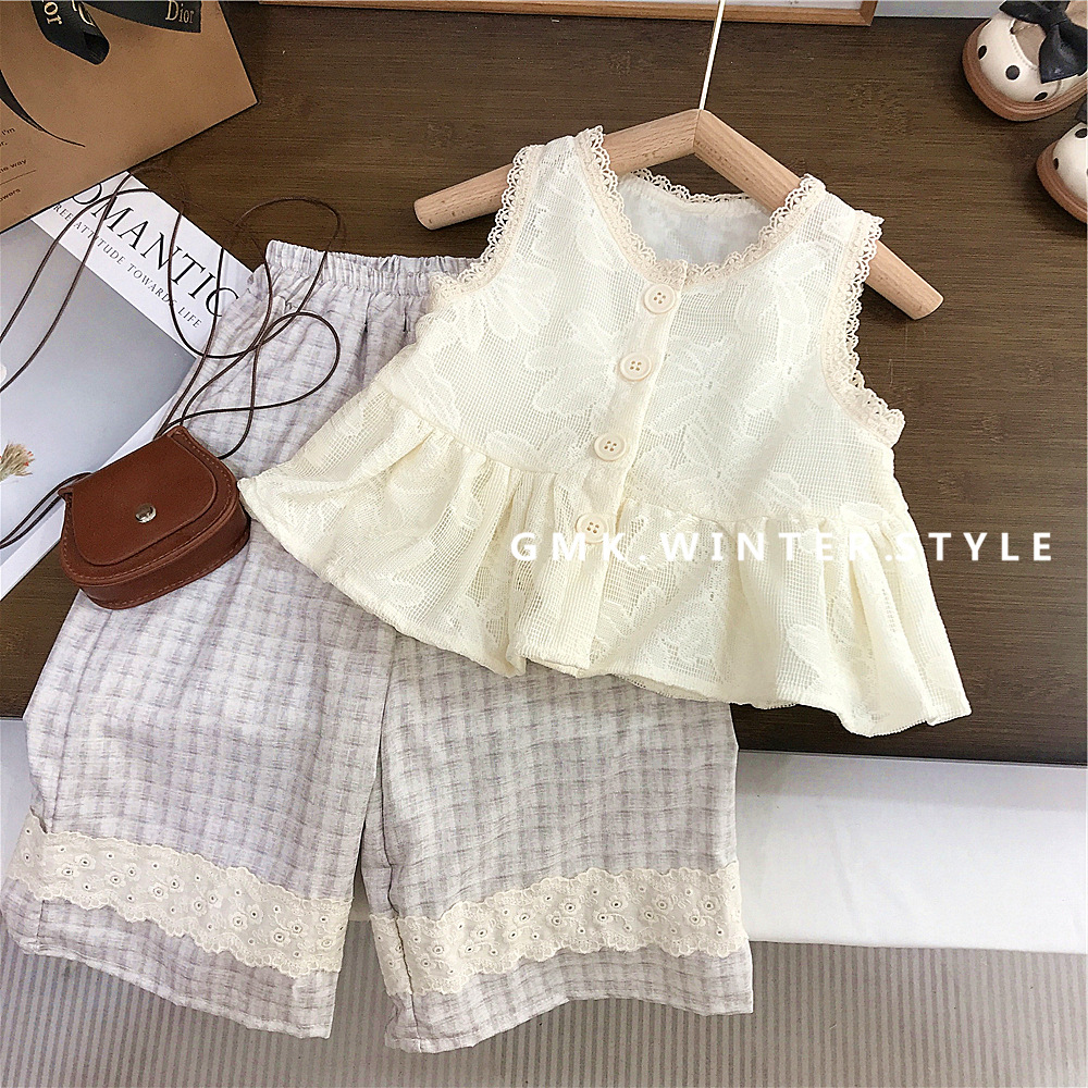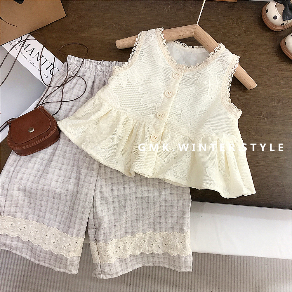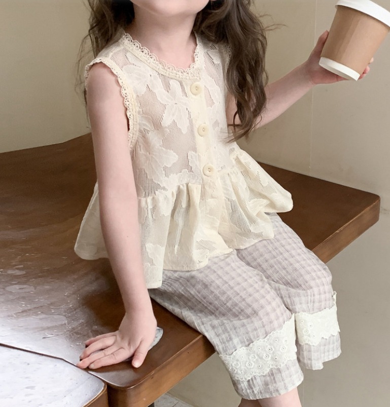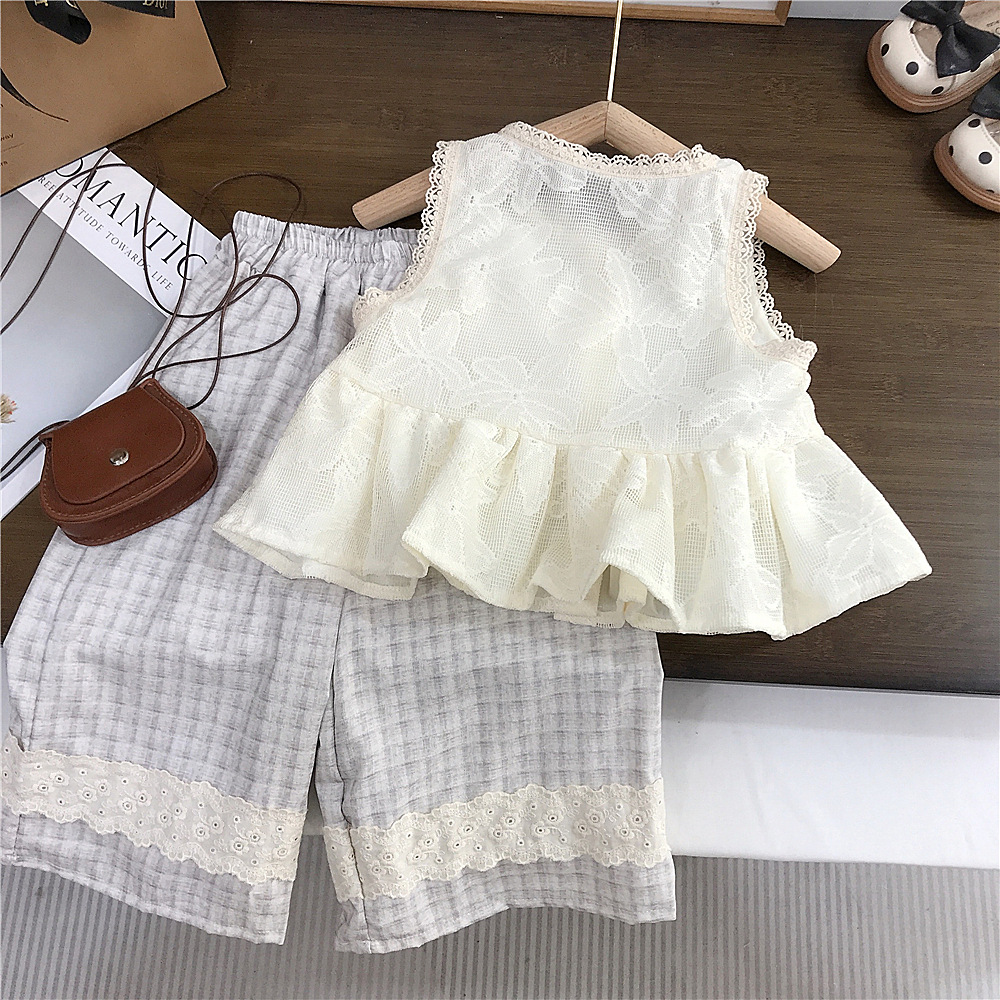 여자 여름 세트 새로운 어린이 중공 레이스 민소매 탑 아기 여성의 대외 무역을위한 여름 격자 무늬 넓은 다리 바지