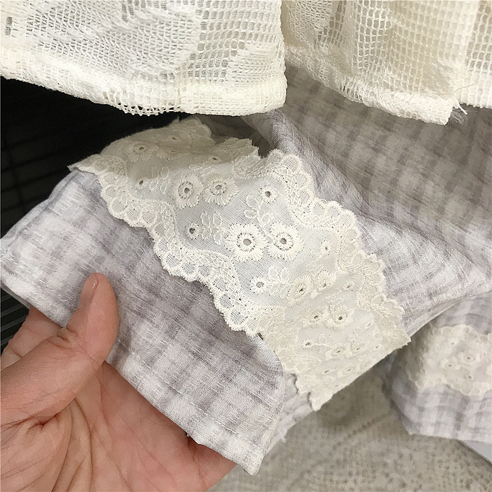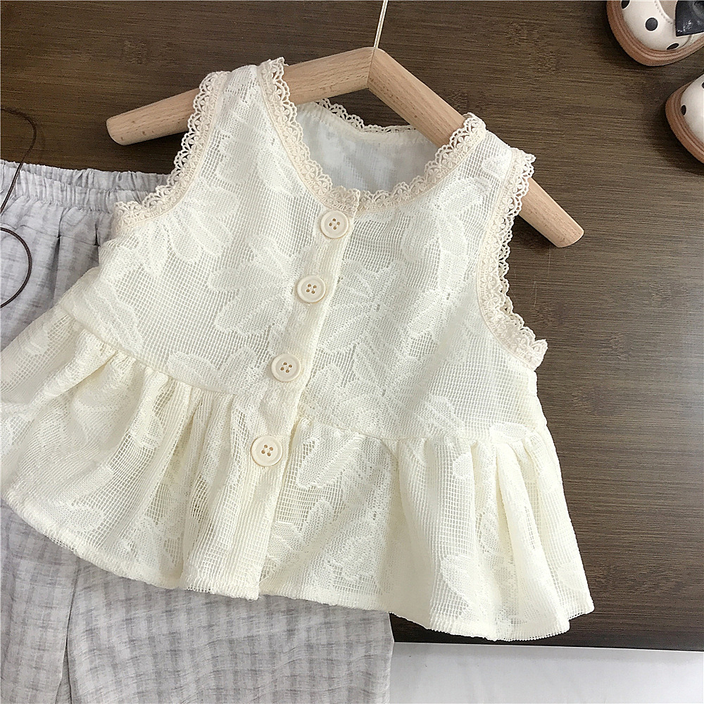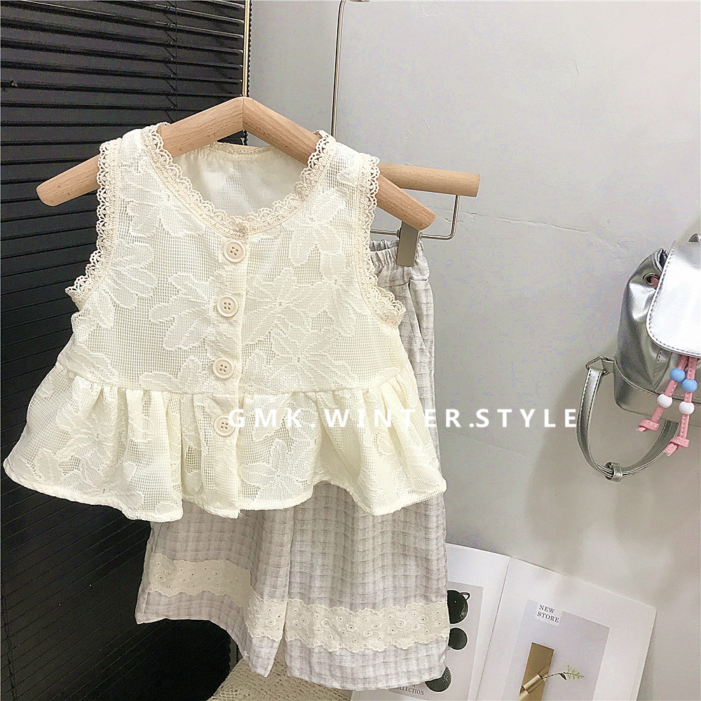 여자 여름 세트 새로운 어린이 중공 레이스 민소매 탑 아기 여성의 대외 무역을위한 여름 격자 무늬 넓은 다리 바지