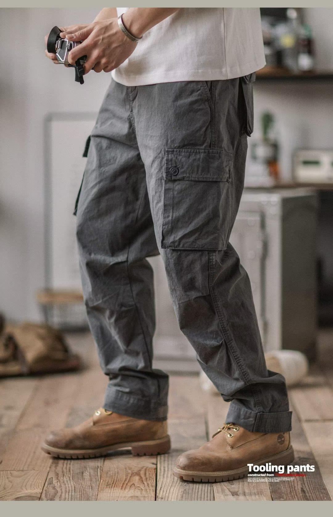 남성용 일본식 워싱 복고풍 작업복 가을 새로운 멀티 포켓 디스트레스드 루즈 레깅스 산업용 캐주얼 바지