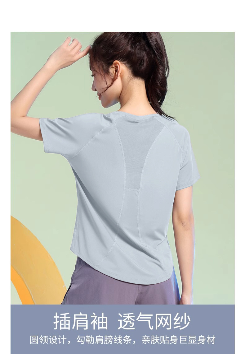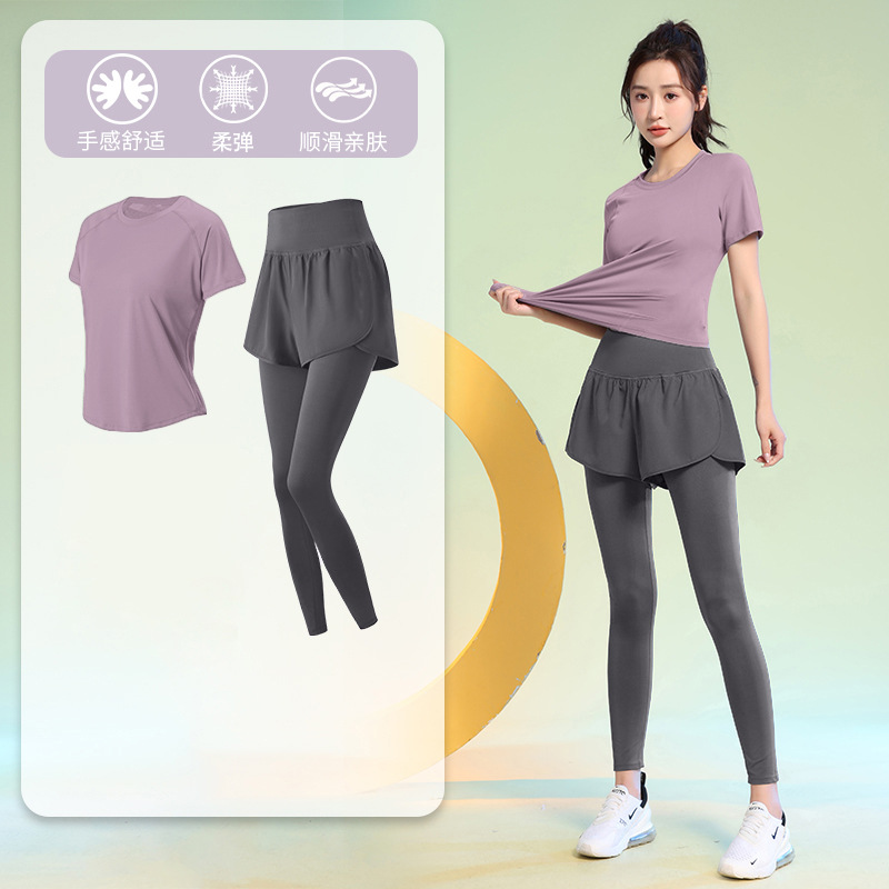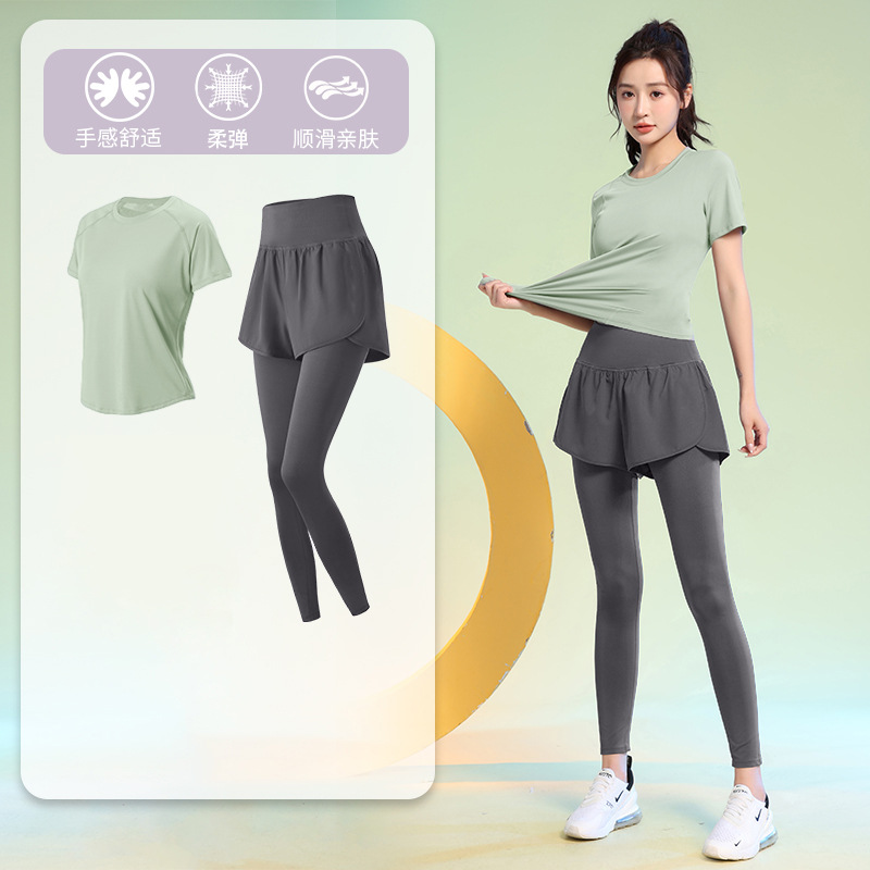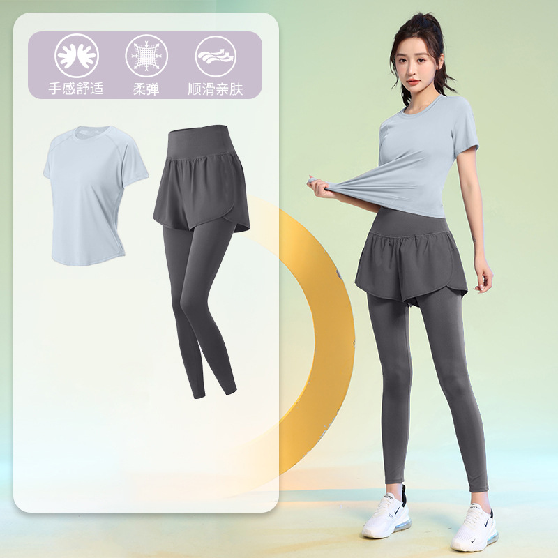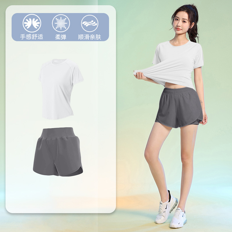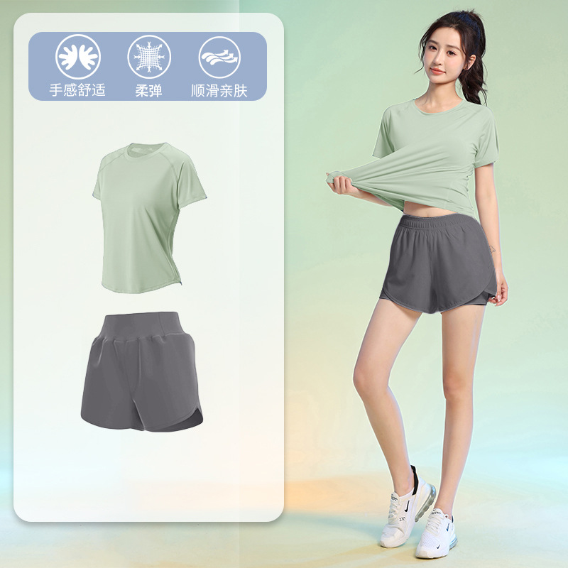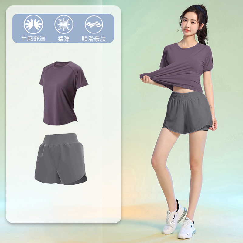 여름 얇은 야외 스포츠 세트 여성의 피트니스 느슨한 슬리밍 요가 옷 짧은 소매 탄성 빠른 건조 옷 달리기 옷스토어 가기