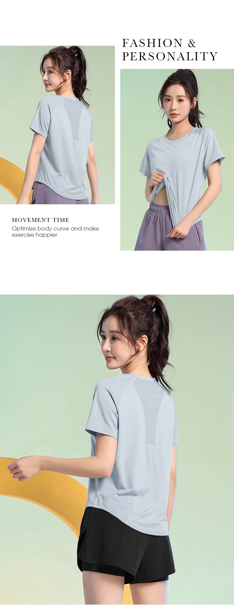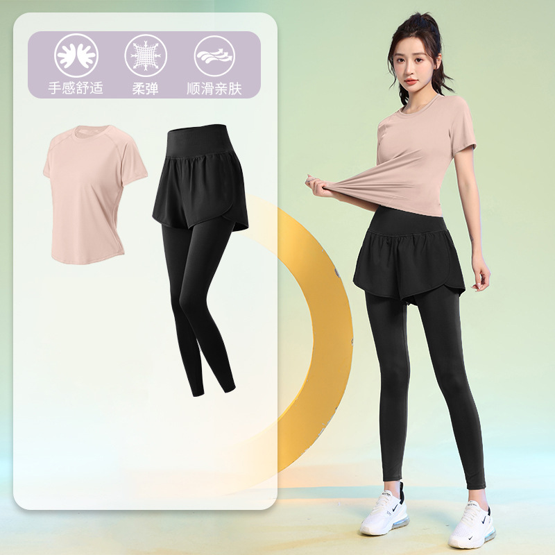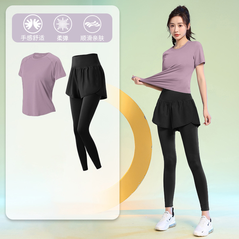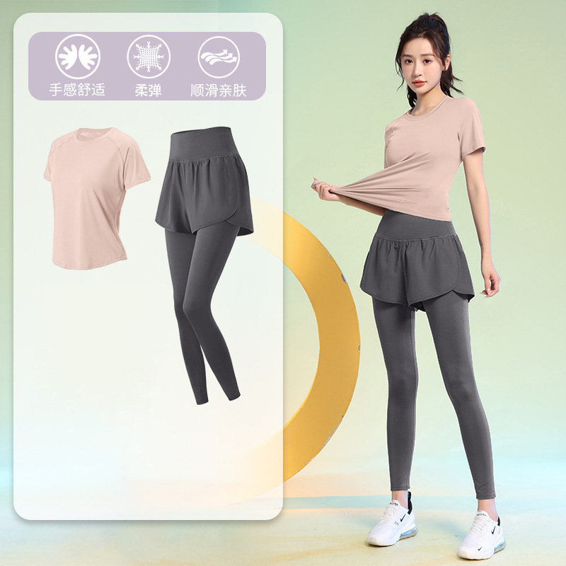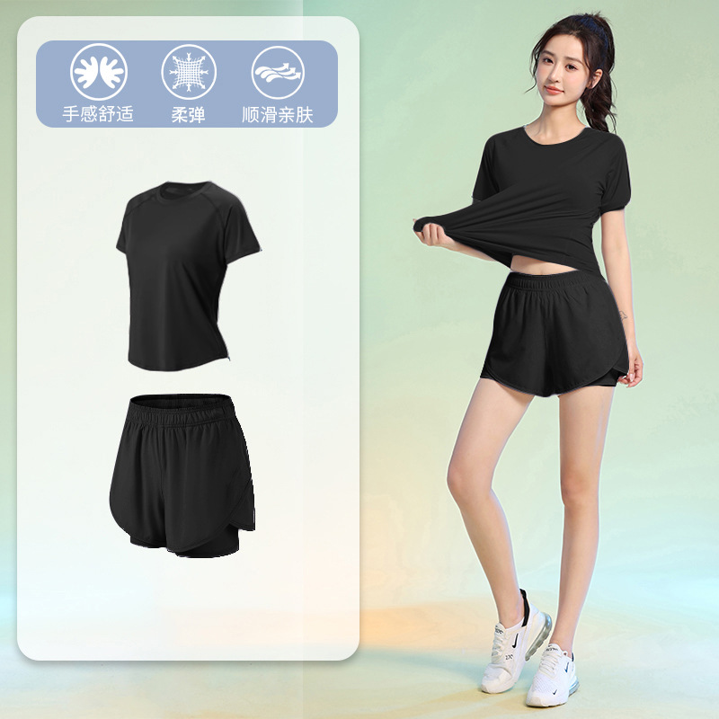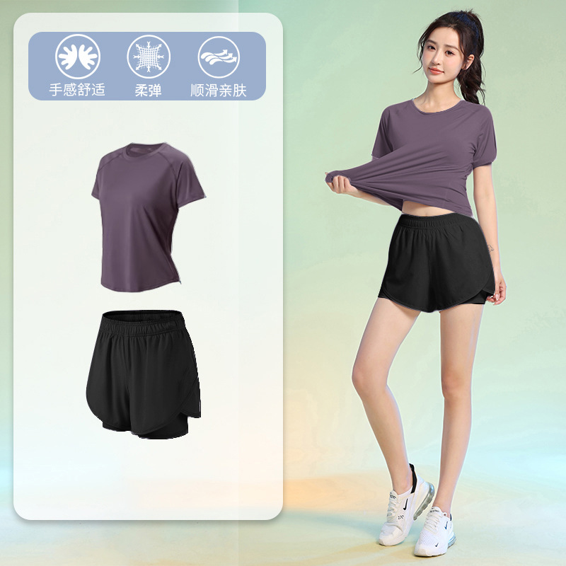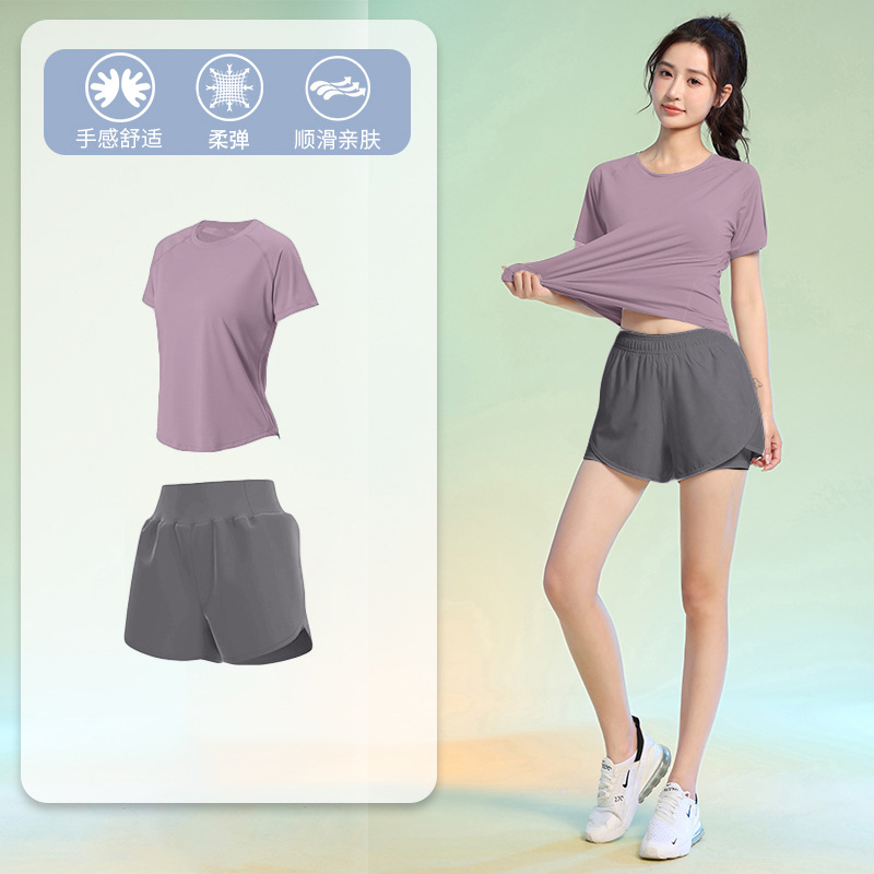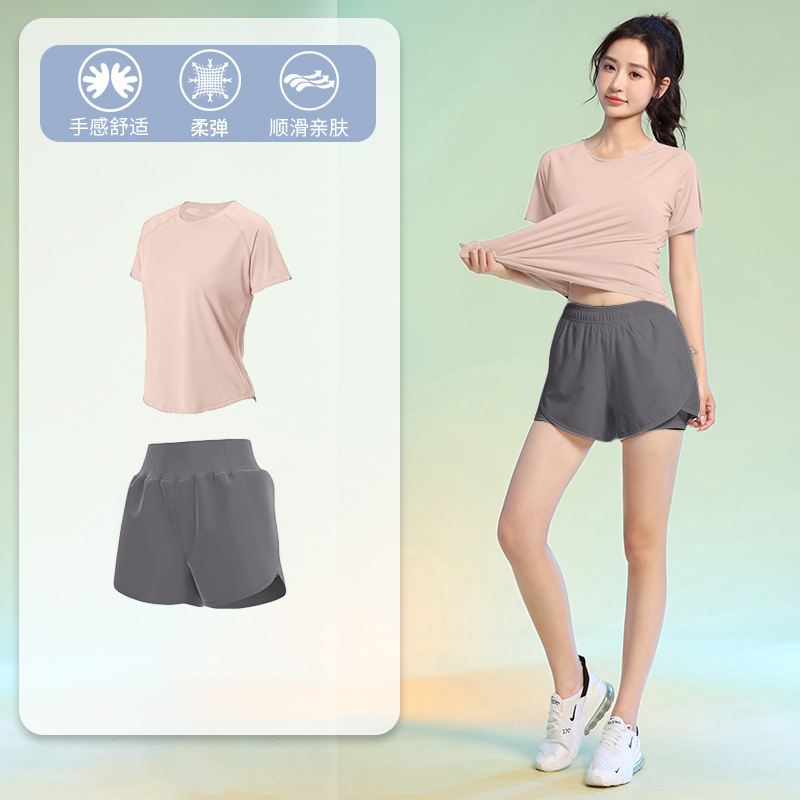 여름 얇은 야외 스포츠 세트 여성의 피트니스 느슨한 슬리밍 요가 옷 짧은 소매 탄성 빠른 건조 옷 달리기 옷