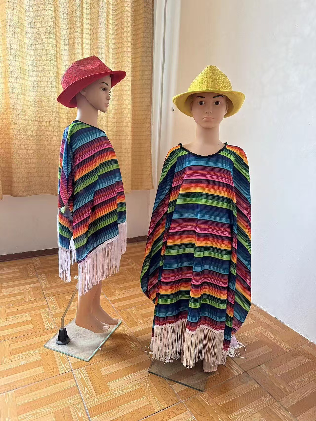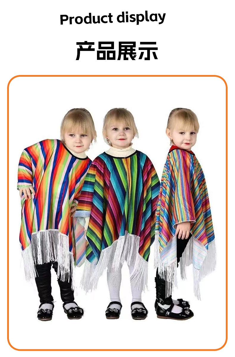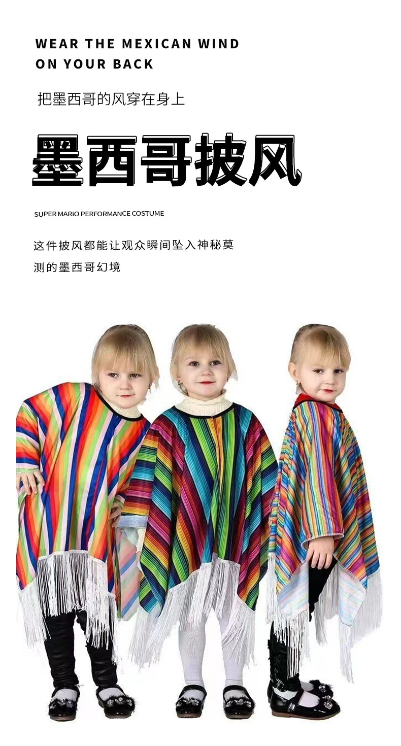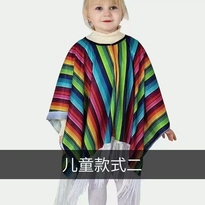 멕시코 민족 망토 다채로운 줄무늬 프린지 숄 코스프레 축제 파티 어린이 성인 공연 의상