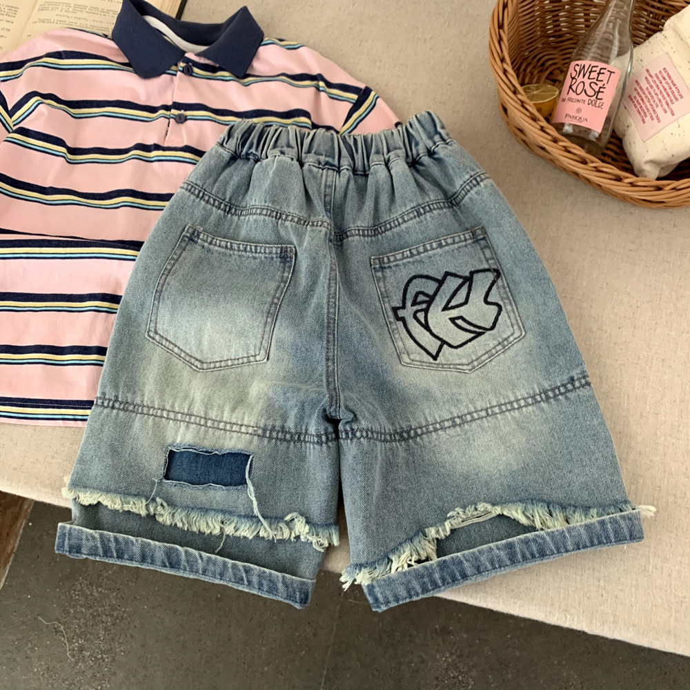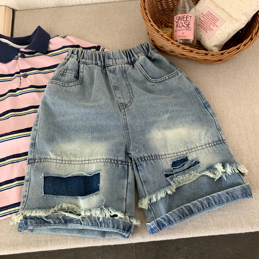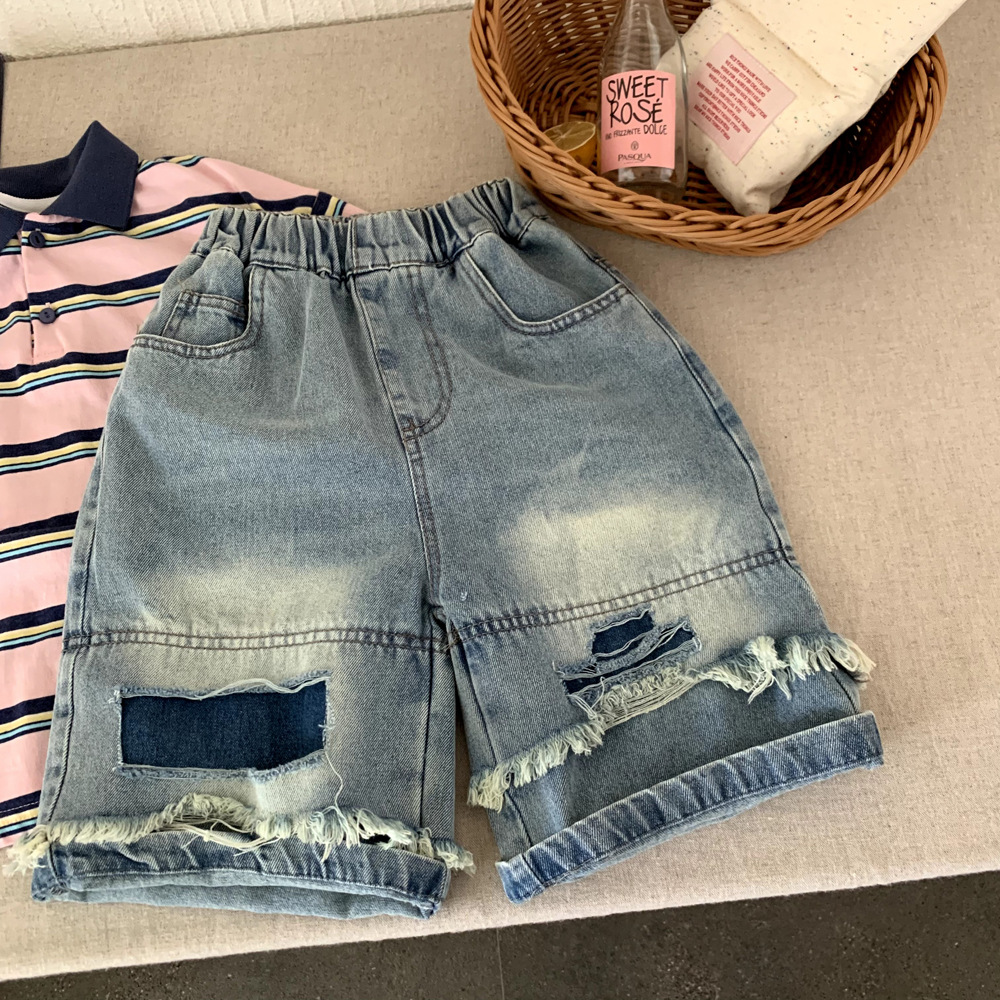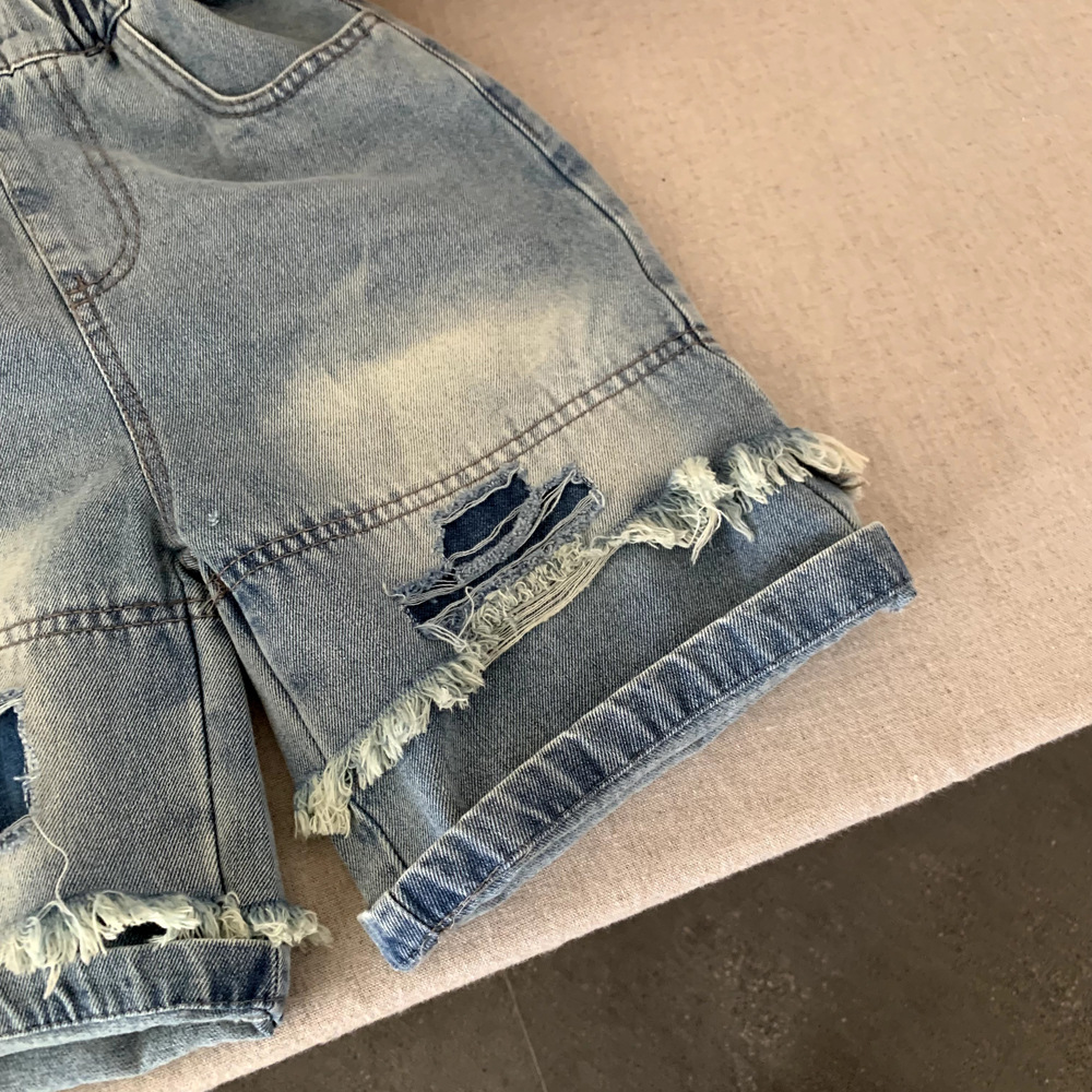 소년 데님 반바지 여름 2025 새로운 어린이 여름 잘 생긴 찢어진 바지 아기 얇은 느슨한 겉옷