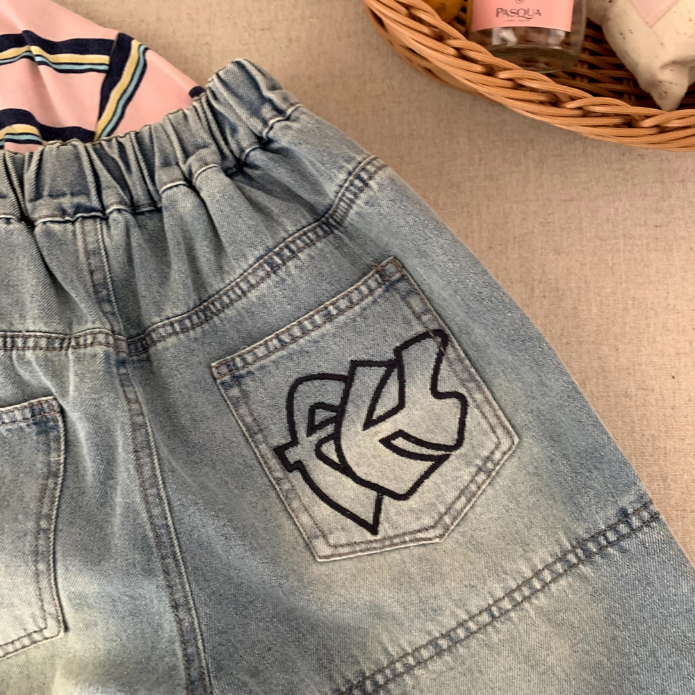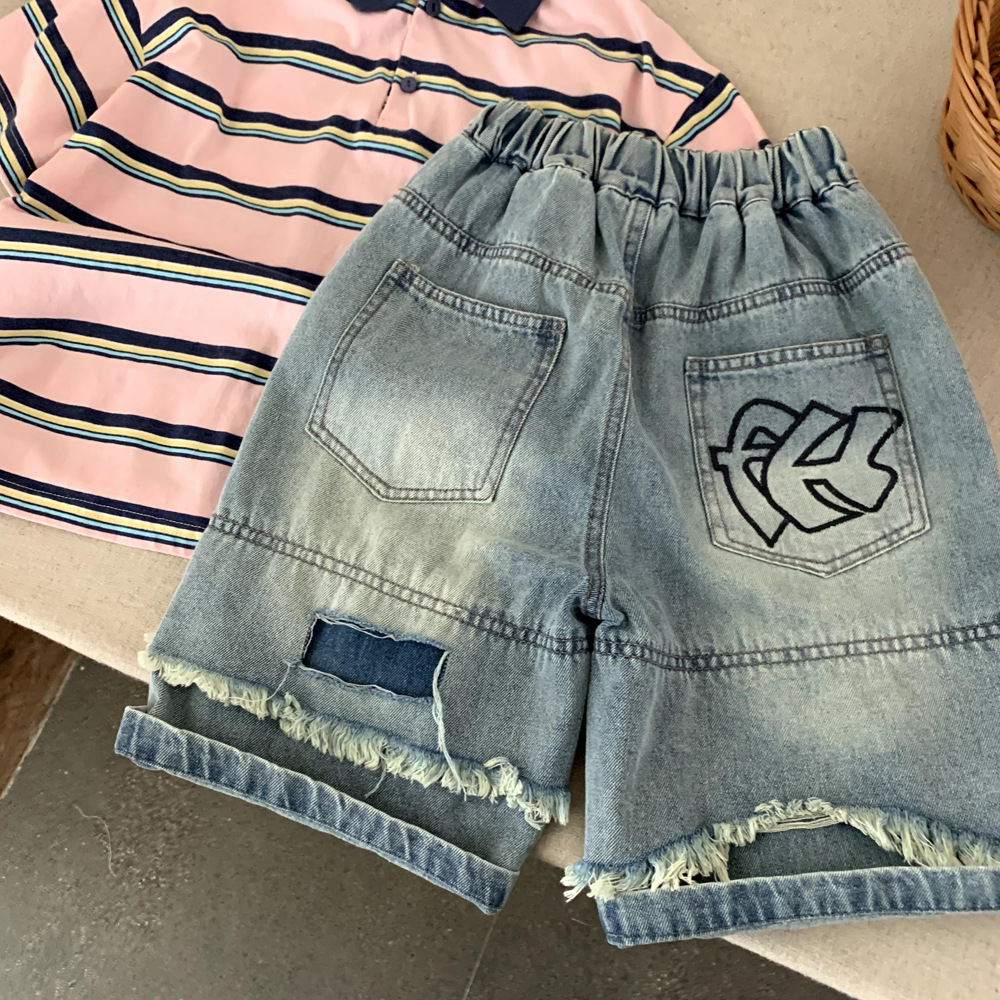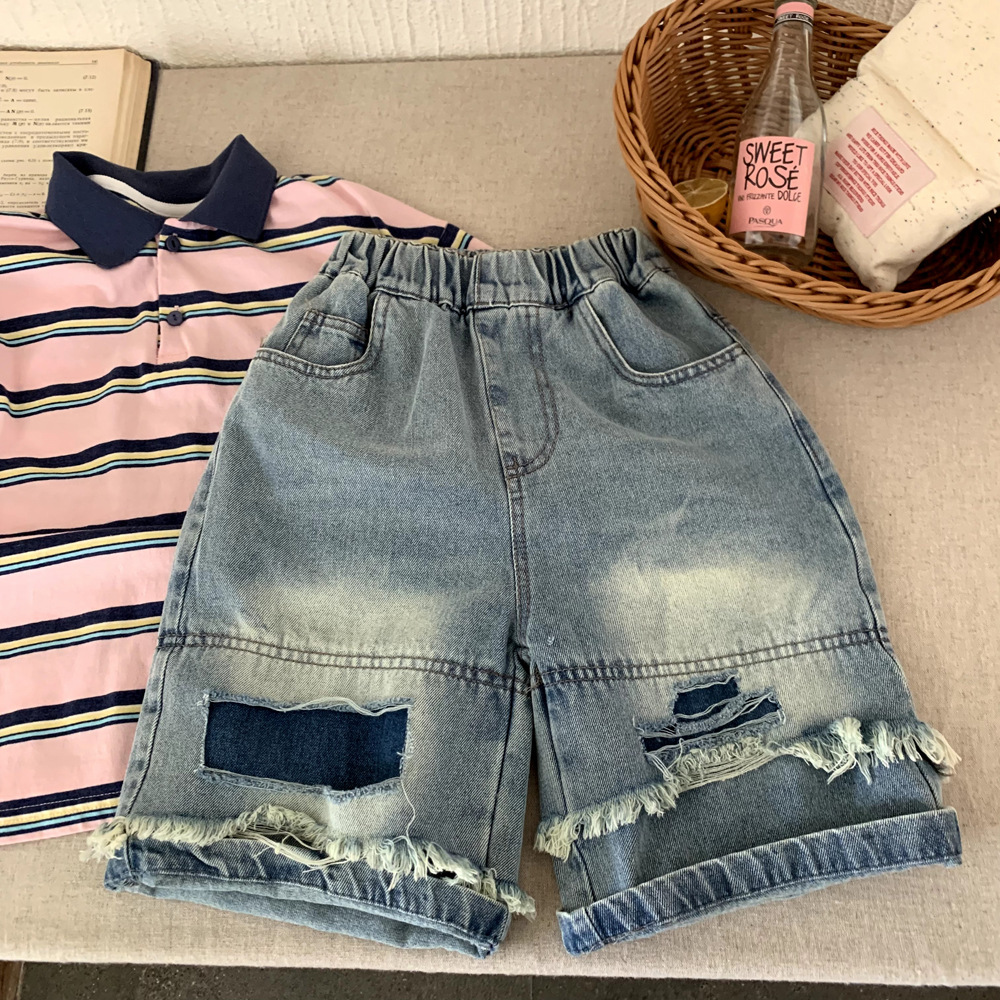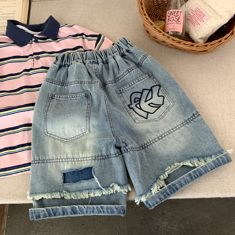 소년 데님 반바지 여름 2025 새로운 어린이 여름 잘 생긴 찢어진 바지 아기 얇은 느슨한 겉옷