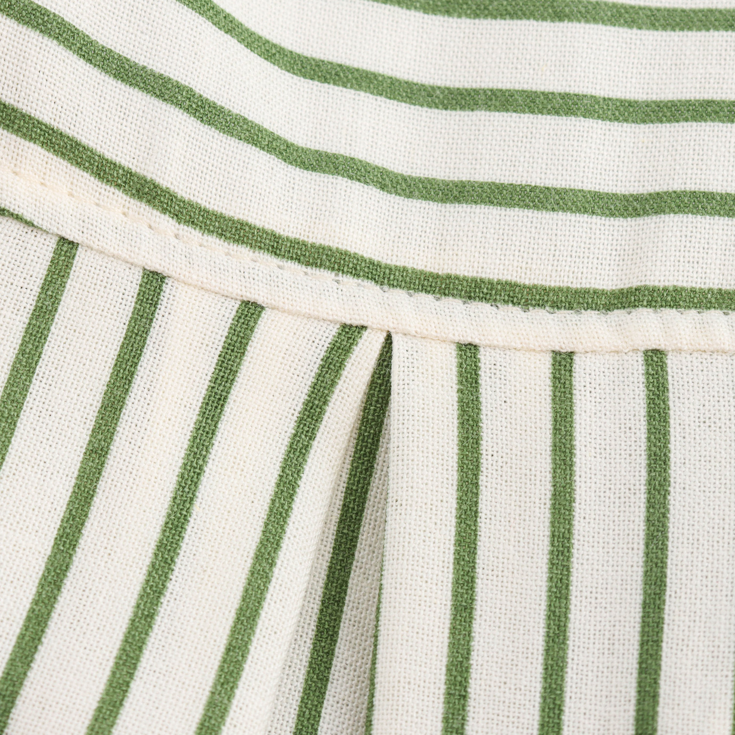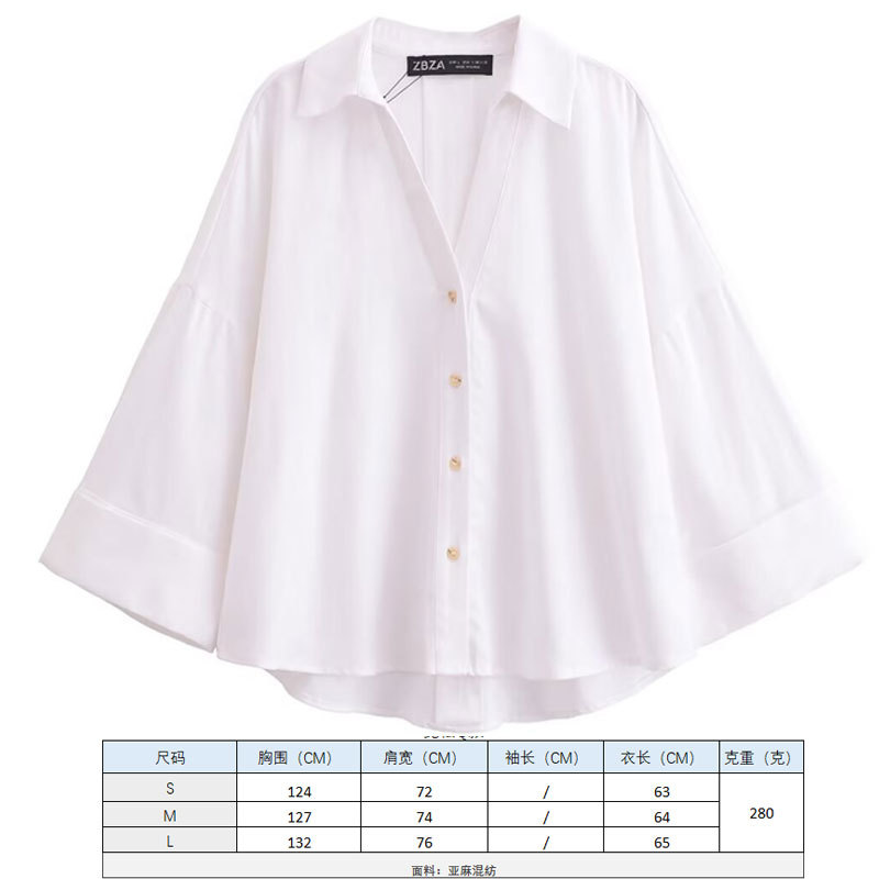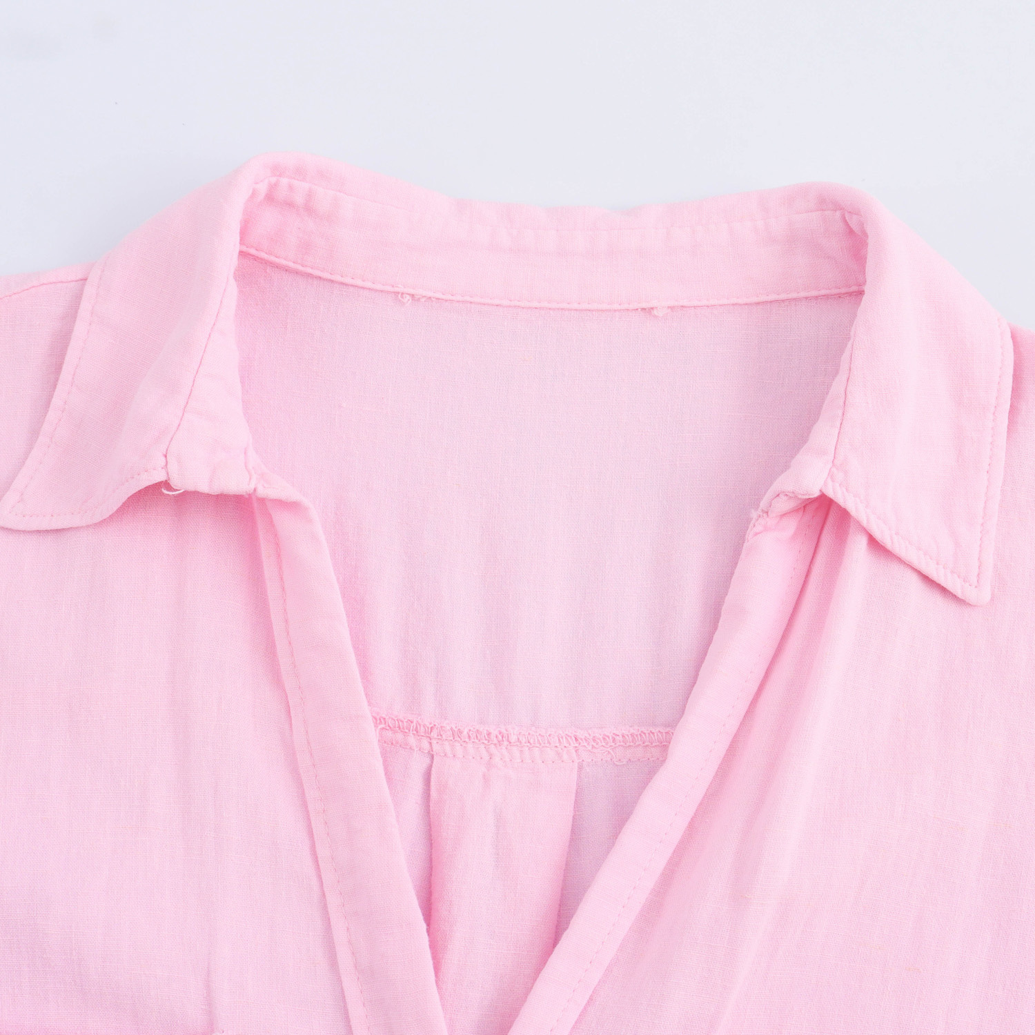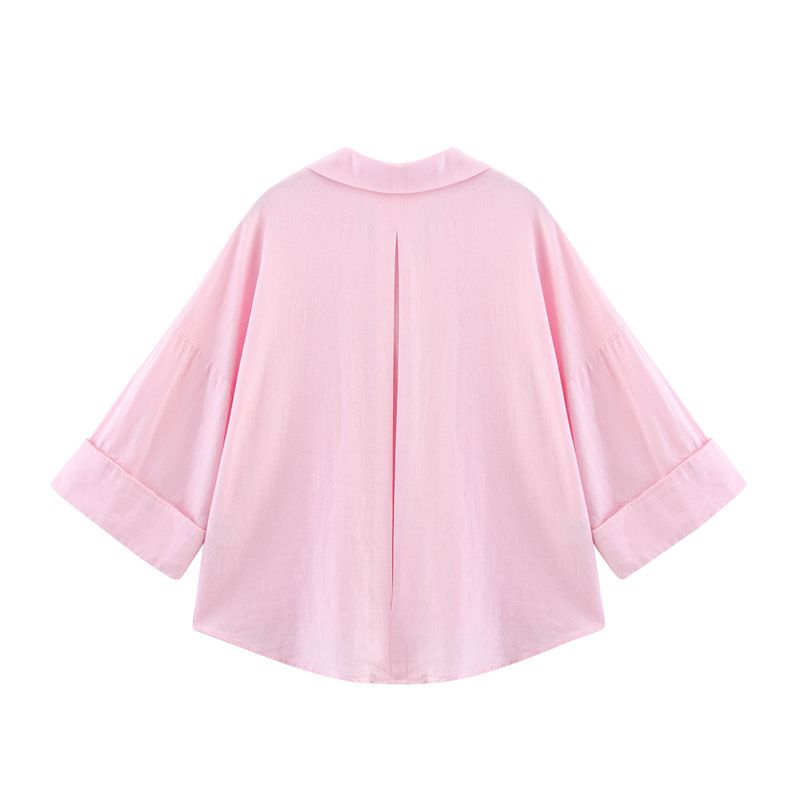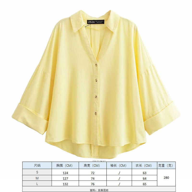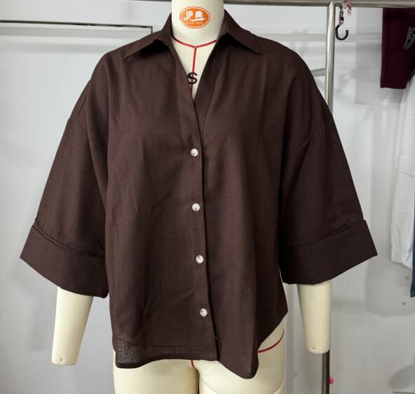 국경 간 2025 봄 여름 새로운 여성 의류 유럽과 미국 스타일의 패션 캐주얼 다목적 옷깃 스트라이프 와이드 슬리브 셔츠 여성 면화와 린넨