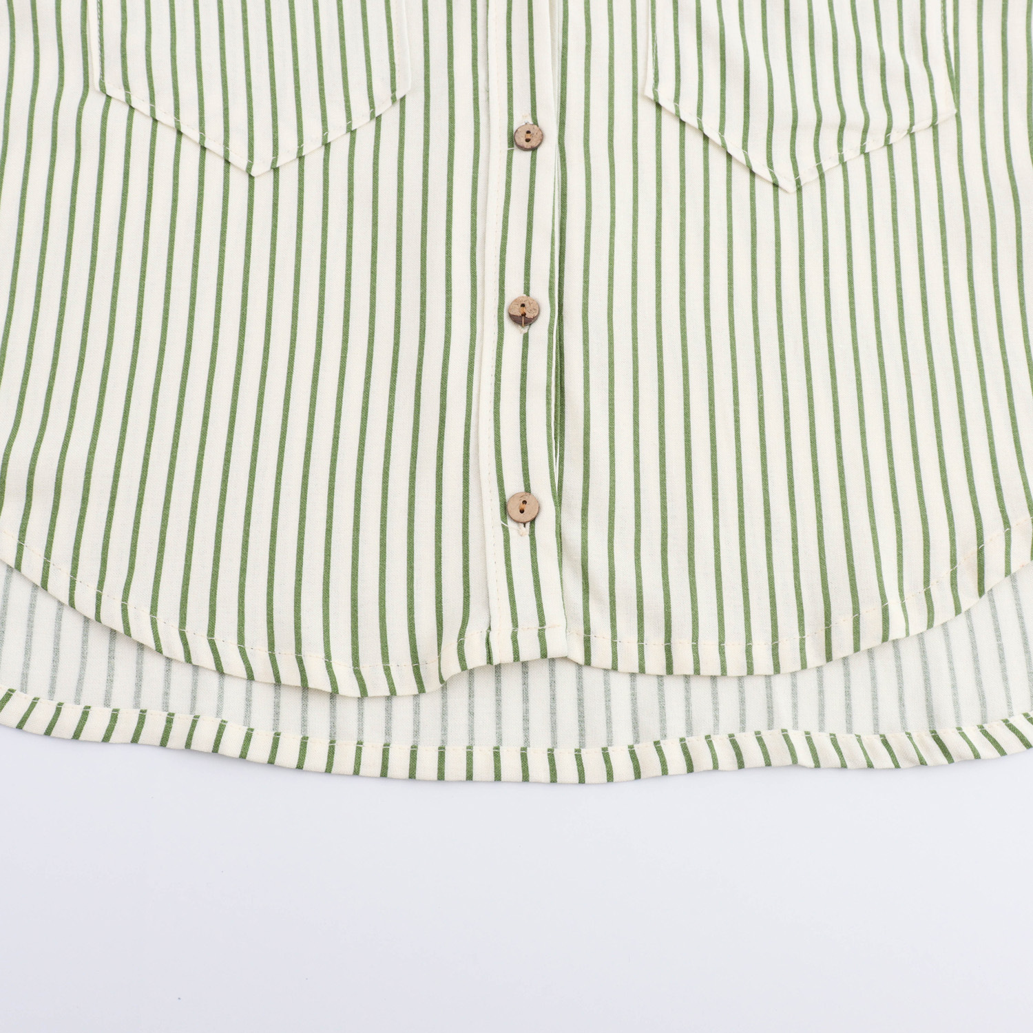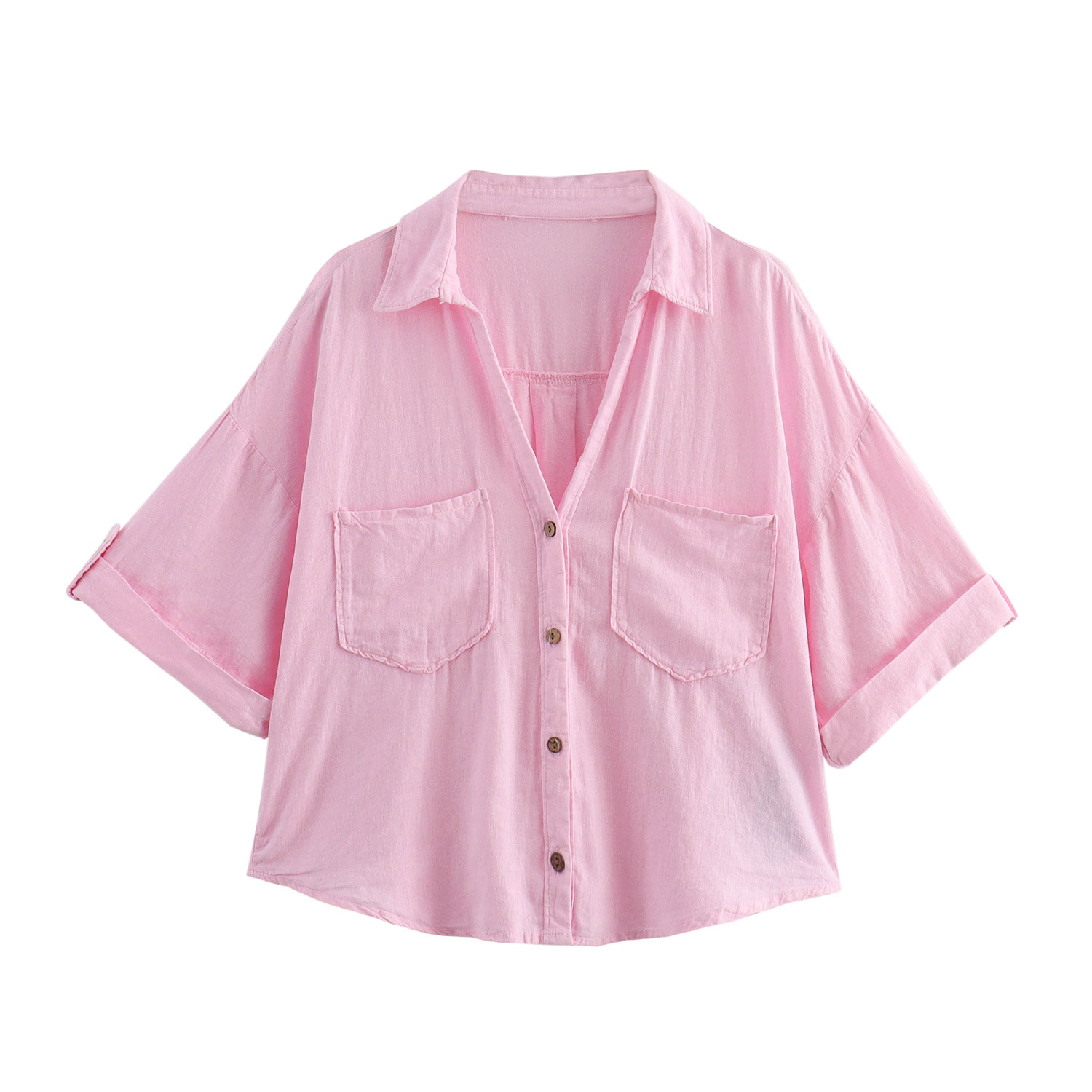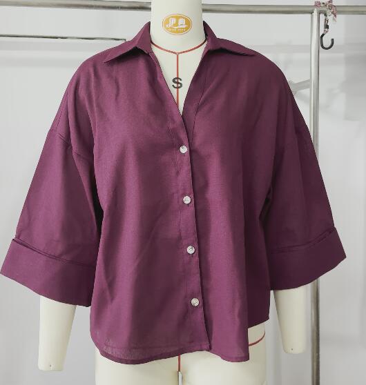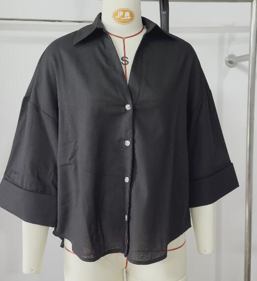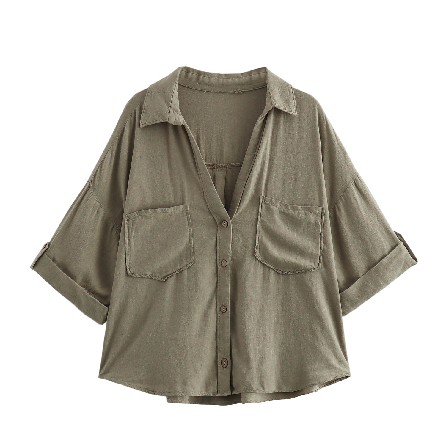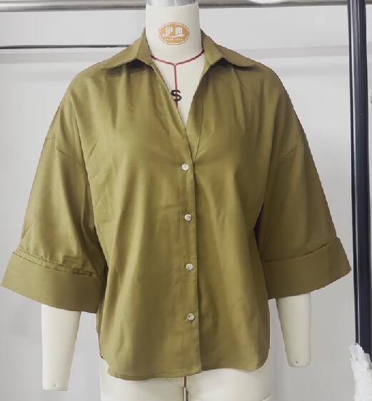 국경 간 2025 봄 여름 새로운 여성 의류 유럽과 미국 스타일의 패션 캐주얼 다목적 옷깃 스트라이프 와이드 슬리브 셔츠 여성 면화와 린넨