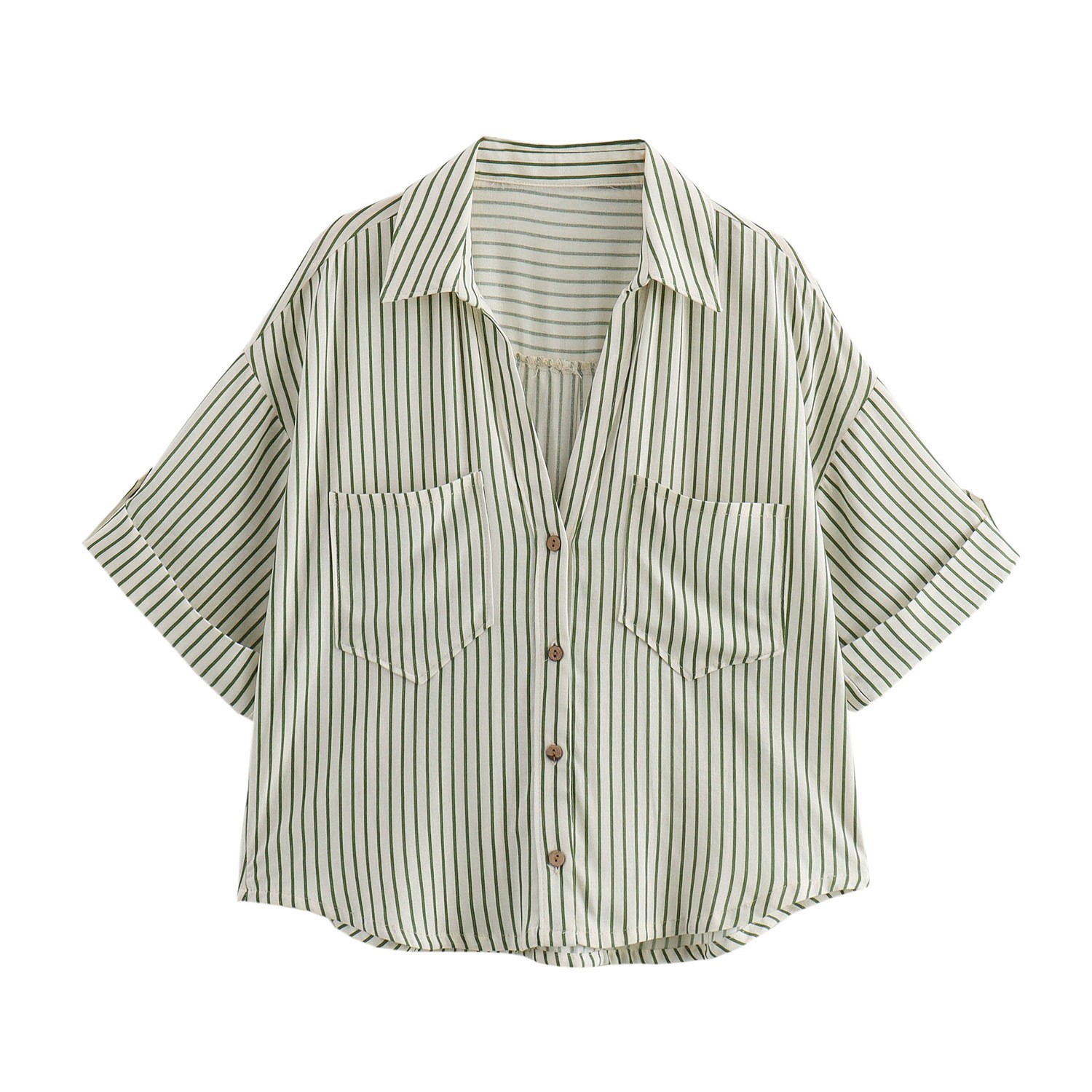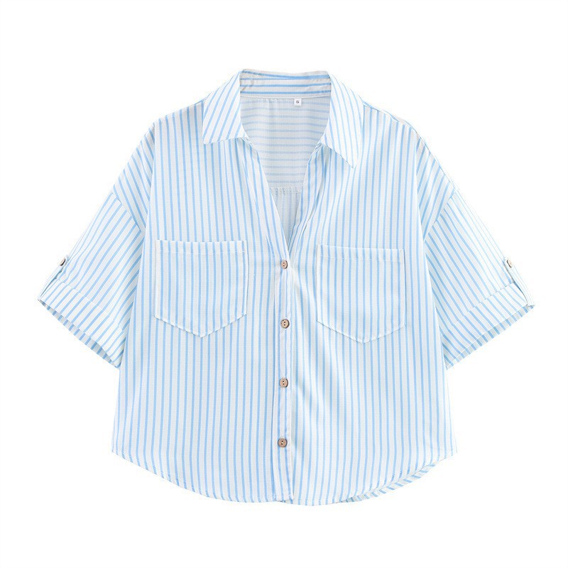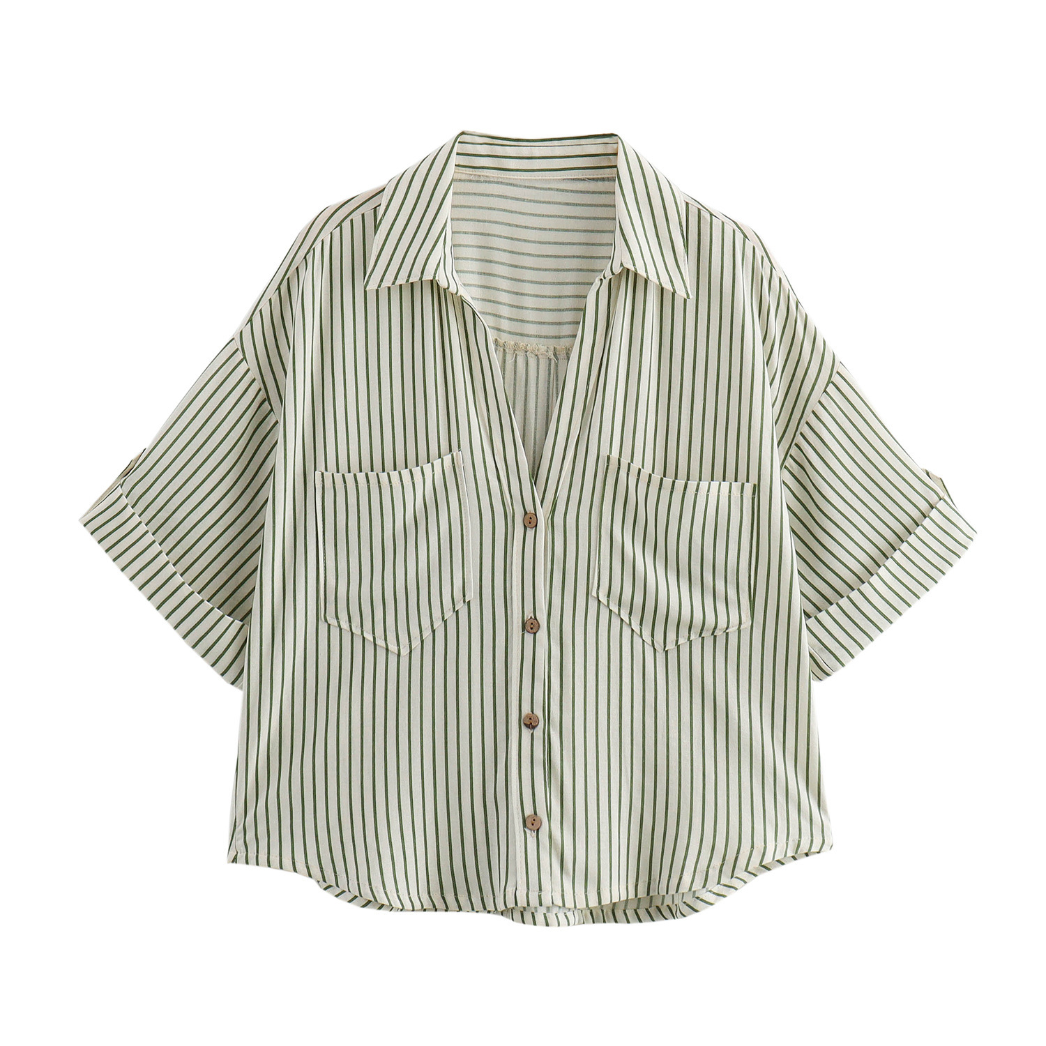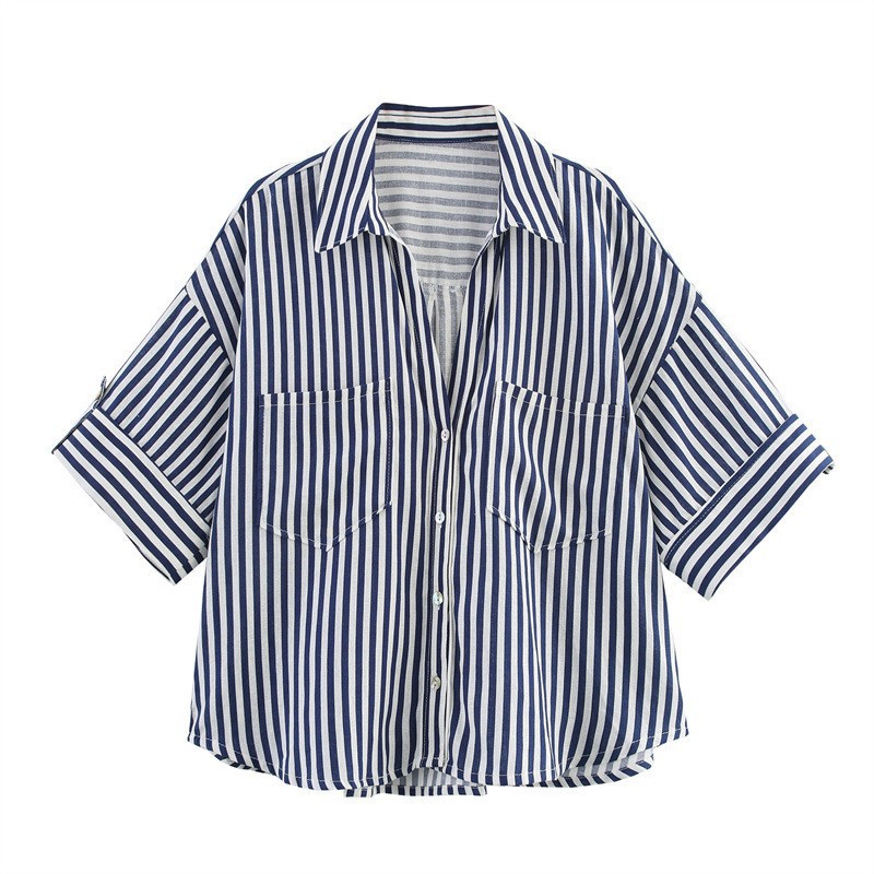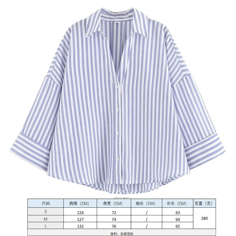 국경 간 2025 봄 여름 새로운 여성 의류 유럽과 미국 스타일의 패션 캐주얼 다목적 옷깃 스트라이프 와이드 슬리브 셔츠 여성 면화와 린넨스토어 가기