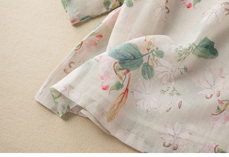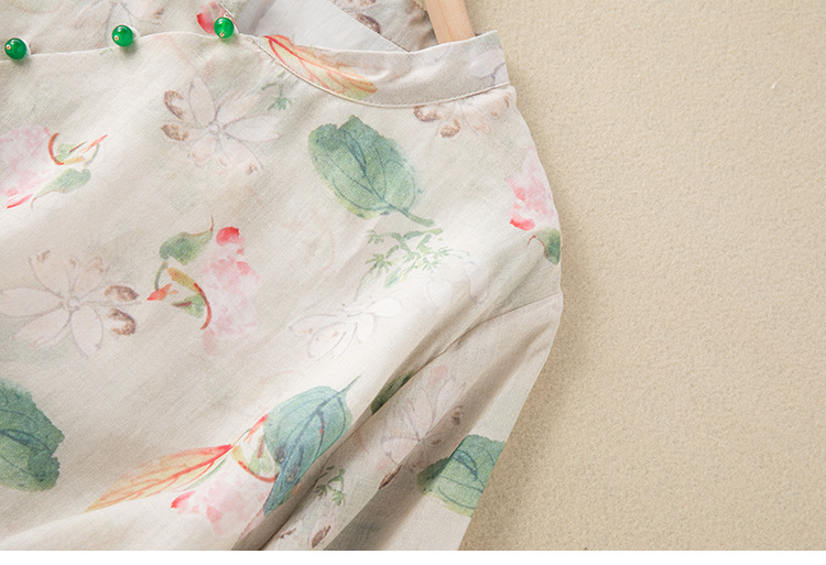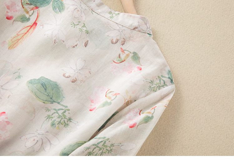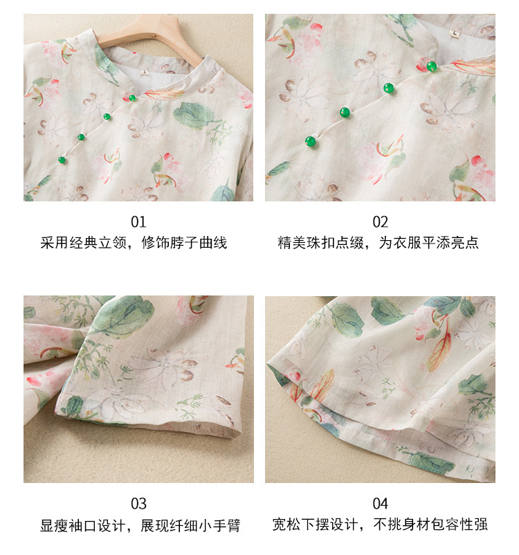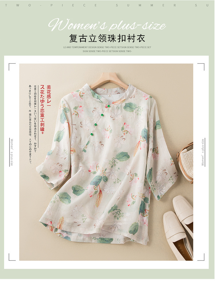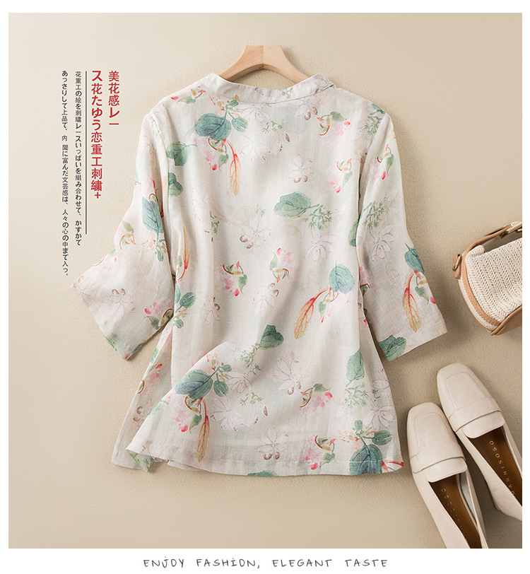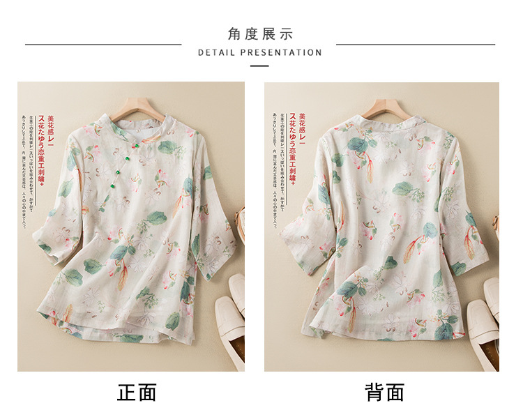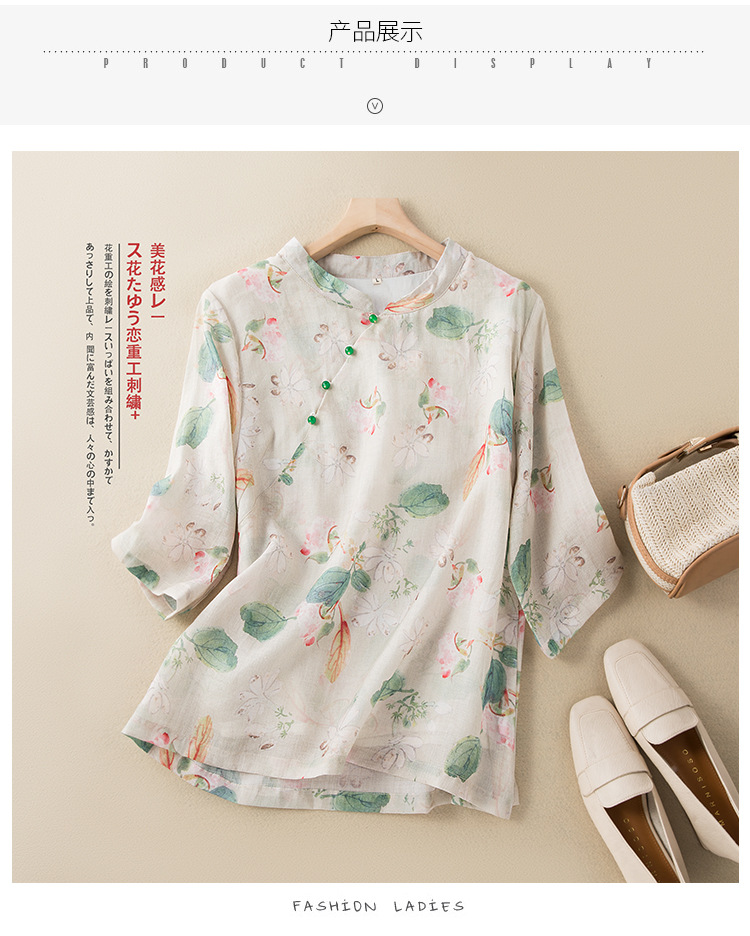 2023 새로운 여성 셔츠 중국 스타일 수직 칼라 인쇄 탑 풀오버 레트로 중국 선 리넨 여성 의류스토어 가기