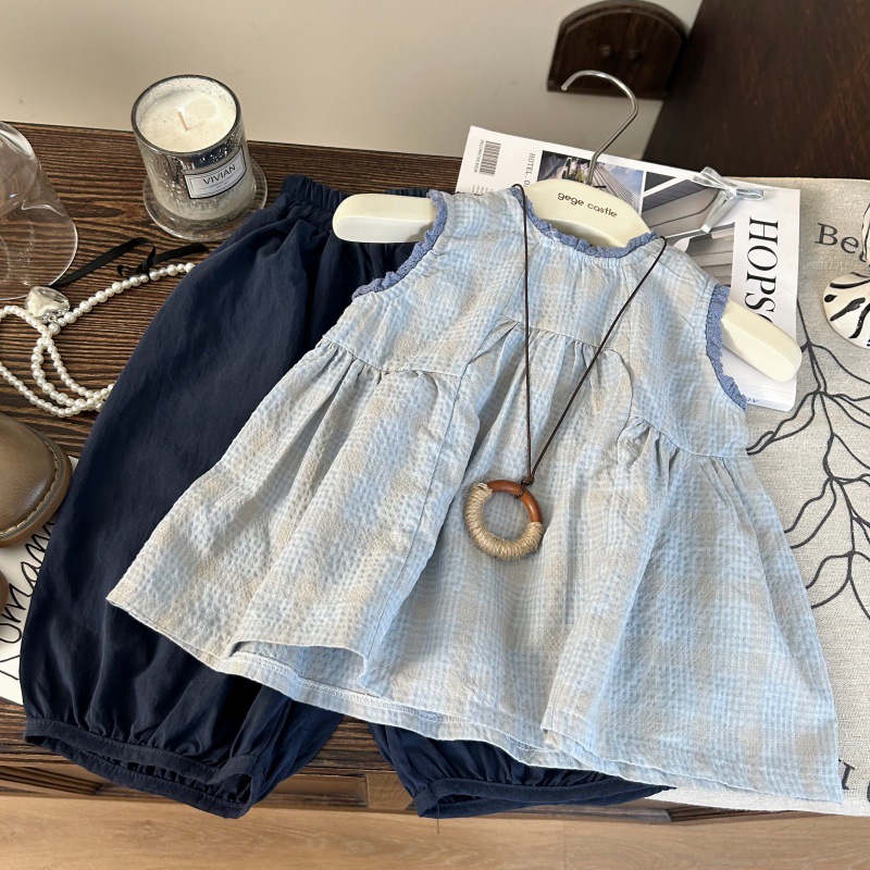 어린이 의류의 한국판 2025 새로운 여름 소녀 민소매 격자 무늬 셔츠 어린이 네이비 블루머 투피스 패션스토어 가기
