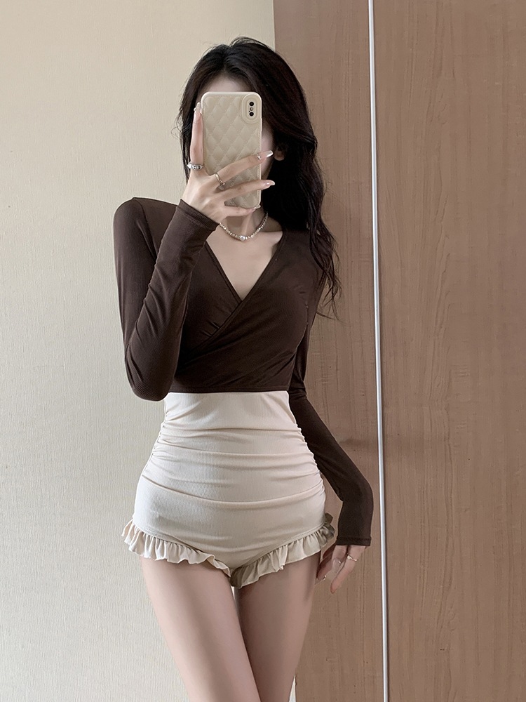 수영복 소녀의 슬리밍 순수한 자외선 차단제 긴 소매 V-Neck 섹시한 블라우스 투피스 수영복 뜨거운 봄 휴일 커피