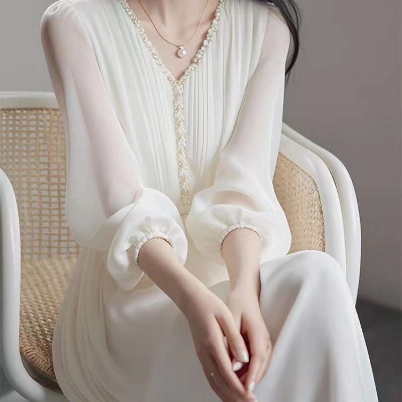 이른 가을 프랑스 빛 고급 고급 하이 엔드 느낌 잘 생긴 공식 행사 기질 절대적으로 가짜 흰색 쉬폰 원피스 여름스토어 가기
