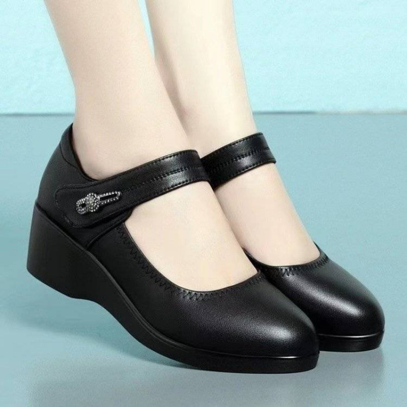 봄, 가을 여성용 웨지힐 신발 중년 및 노년층 엄마를 위한 새로운 부드러운 가죽 부드러운 밑창 원형 발가락 미끄럼 방지 가죽 신발스토어 가기