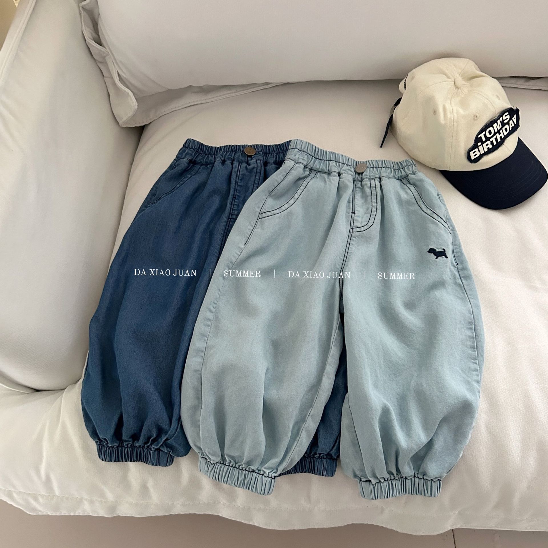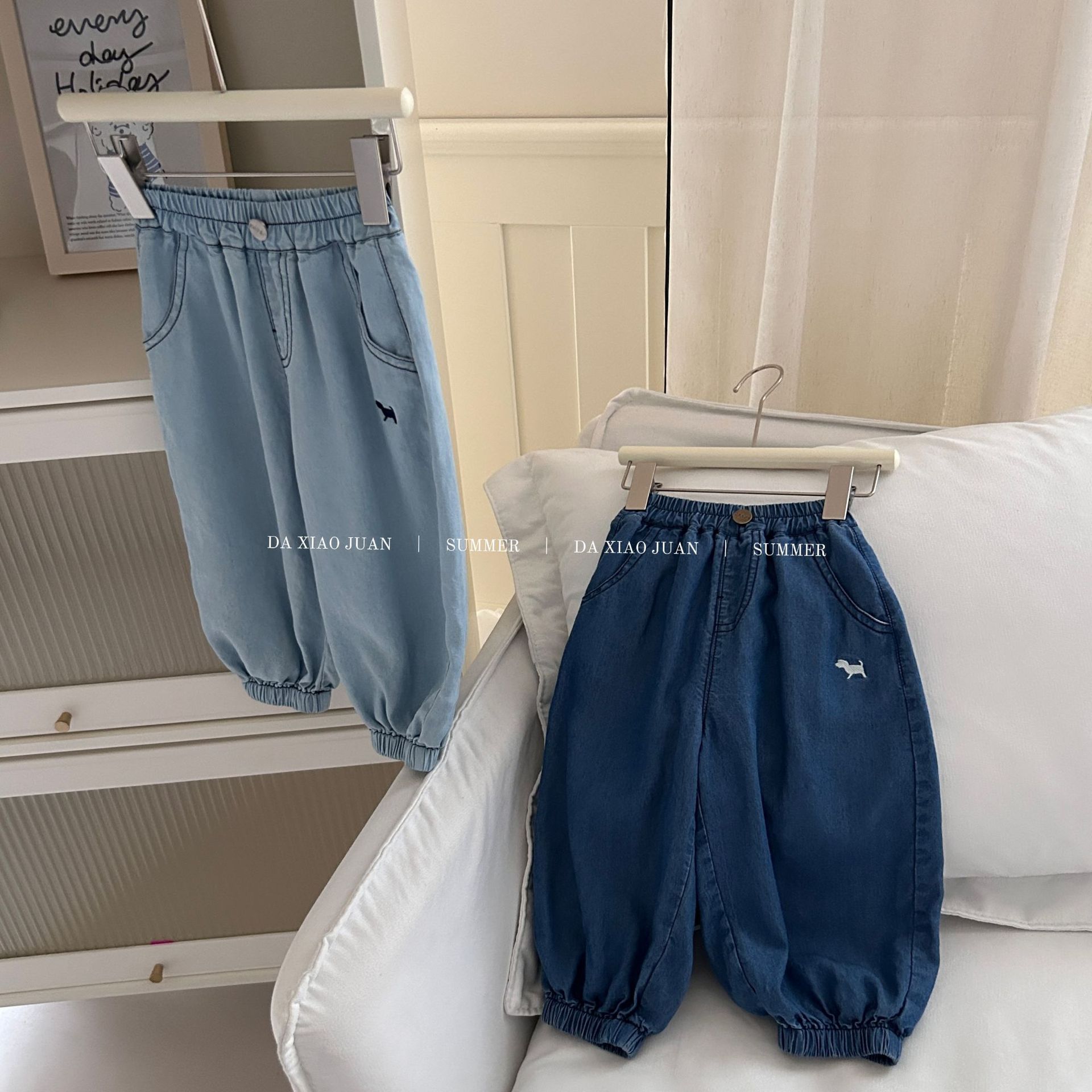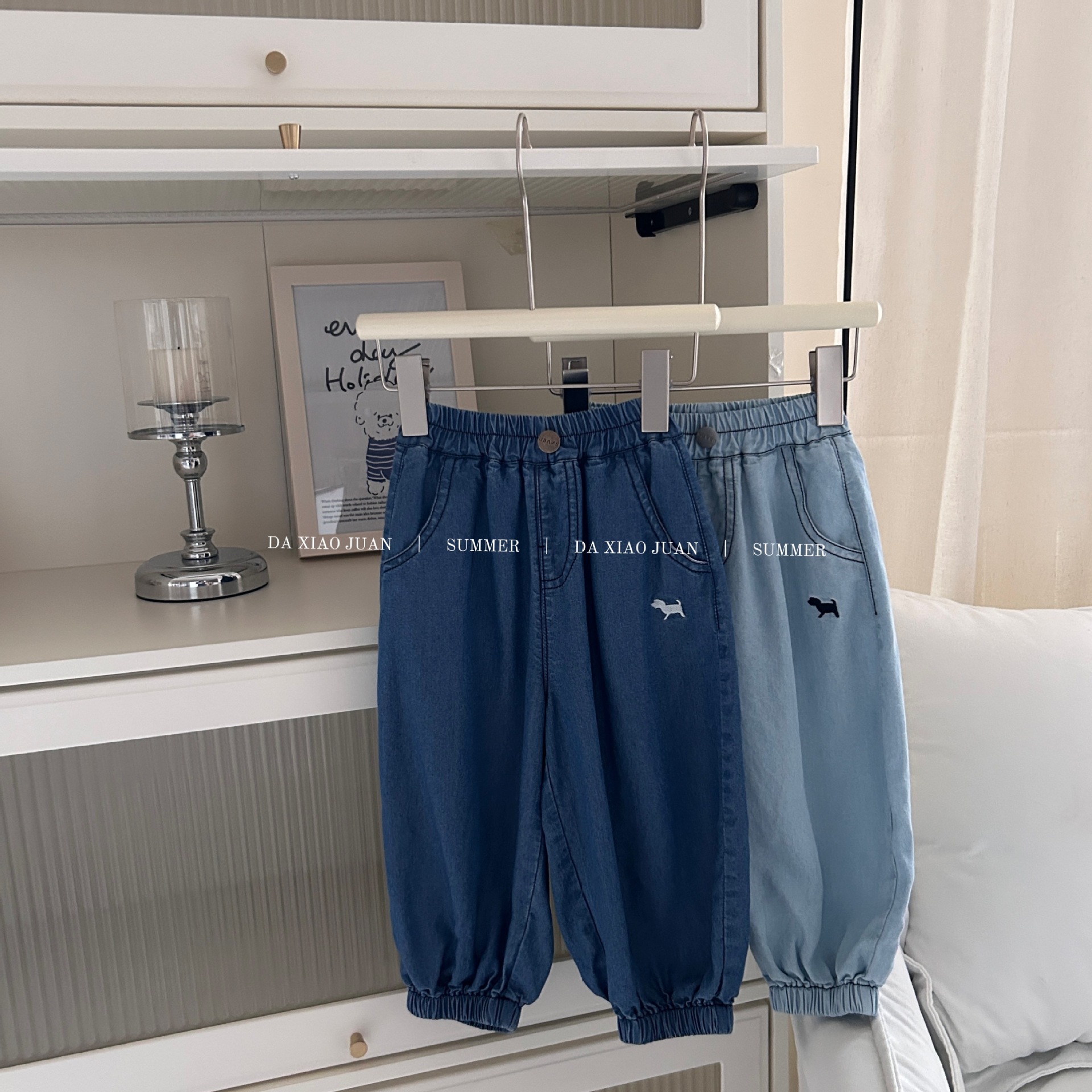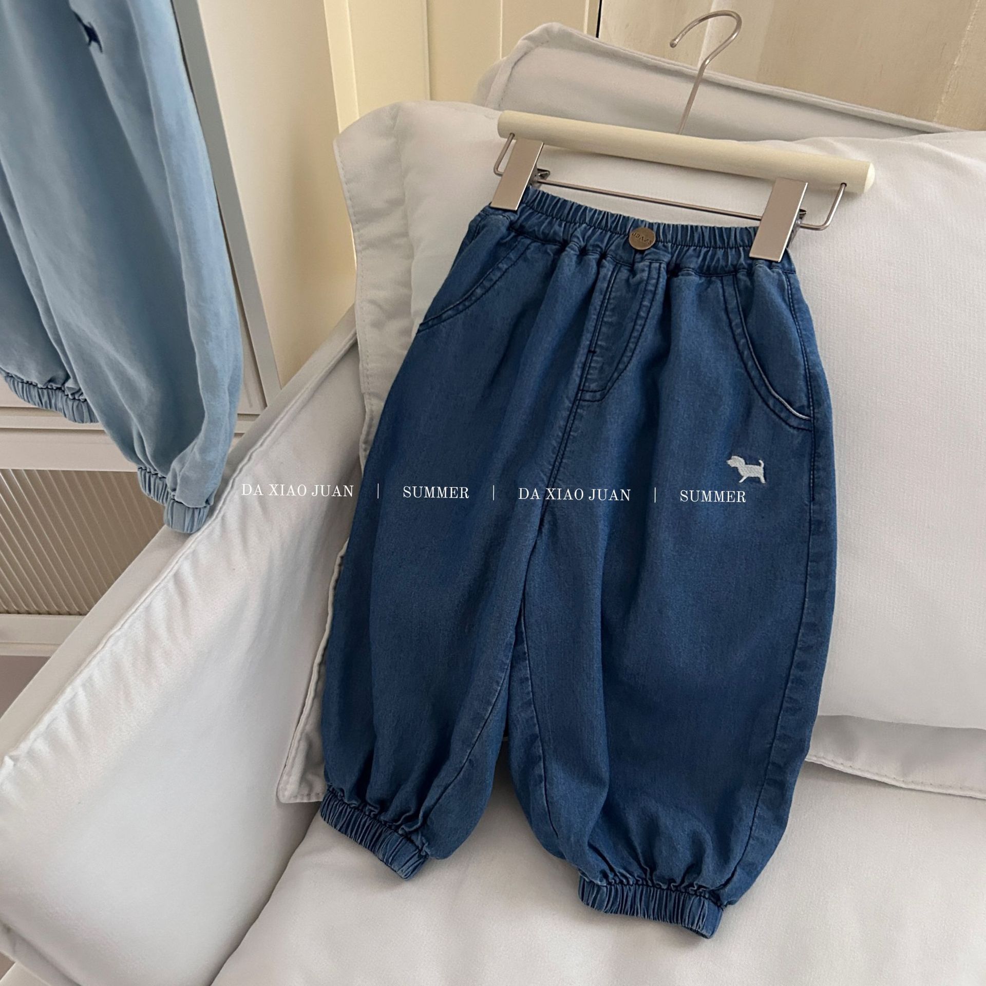 스팟 사이즈 롤 25 여름 스타일 소년 강아지 솔리드 컬러 텐셀 얇은 데님 캐주얼 바지 루즈한 아동 바지스토어 가기