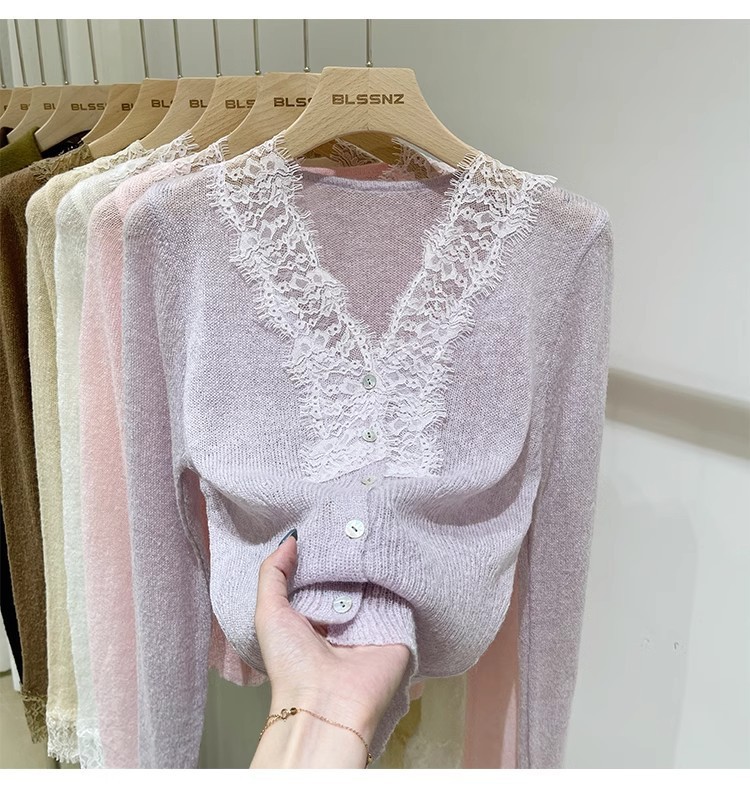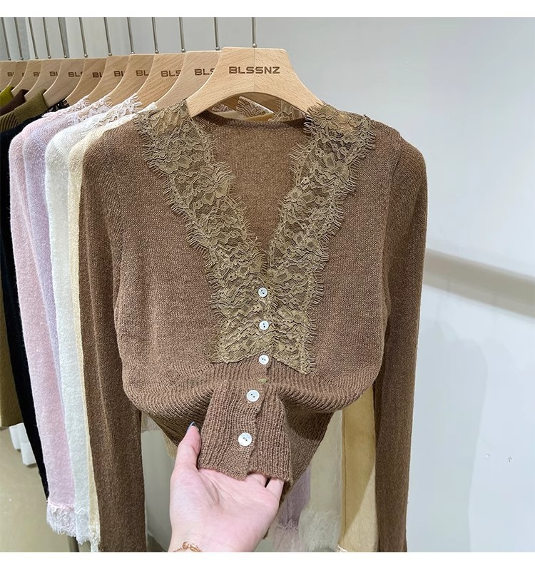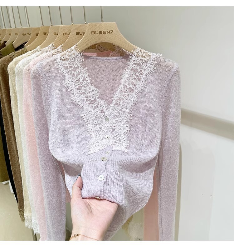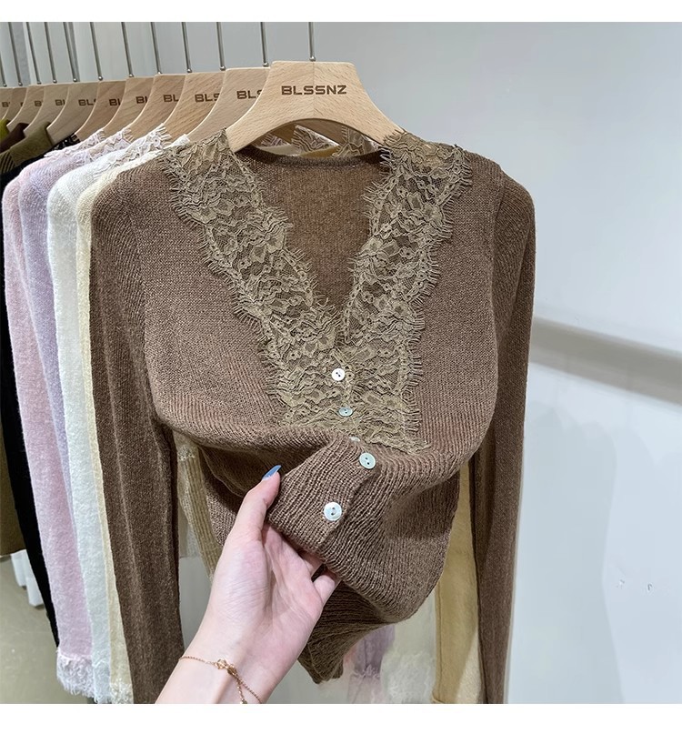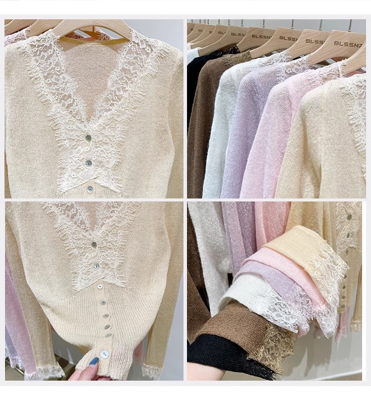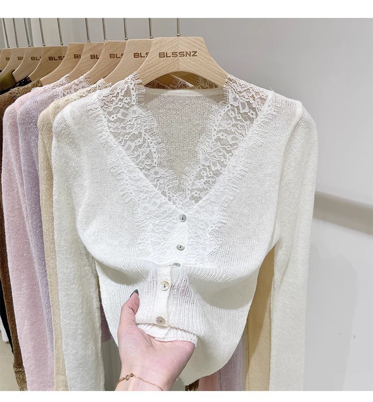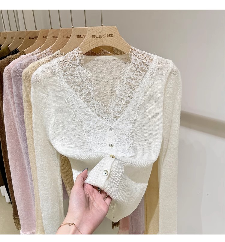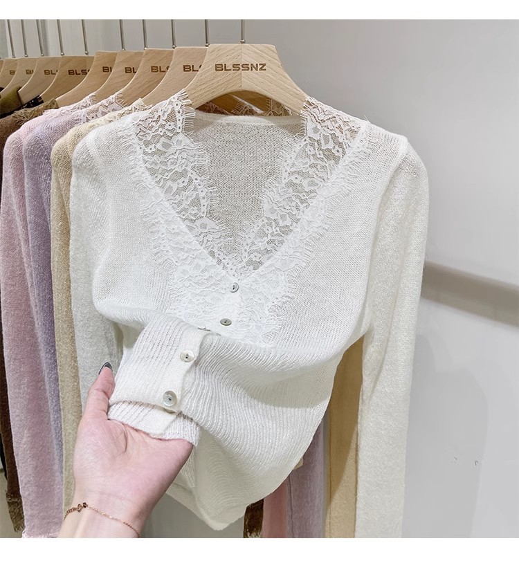 화이트 브이넥 레이스 디자인 밑단 셔츠, 봄, 가을 니트 가디건, 여성용 겨울용 젠틀 스웨터와 시크한 탑스토어 가기