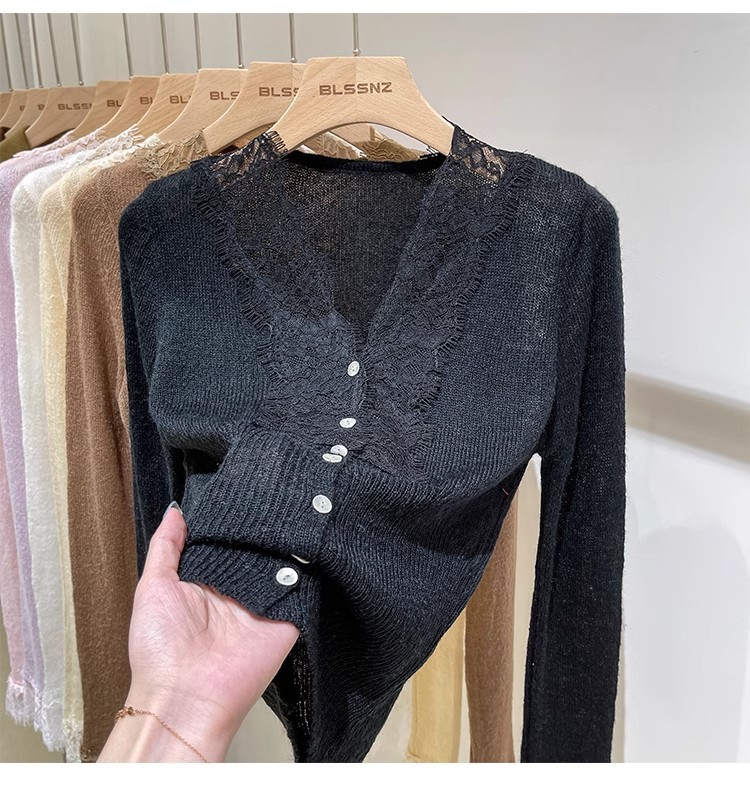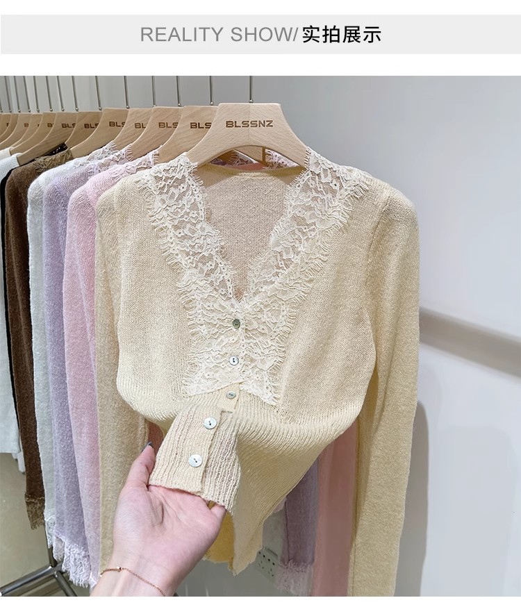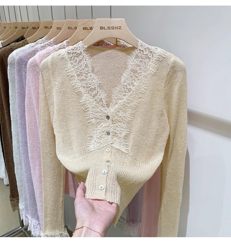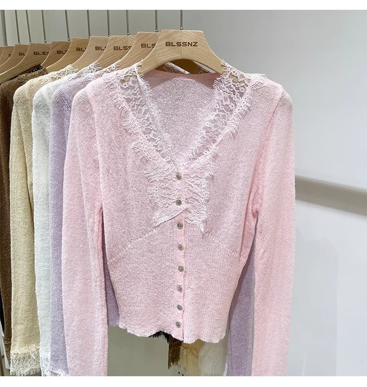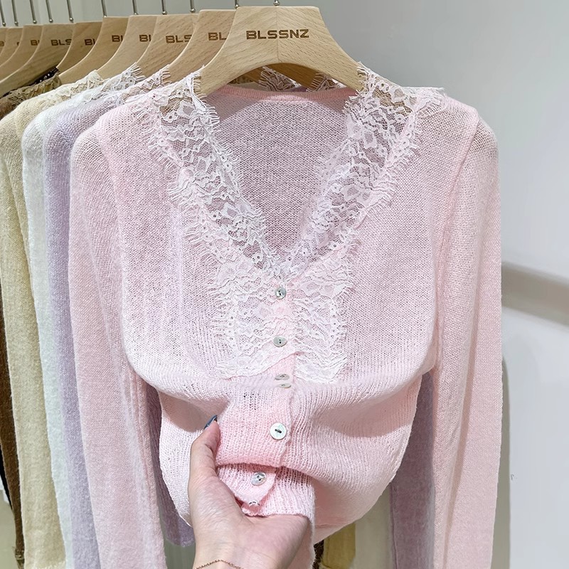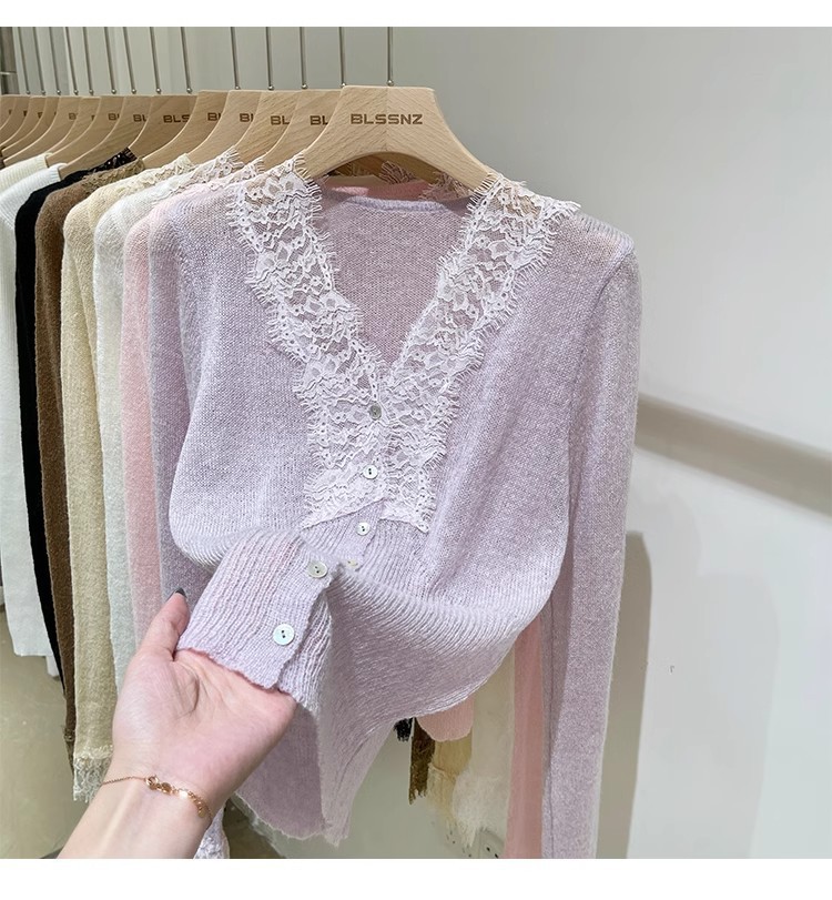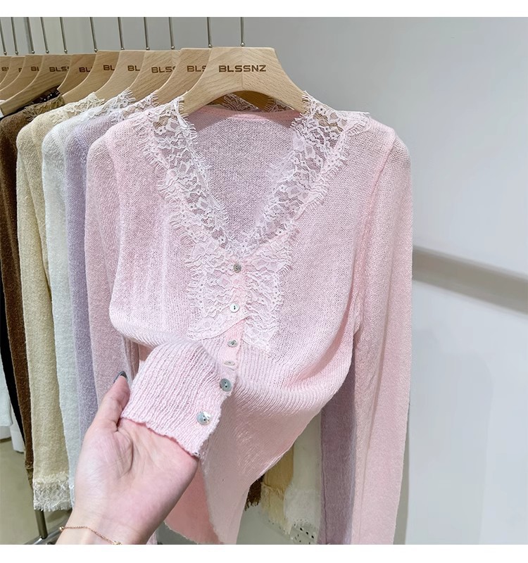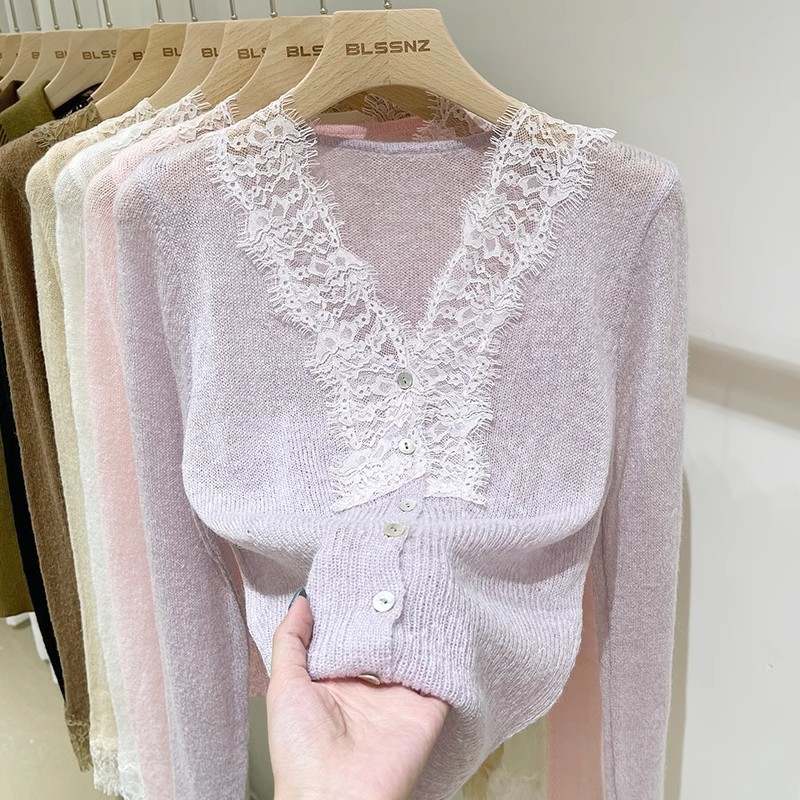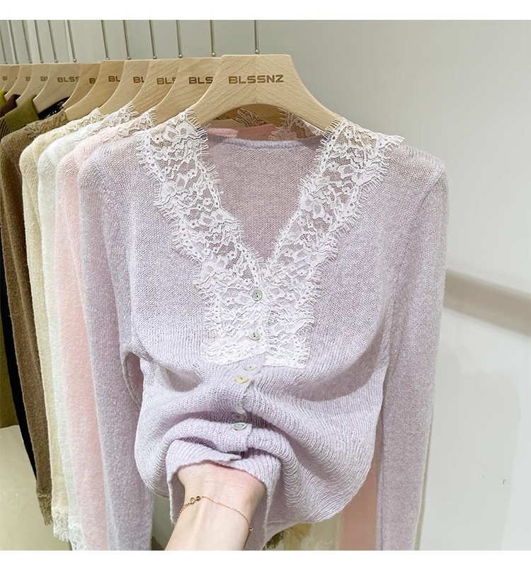 화이트 브이넥 레이스 디자인 밑단 셔츠, 봄, 가을 니트 가디건, 여성용 겨울용 젠틀 스웨터와 시크한 탑스토어 가기