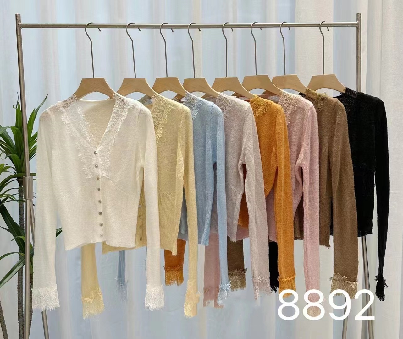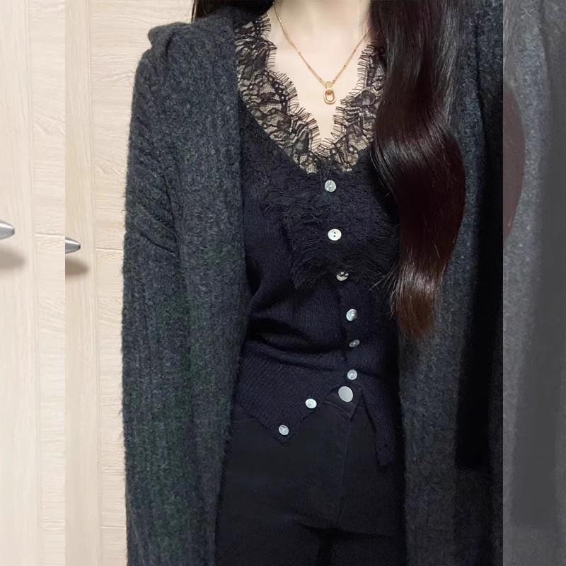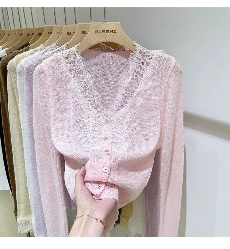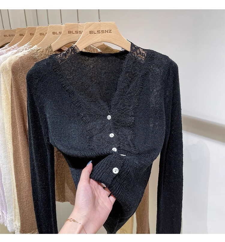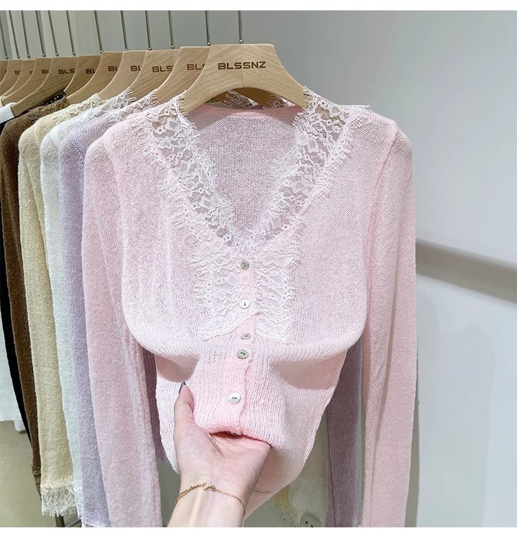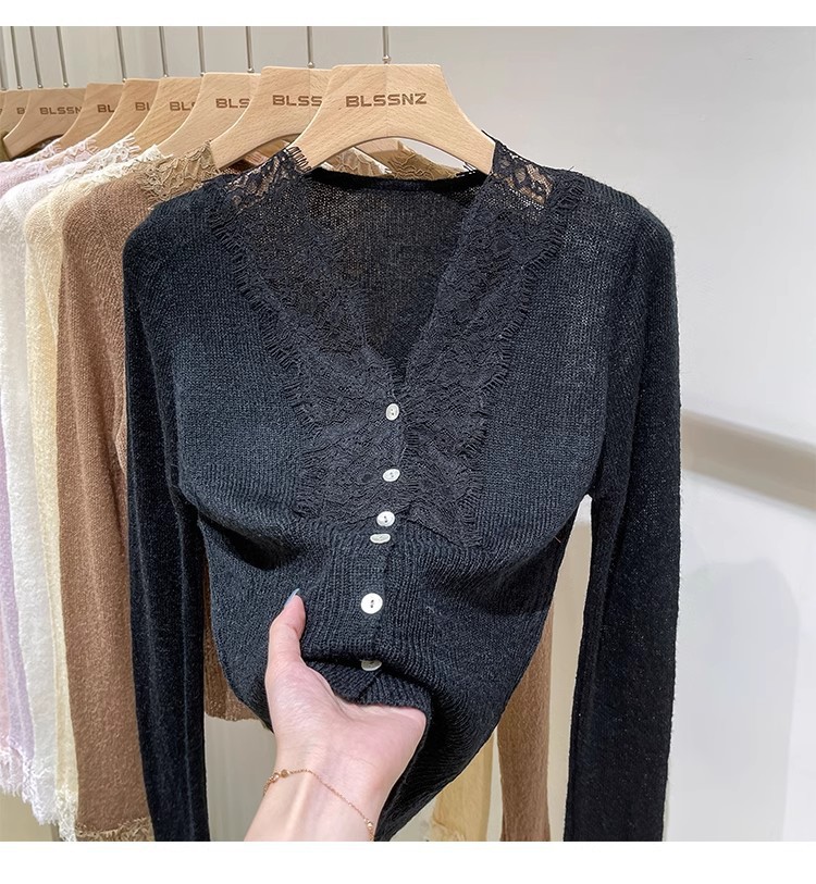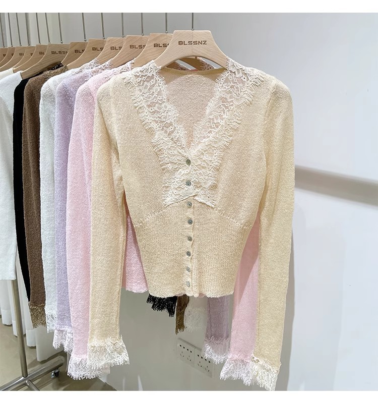 화이트 브이넥 레이스 디자인 밑단 셔츠, 봄, 가을 니트 가디건, 여성용 겨울용 젠틀 스웨터와 시크한 탑스토어 가기