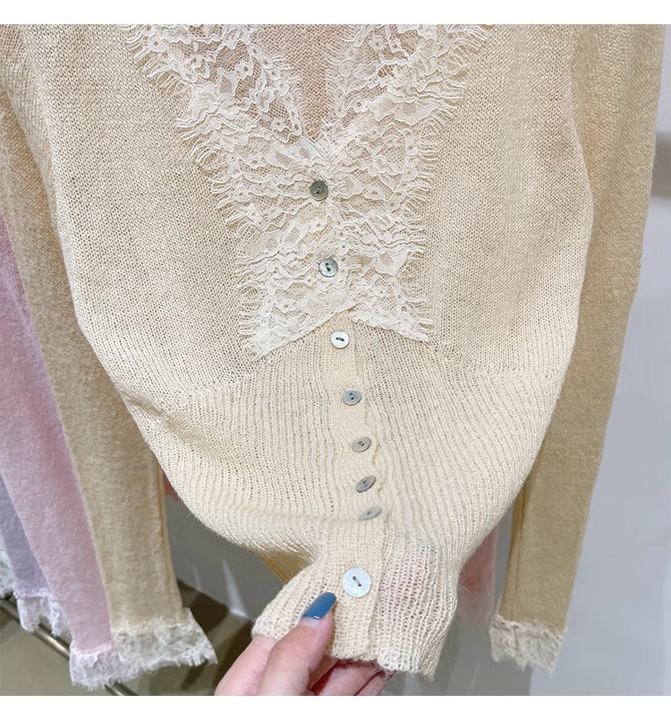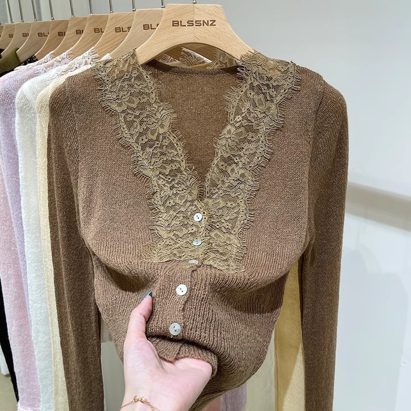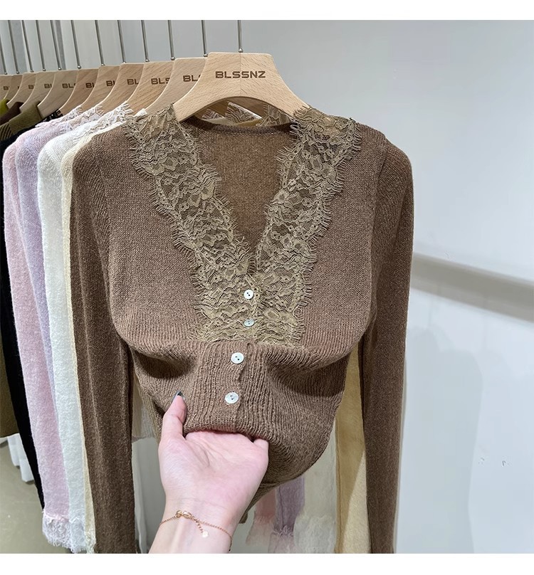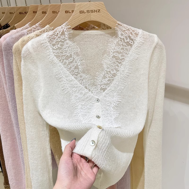 白色V领蕾丝设计感打底衫春秋针织开衫温柔毛衣内搭别致上衣女冬