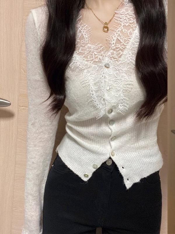 화이트 브이넥 레이스 디자인 밑단 셔츠, 봄, 가을 니트 가디건, 여성용 겨울용 젠틀 스웨터와 시크한 탑