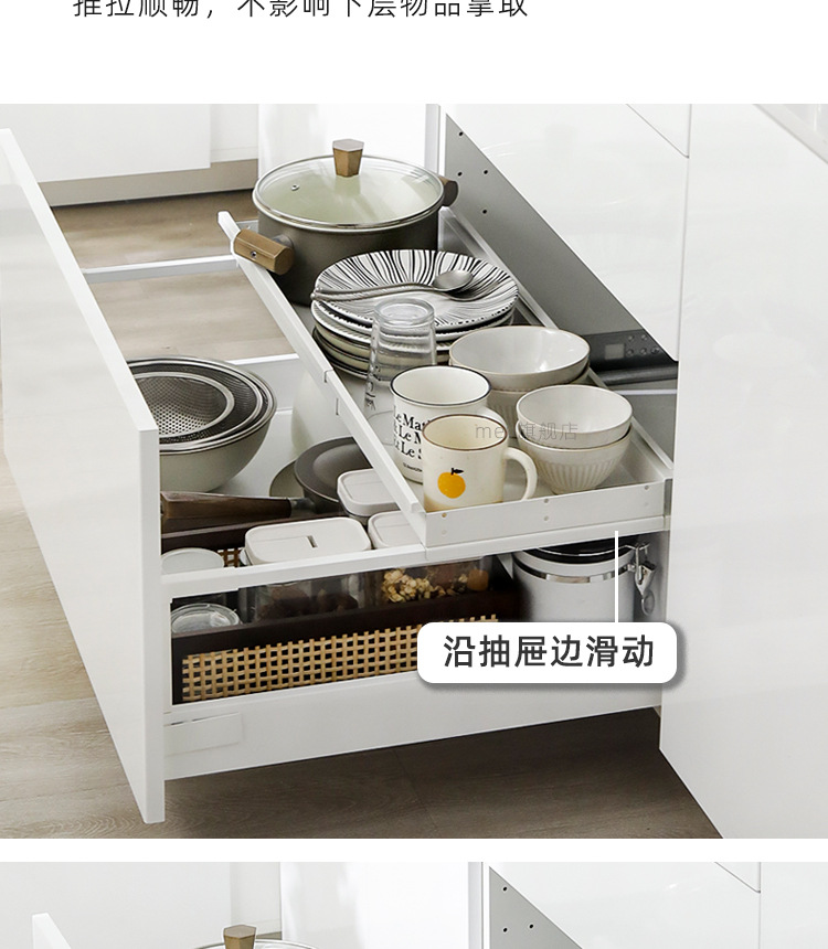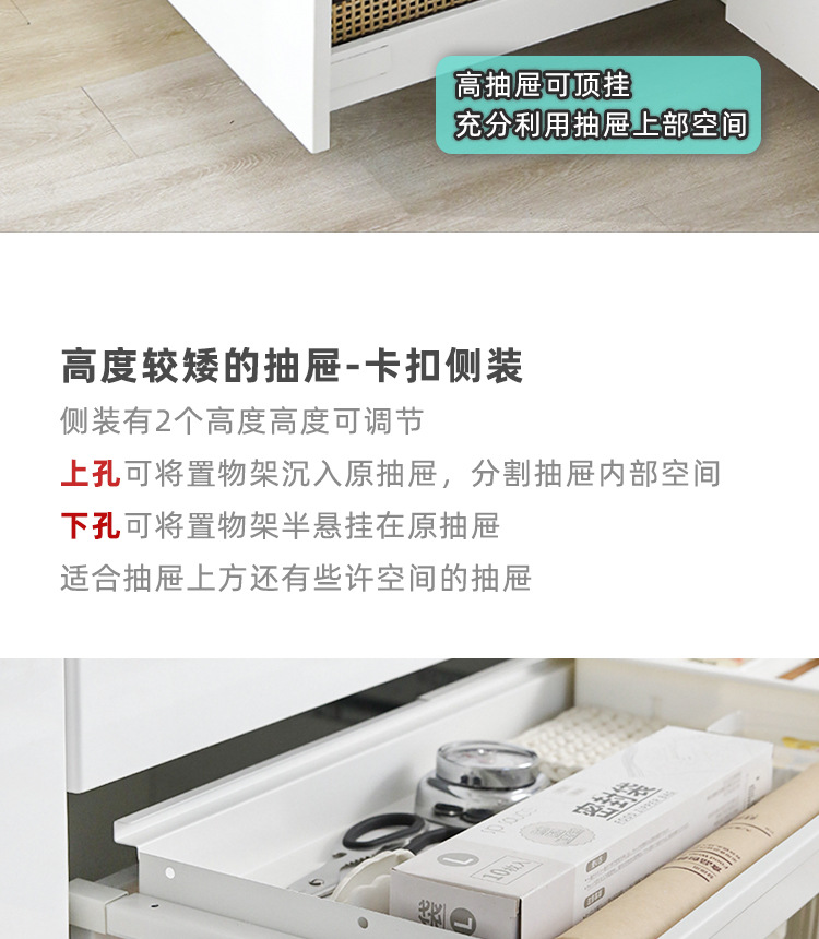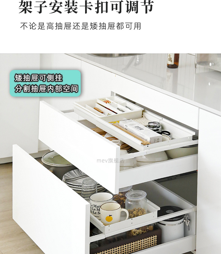 서랍형 레이어드 선반, 상하 레이어드 캐비닛, 내부 칸막이, 개폐식 풀아웃 바구니, 주방 도구 보관함, 얇은스토어 가기